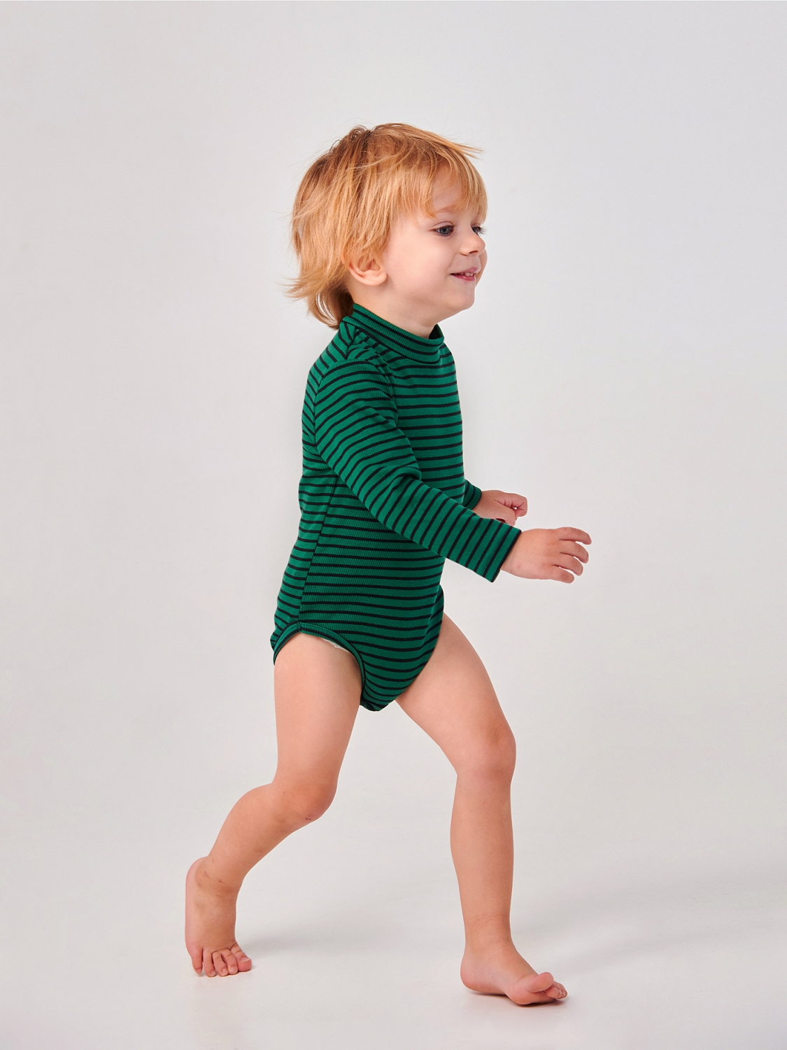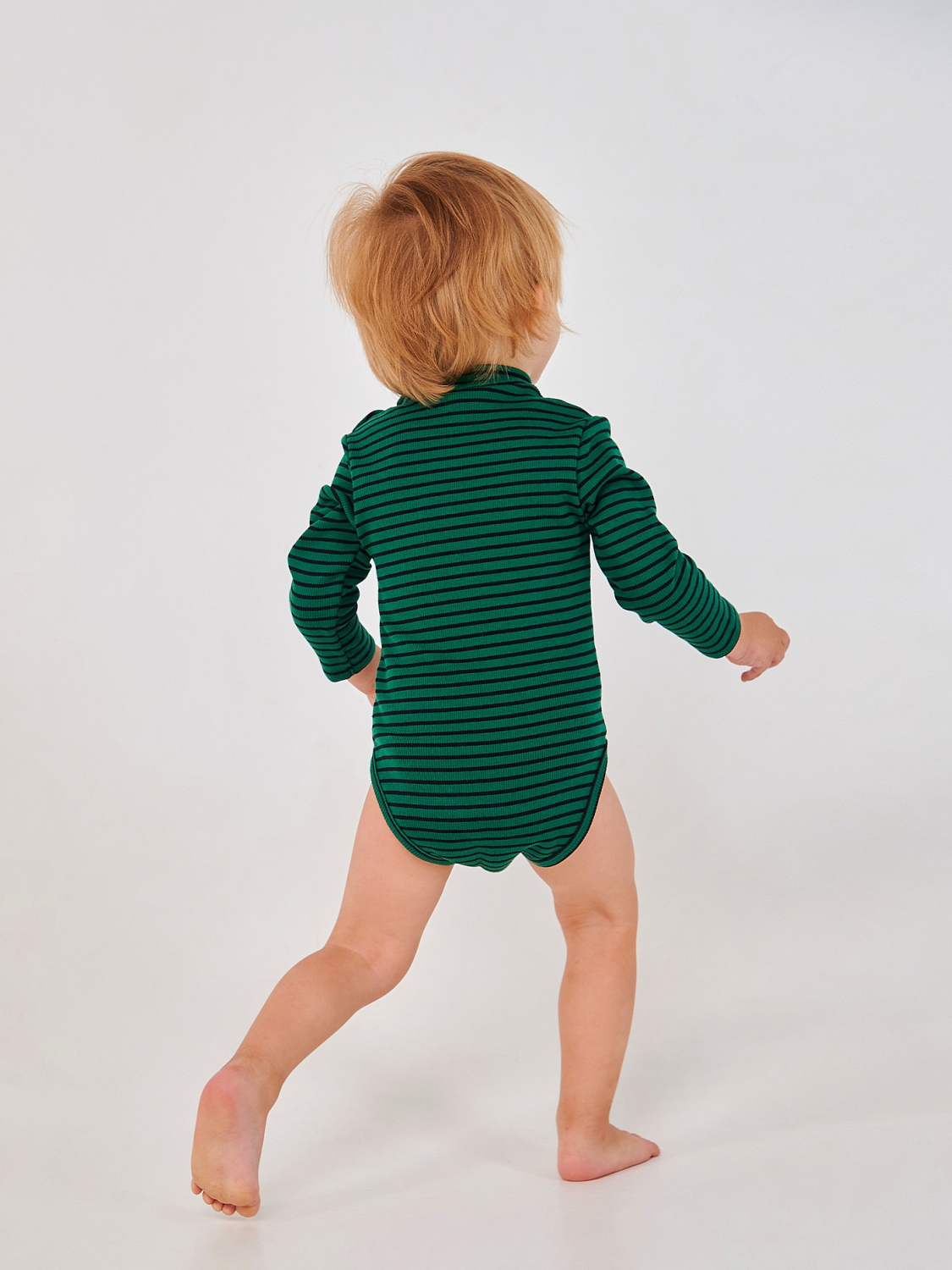 Боди-гольф в модном дизайне полоска на зеленом фоне станет идеальным дополнением к гардеробу вашего малыша, добавляя разнообразие и стильность в его наряды. Пошитый из высококачественного полотна кашкорс с начесом, он обеспечивает тепло, мягкость и защиту от холода. Дополнительную защиту добавит воротник, который прилегает к шее, не допуская переохлаждения горла, но при этом не доставляет дискомфорта ребенку. Удобные кнопки на плечике и внизу позволяют легко и быстро переодевать и менять подгузник, облегчая вам заботу о малыше.