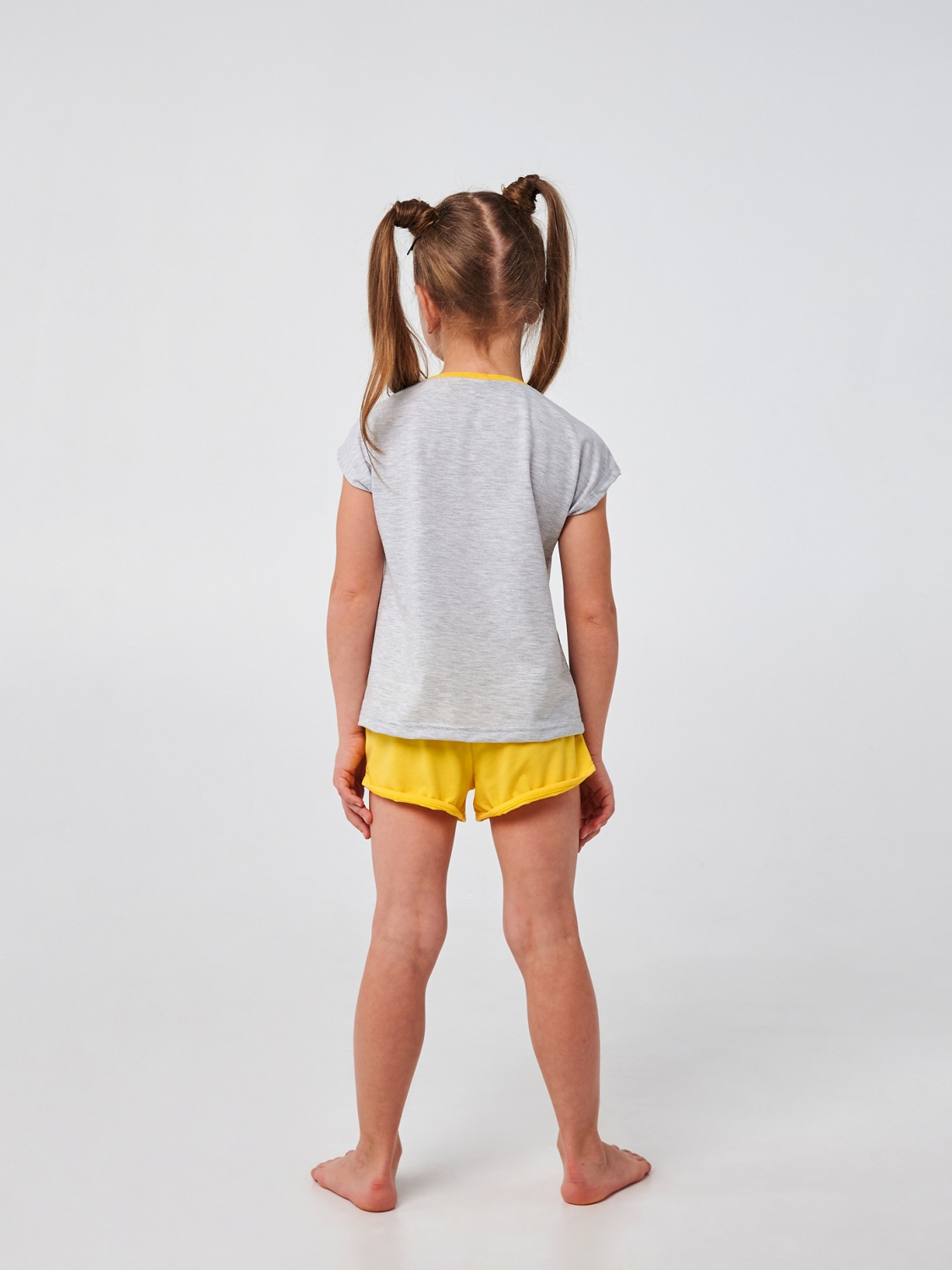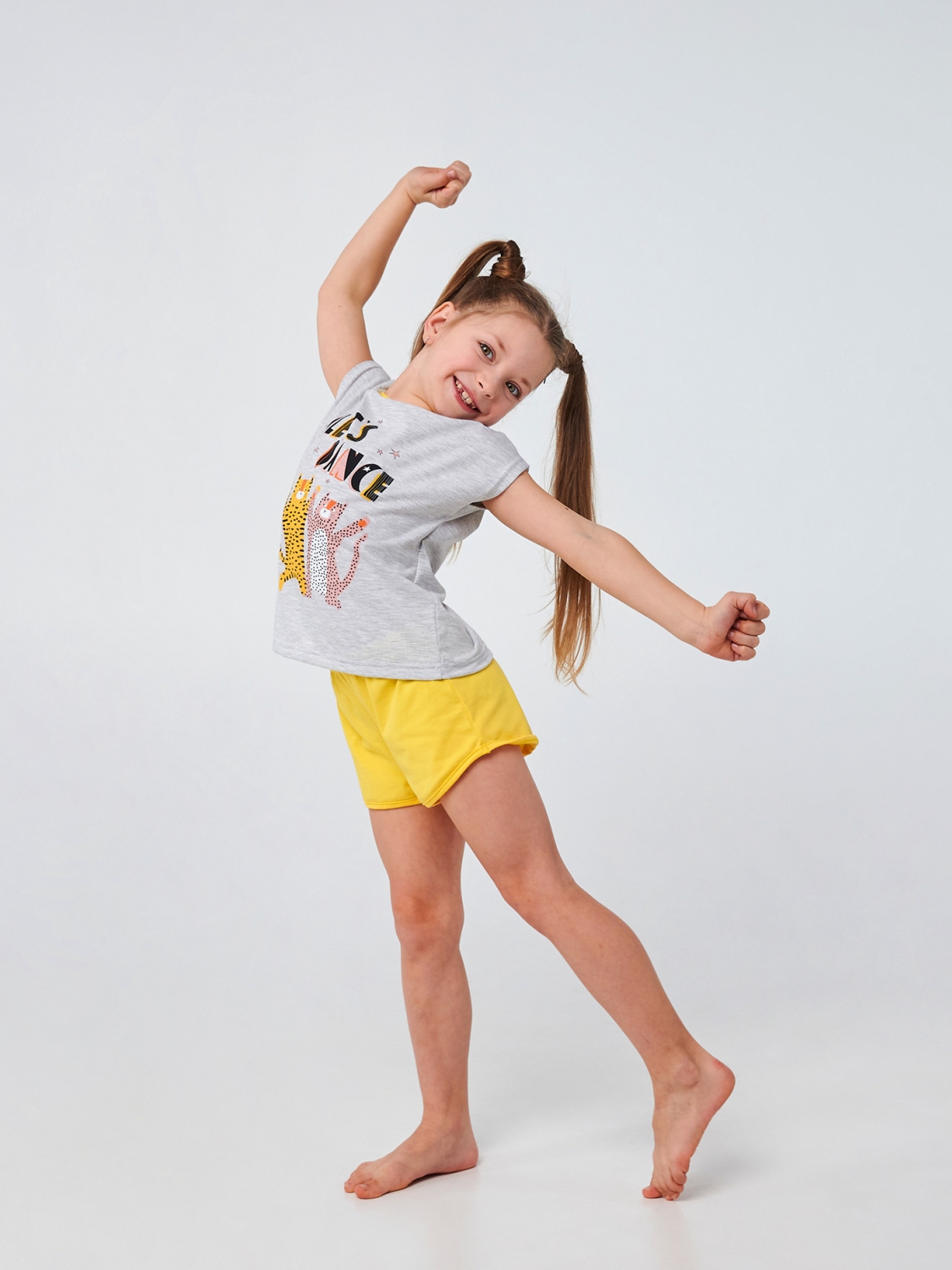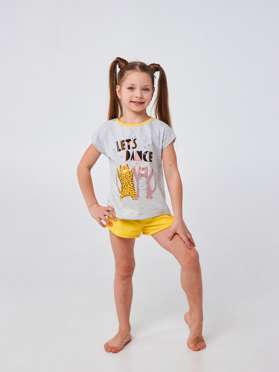 Шорты и футболка в уникальном сочетании цветов - серый меланж и яркий желтый - создают веселый и стильный образ вашей маленькой модницы. Прямая печать танцующих тигрят и надпись 'Lets Dance' (давайте танцевать) приглашают к веселым и энергичным танцам, создавая атмосферу веселья и радости. Пошитая из мягкого стрейчевого кулира, наша пижама обеспечит вашей девочке максимальный комфорт и свободу движения во время сна или игр.