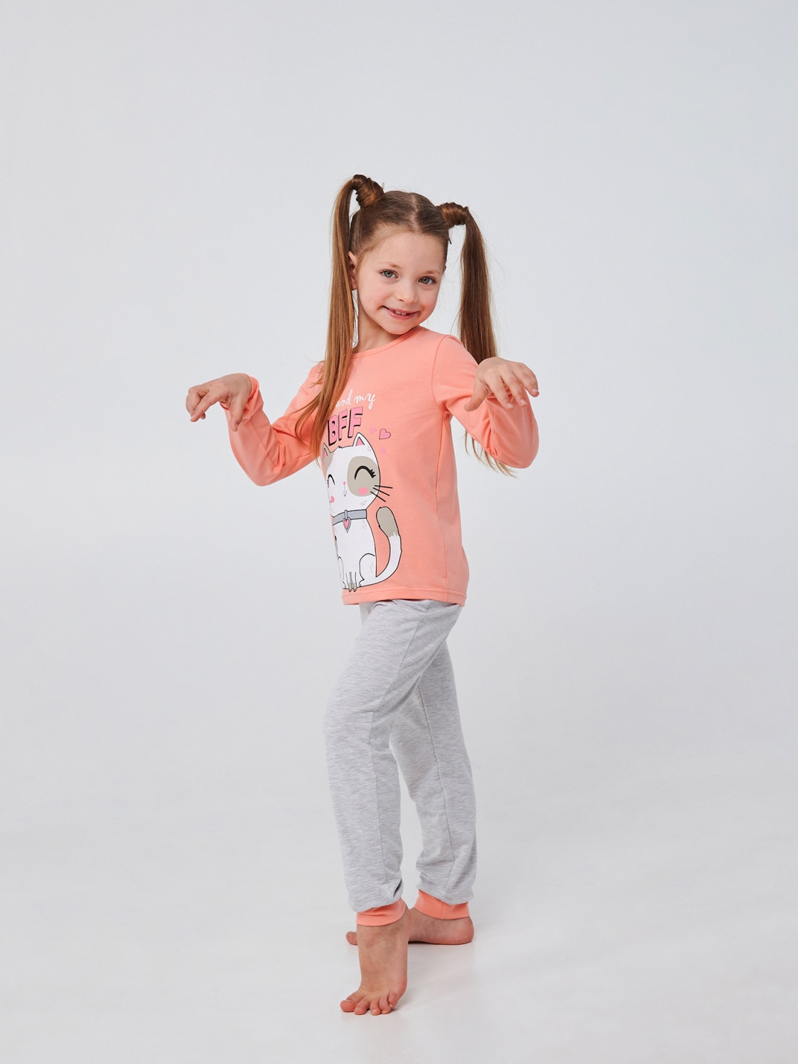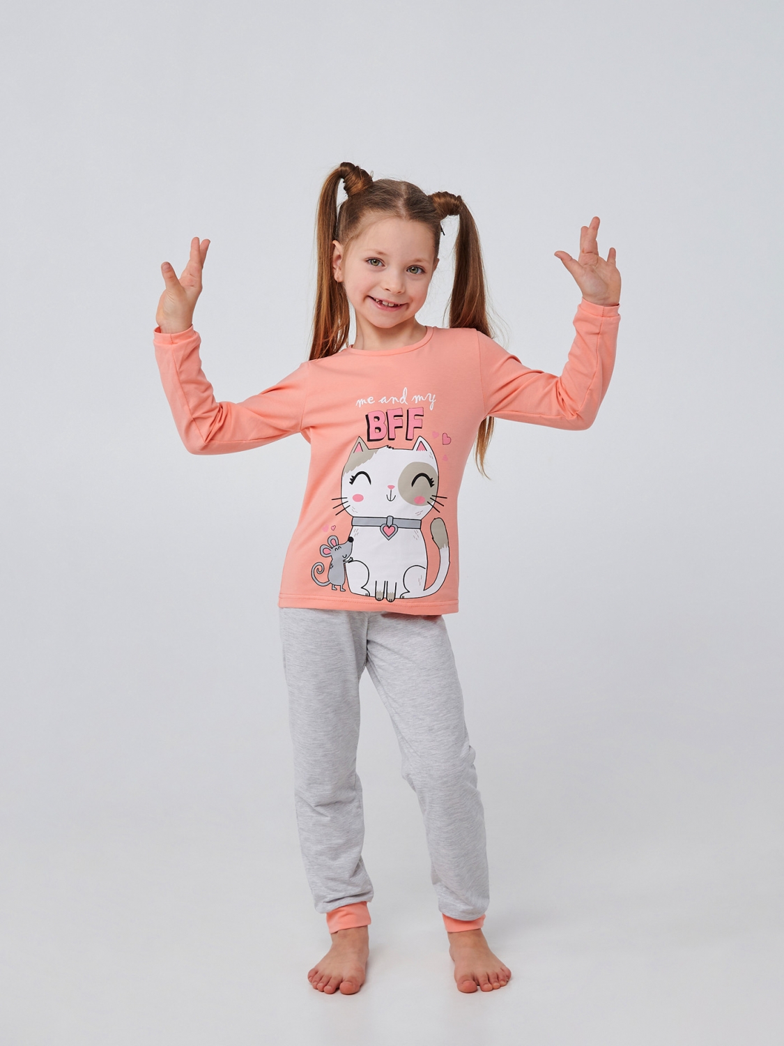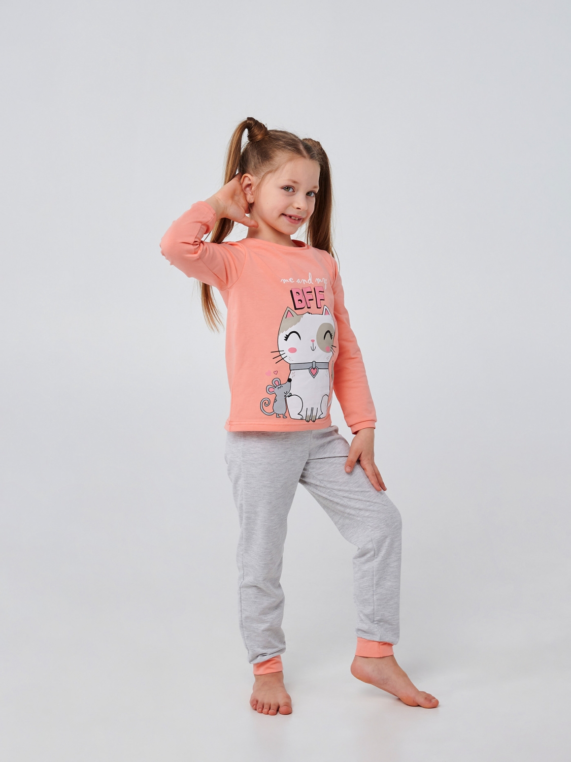 Серые штанишки и футболка в нежном оттенке кораллового станут любимым комплектом вашей маленькой модницы. Прямая печать милого котика и надпись 'Me and my BFF' (я и мой лучший друг) добавляют пижаме игривости и неповторимого шарма, призывая к веселым приключениям и нежным моментам. Пошитая из мягкого стрейчевого кулира, пижама обеспечит вашей малышке максимальный комфорт во время сна или домашних забав. Позвольте ей насладиться каждым моментом и каждой ночью в уютной и стильной пижаме!