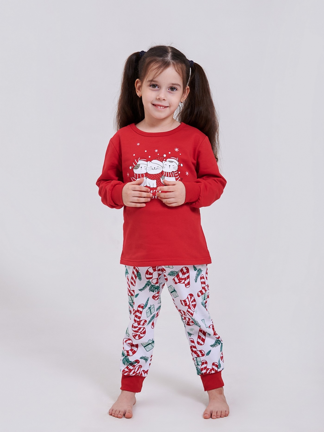 Красная пижама из теплого футера с начесом, украшена милыми котятами и праздничной надписью Marry Christmas. Приятное на ощупь полотно и яркий праздничный дизайн — идеальный выбор для уютных зимних вечеров и волшебных снов! Новогодняя пижама для девочки — волшебство и уют в каждой детали!