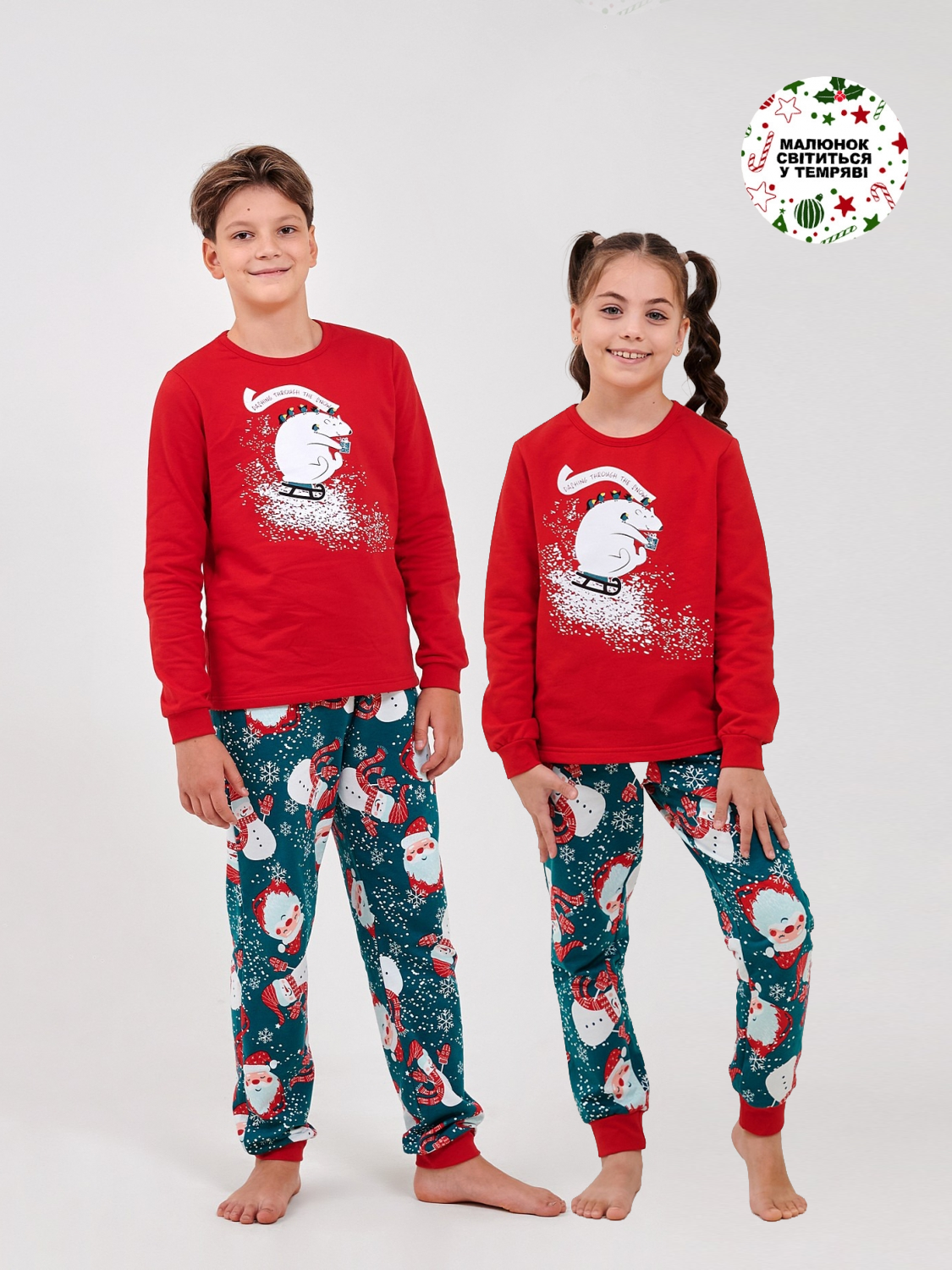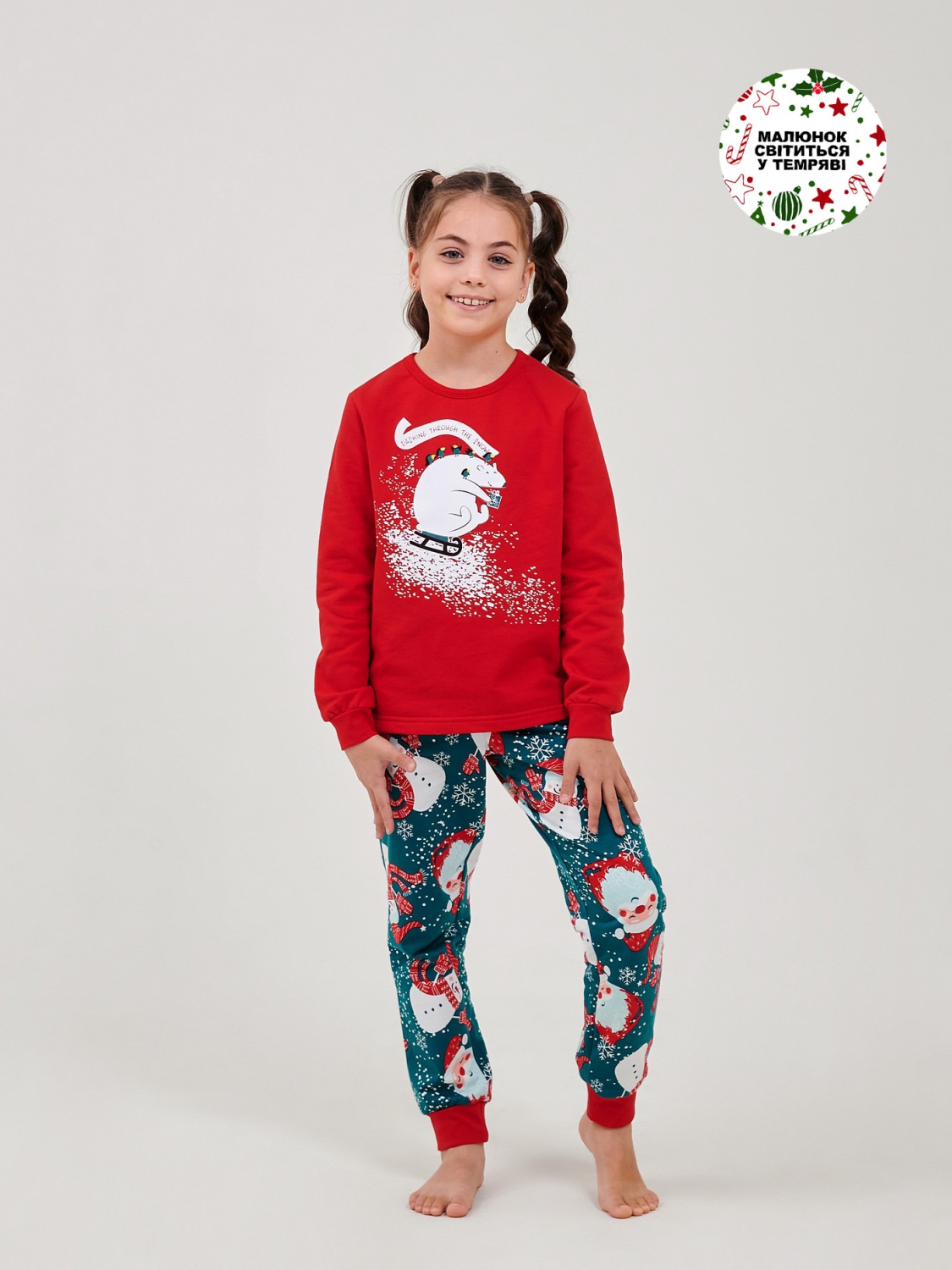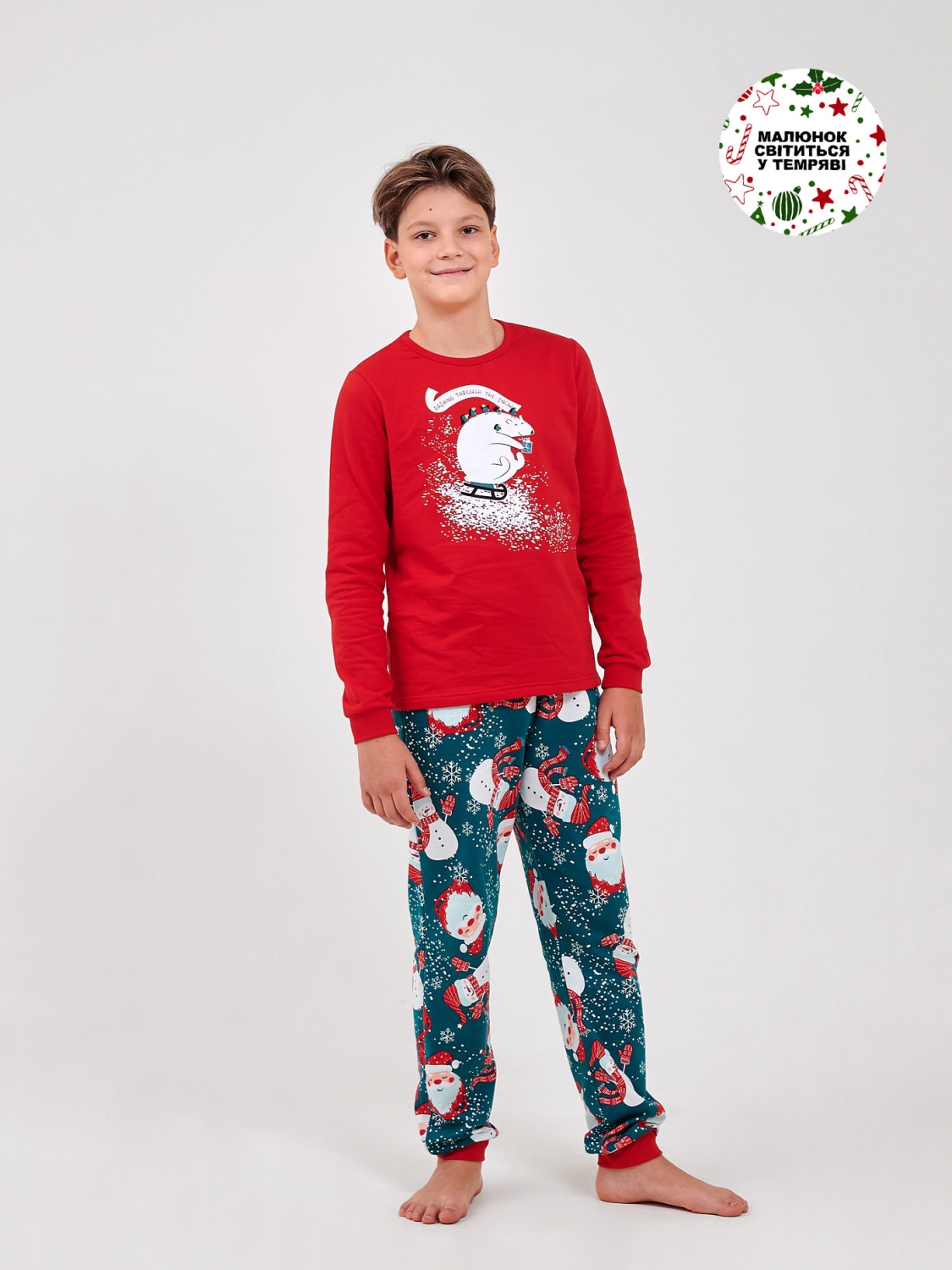 Эта уютная пижама из футера с начёсом подарит ребенку максимум комфорта и новогоднего настроения. Мягкое, тёплое полотно нежно согревает, а плотные манжеты держат форму и не дают рукавам сползать. Яркий новогодний принт и сияющий в темноте рисунок превращают каждый вечер в маленькое чудо. Идеальный вариант для зимних ночей, семейных фото и ожидания праздника!