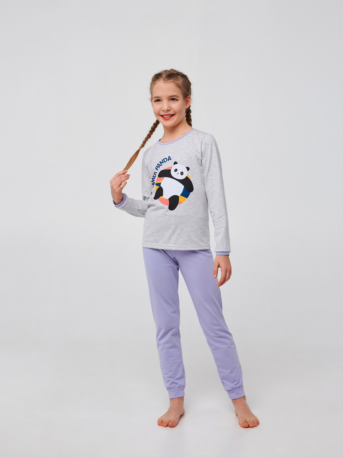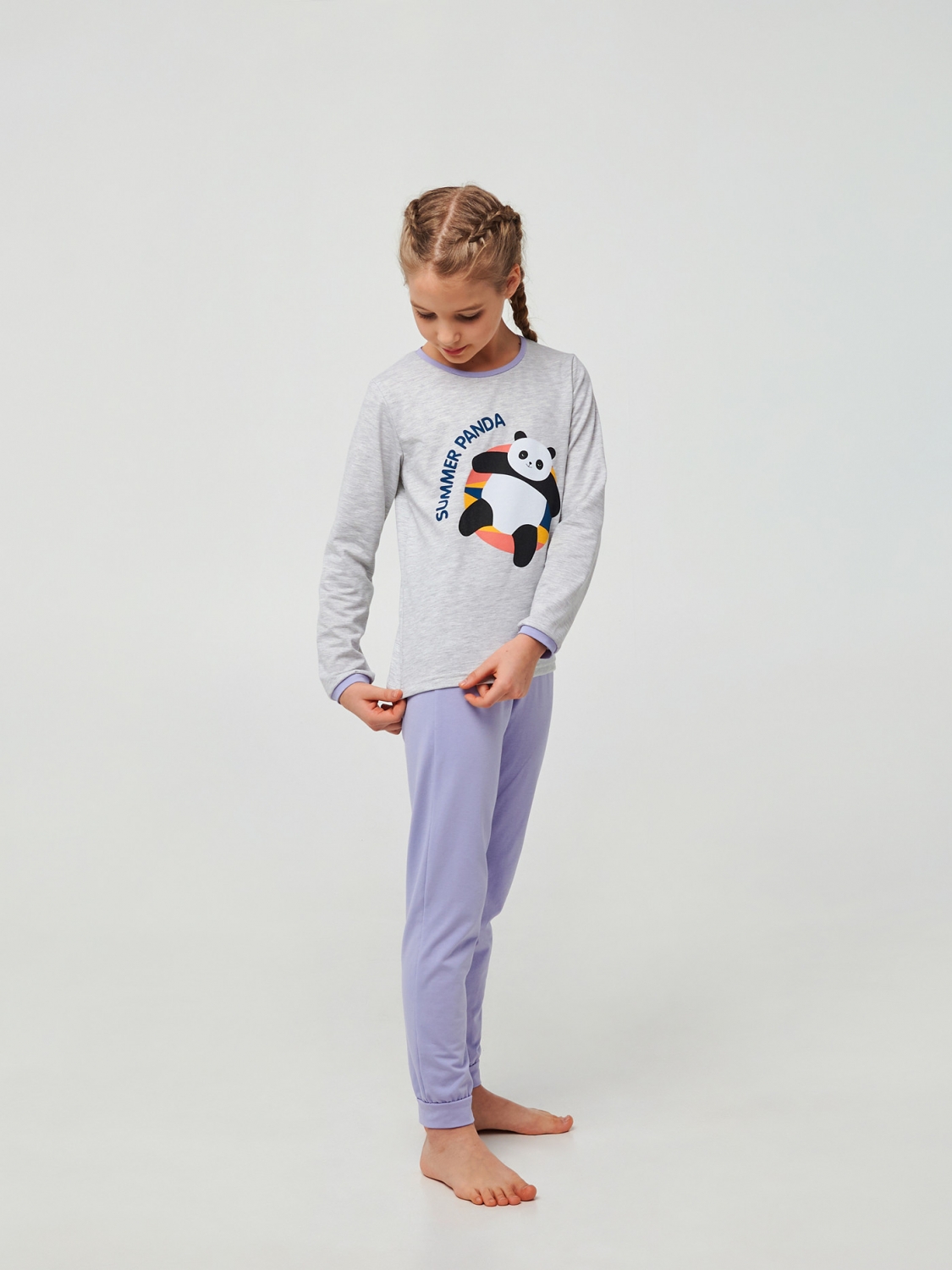 Кофта в универсальном цвете серый меланж в сочетании с нежным васильковым цветом штанов. Прямая печать панды на круге и надпись 'Summer Panda' придают пижаме стильный и веселый облик. Пошитая из мягкого стрейчевого кулира, пижама обеспечит вашей девочке комфорт и свободу движения во время сна или домашних дел.