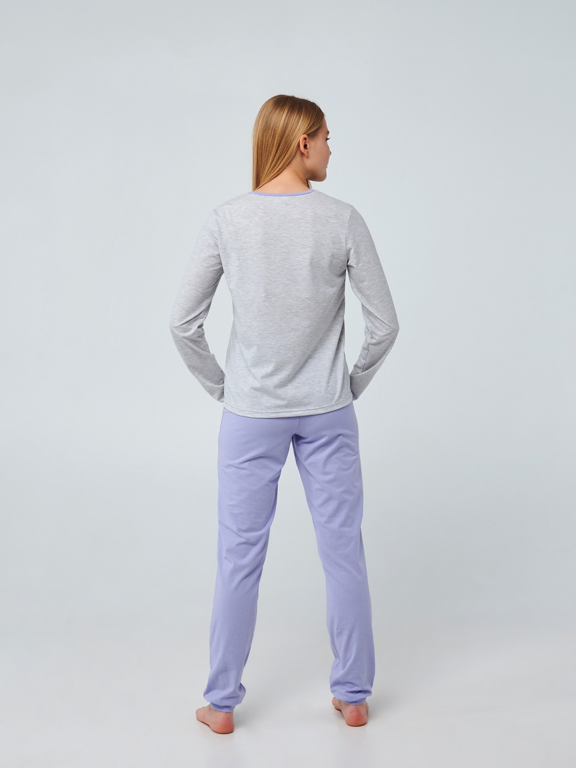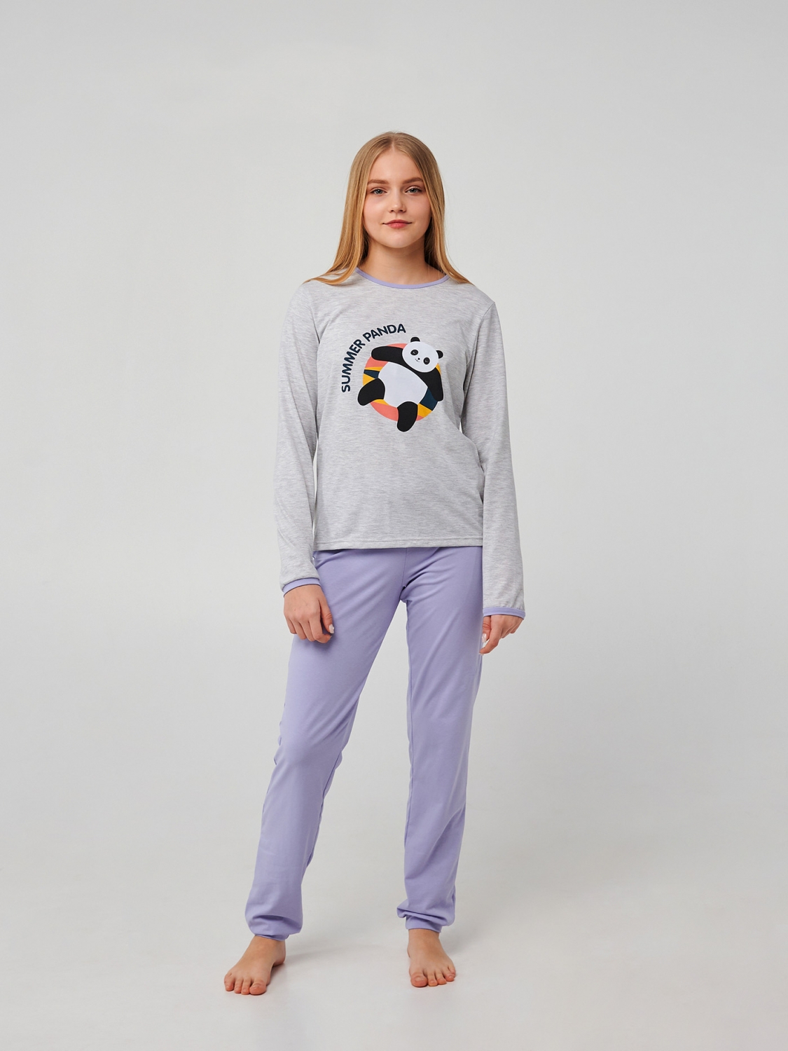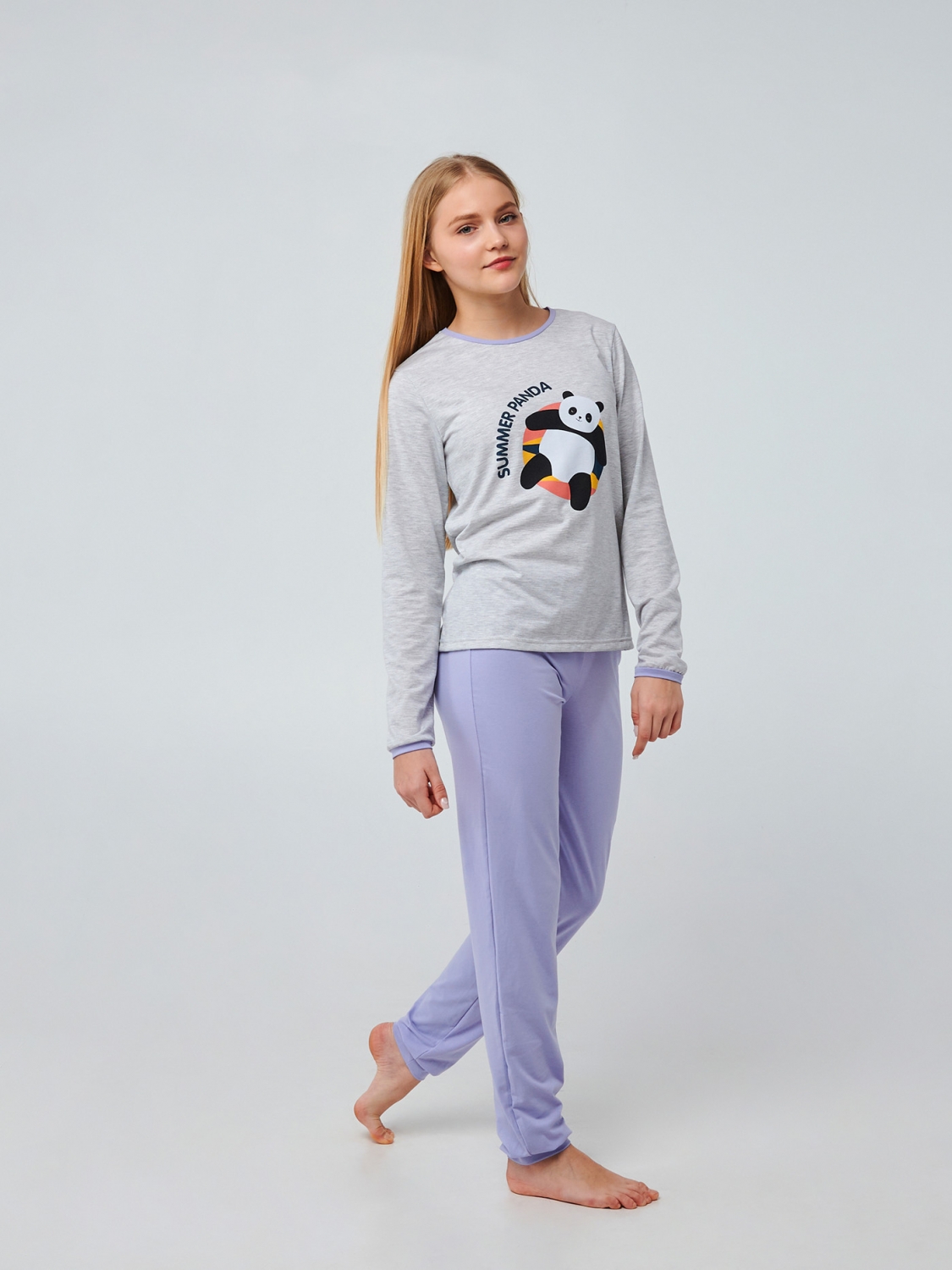 Кофта в универсальном цвете серый меланж в сочетании с нежным васильковым цветом штанов. Прямая печать панды на круге и надпись 'Summer Panda' придают пижаме стильный и веселый облик. Пошитая из мягкого стрейчевого кулира, пижама обеспечит вашей девочке комфорт и свободу движения во время сна или домашних дел.