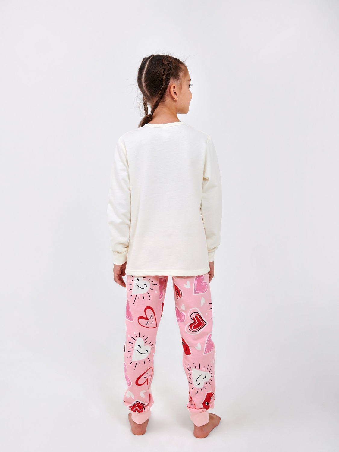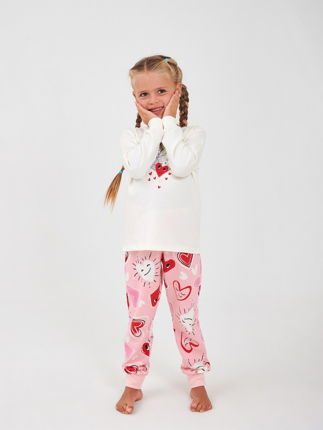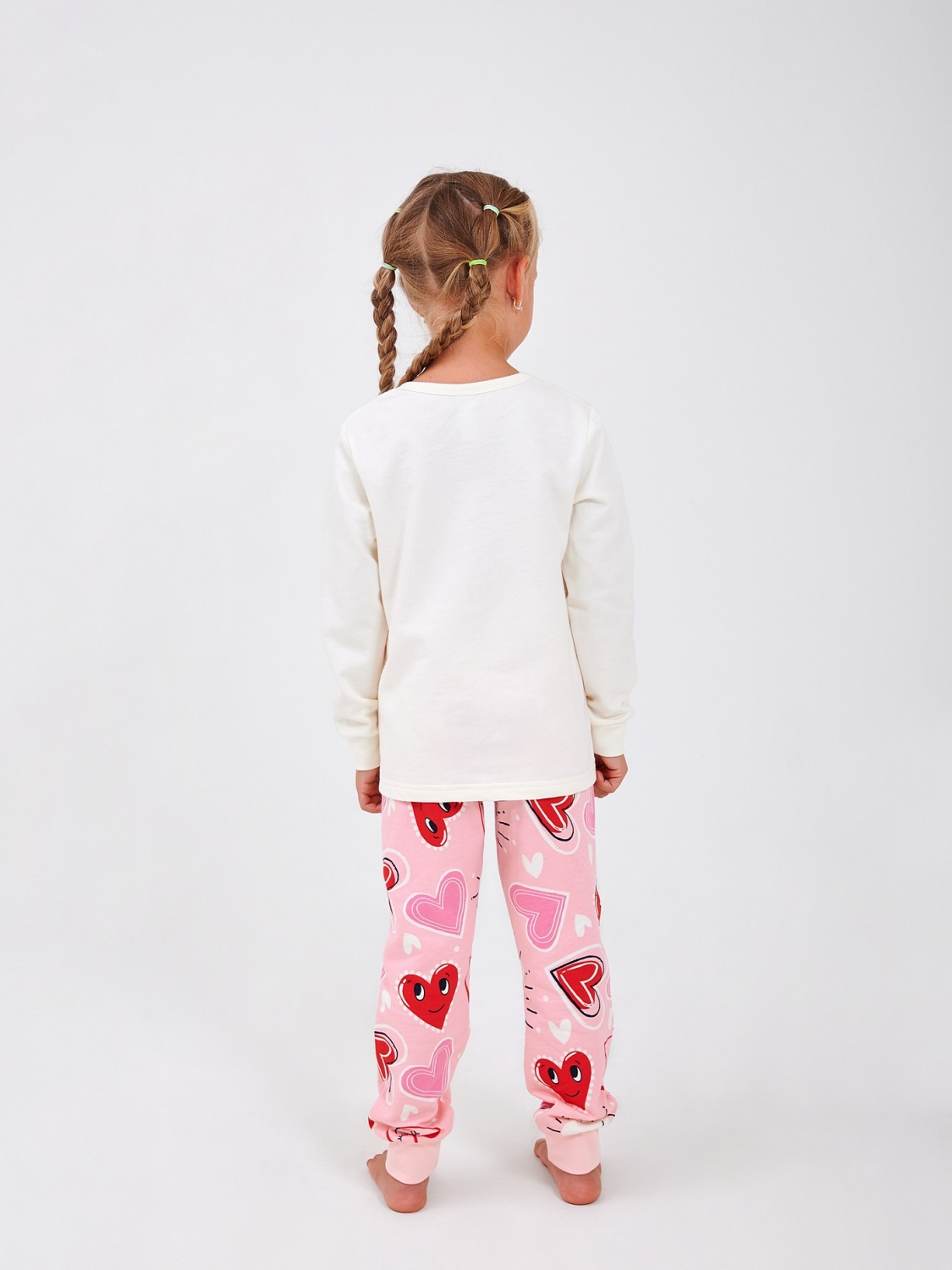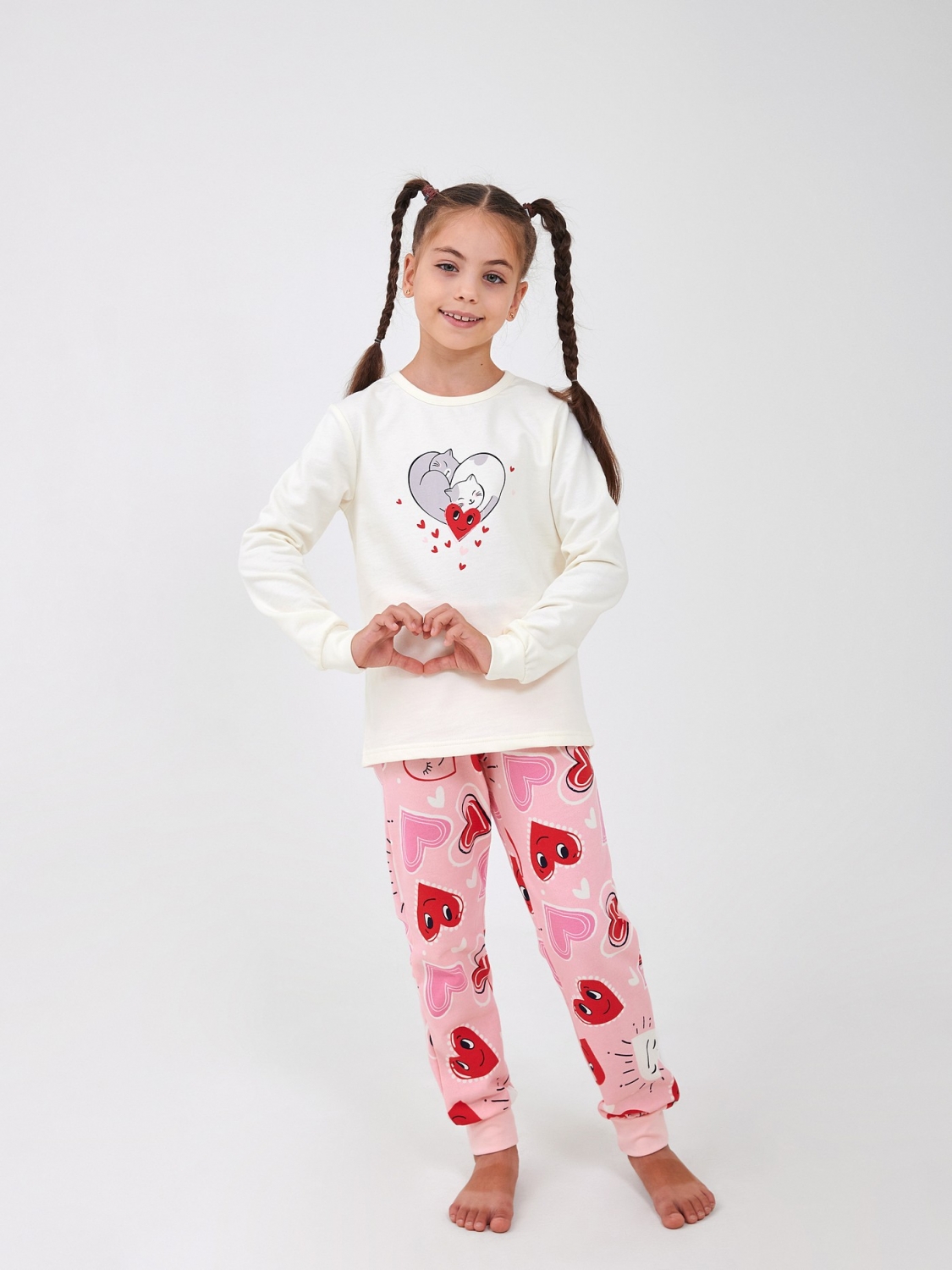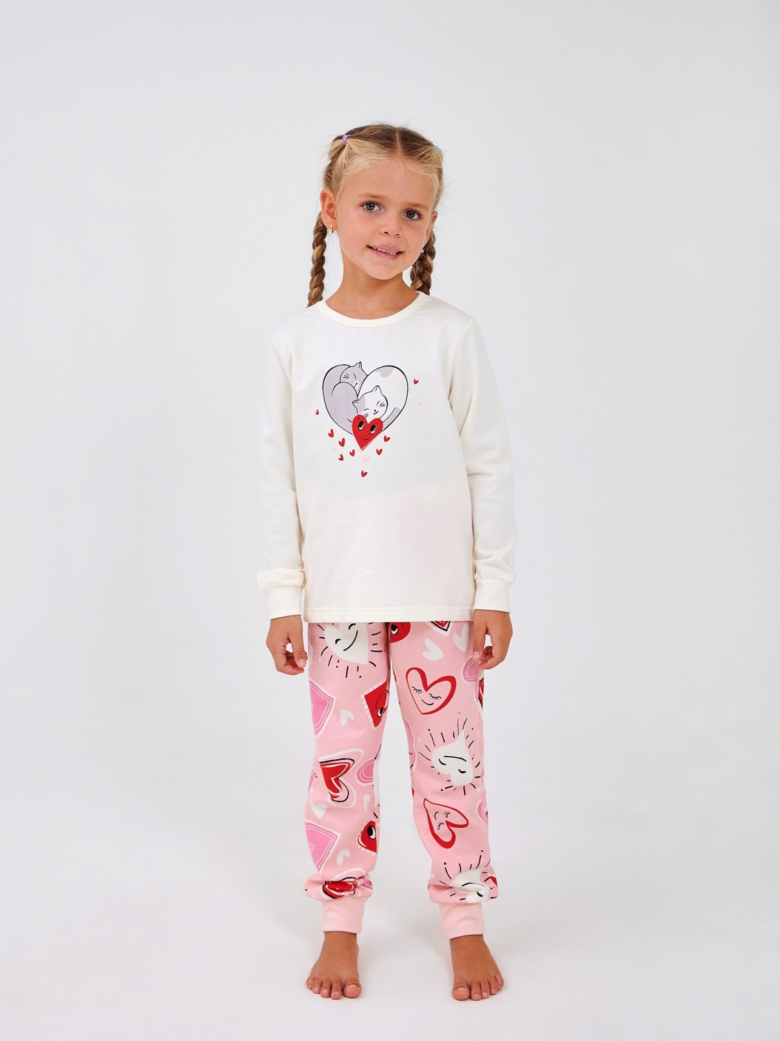 Уютная детская пижама из футера с начёсом — идеальный выбор для прохладных вечеров и сладких снов. Мягкое полотно бережно согревает и дарит комфорт, а забавный принт с милыми сердечками создаёт настроение нежности и радости. Манжеты на рукавах и брючках обеспечивают удобную посадку и тепло всю ночь.