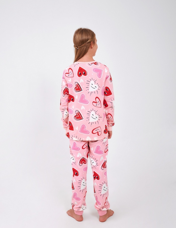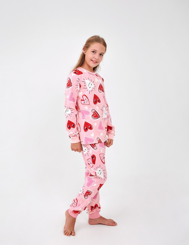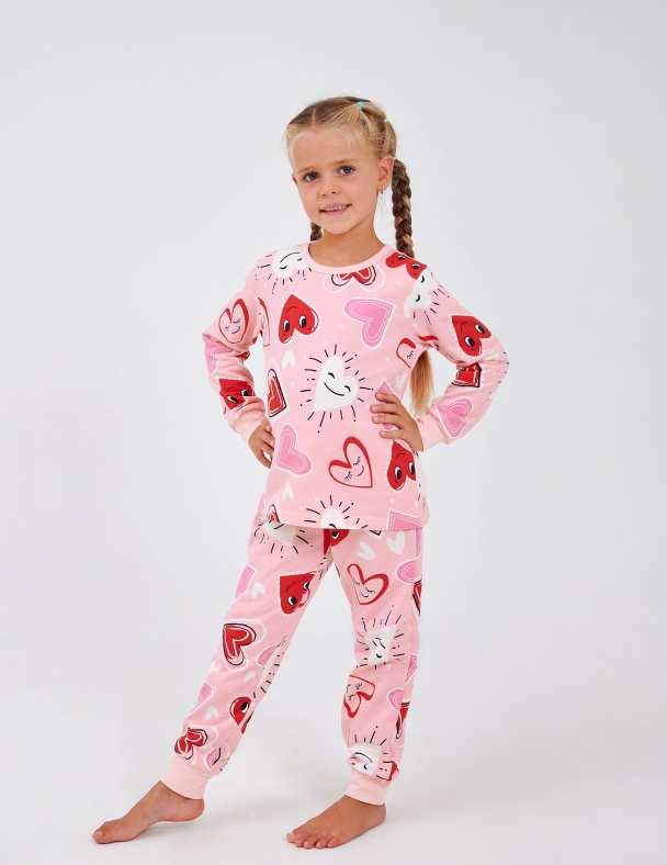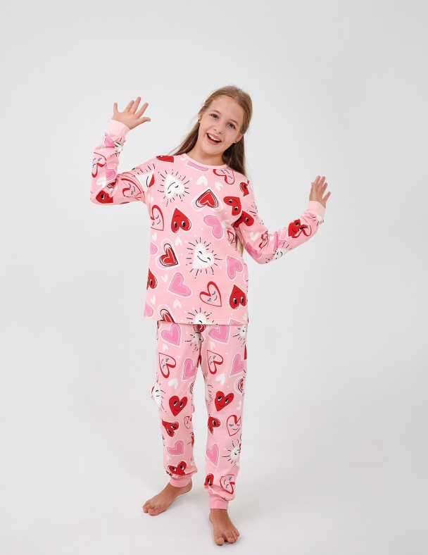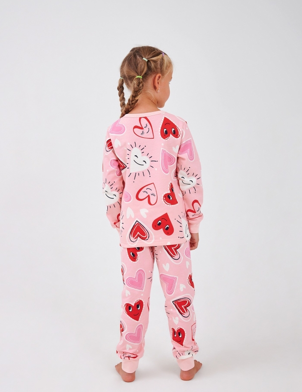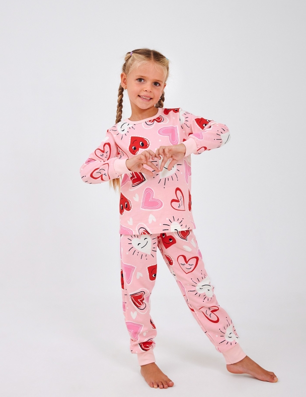 Уютная детская пижама из футера с начёсом — идеальный выбор для прохладных вечеров и сладких снов. Мягкое полотно бережно согревает и дарит комфорт, а забавный принт с милыми сердечками создаёт настроение нежности и радости. Манжеты на рукавах и брючках обеспечивают удобную посадку и тепло всю ночь.