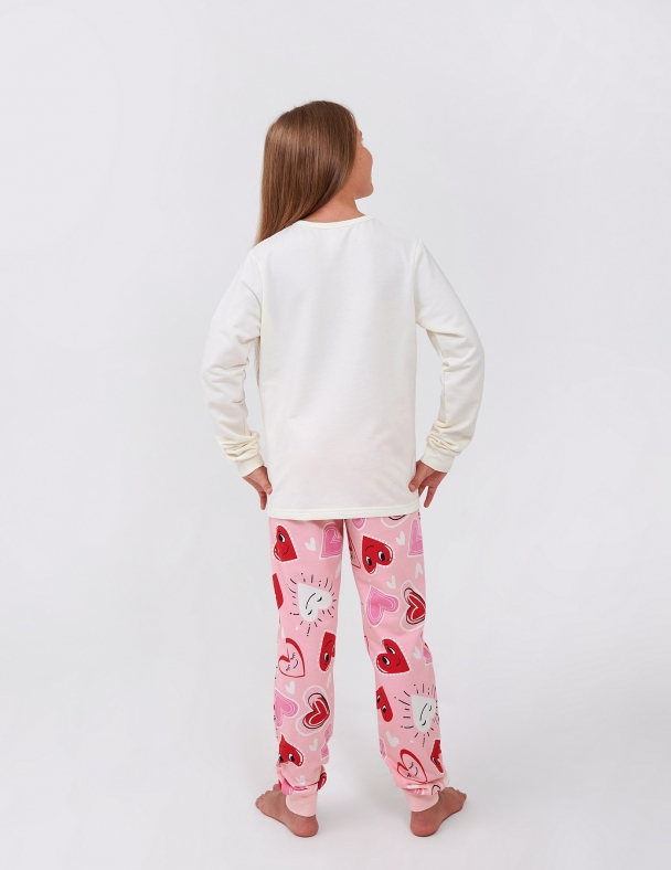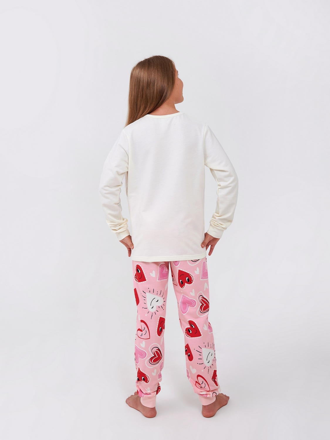 Уютная детская пижама из футера с начёсом — идеальный выбор для прохладных вечеров и сладких снов. Мягкое полотно бережно согревает и дарит комфорт, а забавный принт с милыми сердечками создаёт настроение нежности и радости. Манжеты на рукавах и брючках обеспечивают удобную посадку и тепло всю ночь.