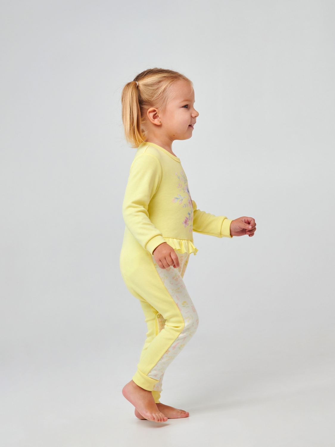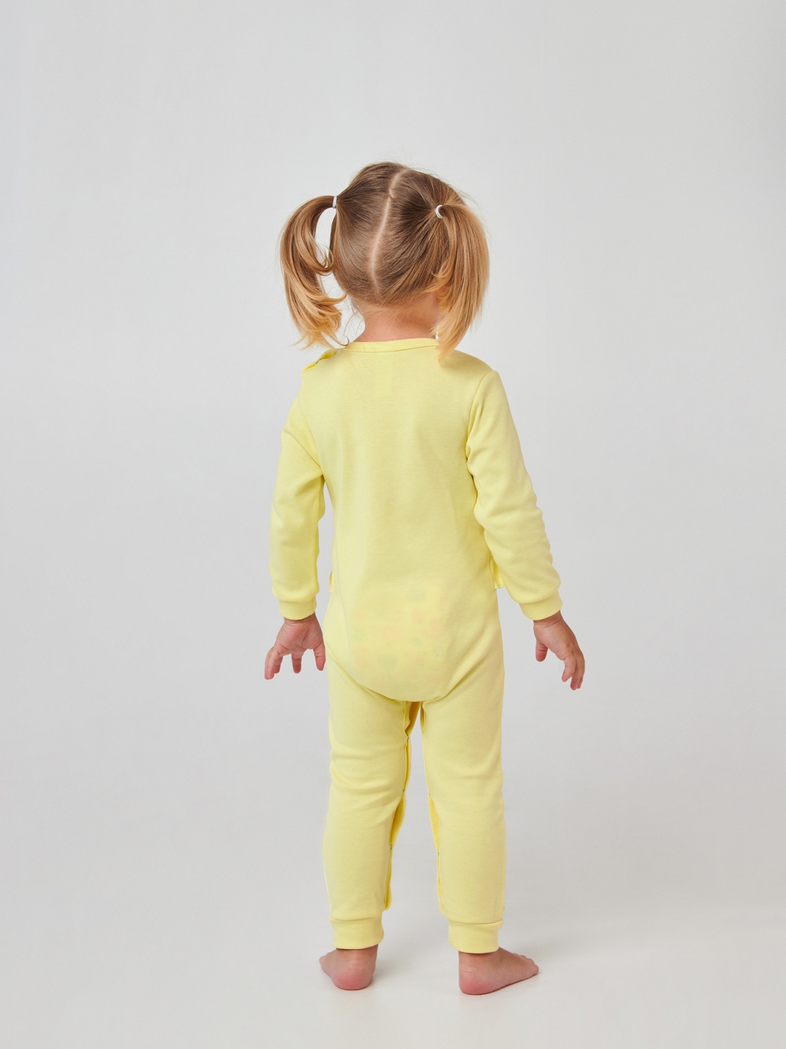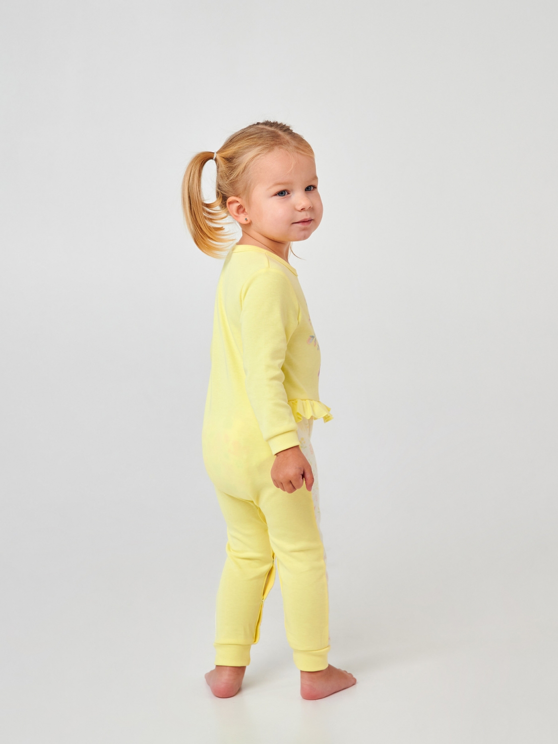 Погрузитесь в весеннюю атмосферу с нашим комбинезоном, сочетающим в себе нежный желтый оттенок и прекрасный рисунок весенних цветов. Прямая печать весенних цветов добавит вашей девочке радости и тепла. Каждый цветок — как лучик солнца, создающий атмосферу весеннего волшебства. Украшенный рюшей перед придает комбинезону нотки нежности и легкости. Манжеты на ручках и ножках обеспечивают удобство и тепло. Мы используем только самые нежные материалы для кожи вашего малыша. Хлопковое полотно интерлок обеспечивает комфорт и позволяет коже дышать.