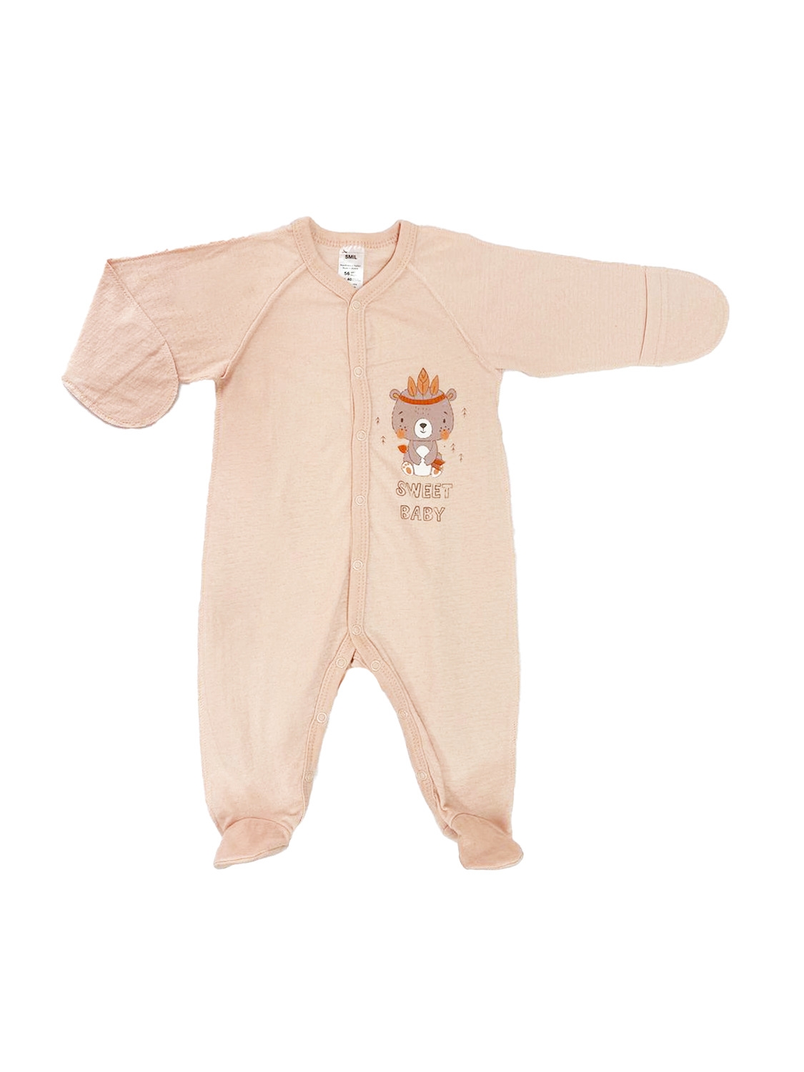 Подарите вашему малышу нежность и комфорт с нашим ванильным комбинезоном! Гипоаллергенное хлопковое полотно ажурный кулир делает его идеальным выбором для чувствительной кожи новорождённого. Прямая печать забавного мишки-индейца и надпись 'Sweet Baby' добавляют этому комбинезону неповторимый шарм и уют. Удобные кнопки облегчают переодевание, делая его приятным и быстрым процессом. Наружные швы и закрытые ручки предотвращают раздражения, обеспечивая малышу максимальный комфорт в течение всего дня.