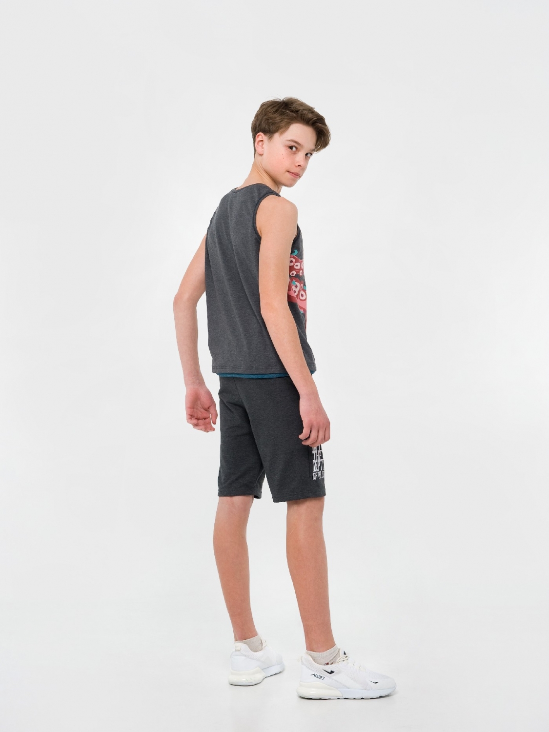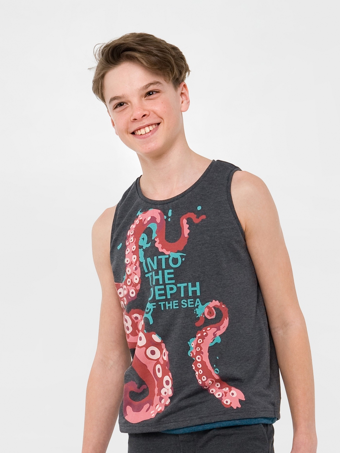 Стильная серая майка – универсальный элемент гардероба, который подойдет всем мальчикам в возрасте от 7 до 16 лет. Это изделие пошито из прочного стрейчевого кулира, который не препятствует воздухообмену. Главной особенностью майки можно считать крупный принт в виде щупалец осьминога и большой тематической надписи голубого цвета. Изделие можно сочетать с шортами, спортивными штанами и бриджами.