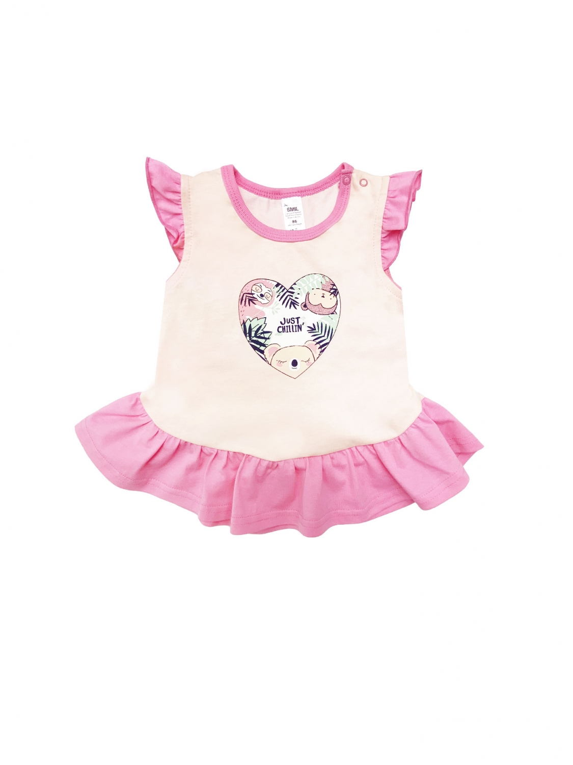 Милая маечка малинового оттенка дополнит гардероб девочек в возрасте от 6 до 18 месяцев. Для пошива использовался хлопковый материал – кулир, который приятно ощущается на теле. Данная модель будет хорошо смотреться с шортиками и легкими штанишками. Майка украшена принтом в виде небольшого сердечка с коалами, а также рюшами. На плече есть несколько кнопок, что значительно упрощает процесс одевания.