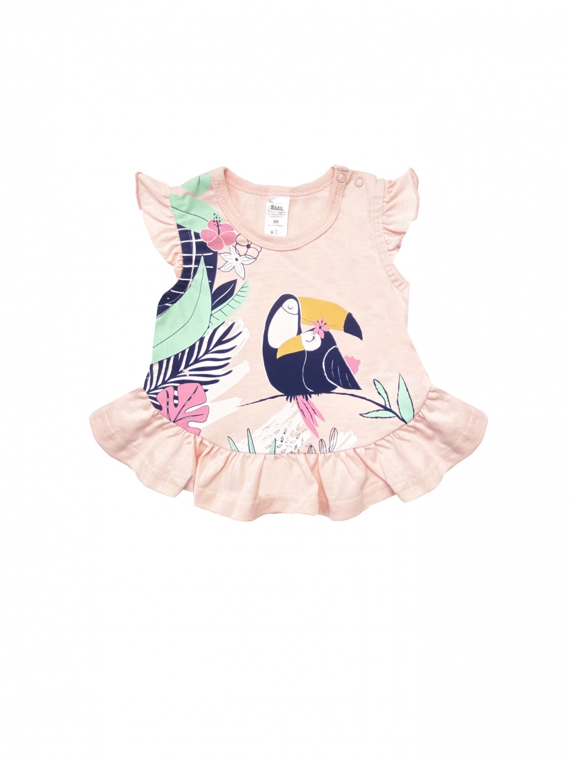 Стильная маечка персикового оттенка подойдет малышкам в возрасте 6-18 месяцев. Для пошива использовался гипоаллергенный хлопковый материал – кулир. Это изделие отлично сочетается с шортиками, лосинами и легкими штанишками. Главная изюминка – это крупный принт в виде милых птичек. На рукавах и по краю изделия есть рюши. Застегивается майка на несколько кнопок, расположенных на плече. Изделие подойдет для прогулок