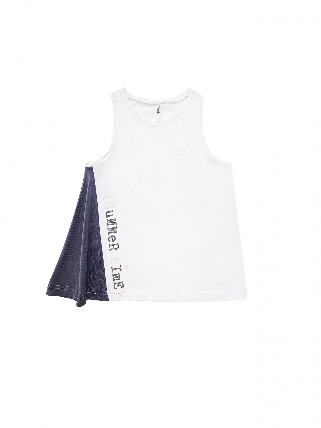 Майка белого цвета с принтованной надписью свободного кроя рассчитана на ежедневную носку в летний период. Данная модель подойдет всем девочкам в возрасте от двух до шести лет. Для пошива использовался качественный, приятный к телу стрейчевый кулир. Эта ткань не препятствует воздухообмену, быстро впитывает влагу. Лучше всего изделие сочетается с шортами, бриджами, юбками, лосинами и джинсами. Майку можно надевать на прогулки или спортивные занятия