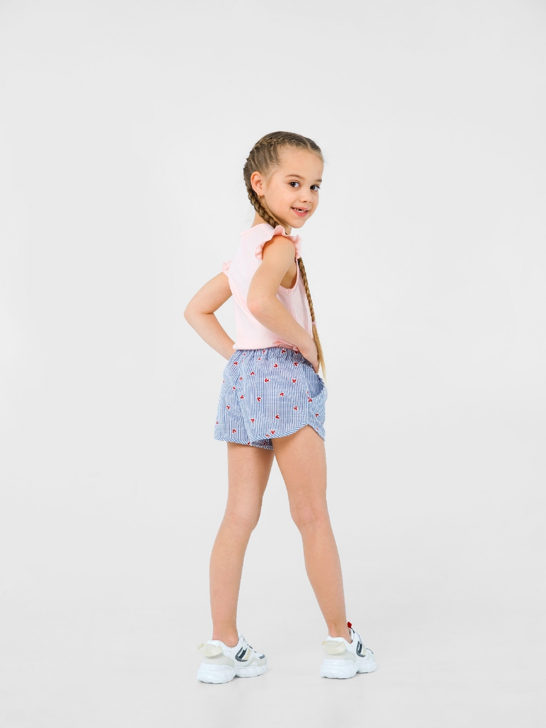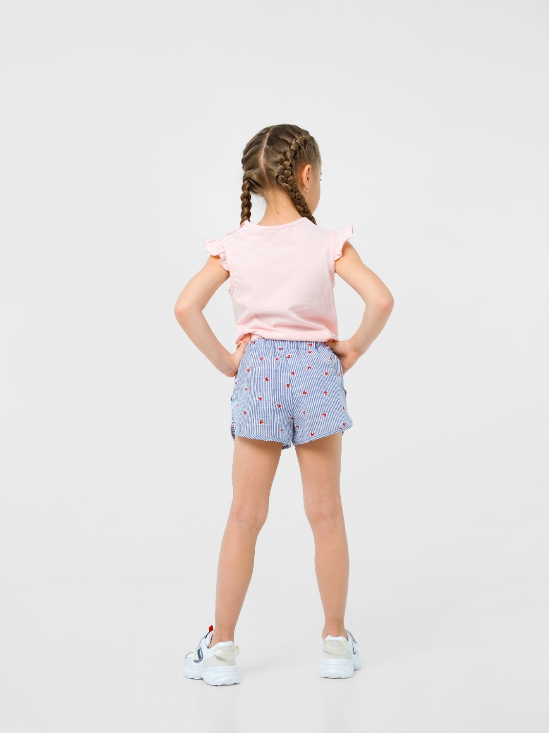 Легкая, стильная маечка для девочек в возрасте 6-18 месяцев. Этот топ будет хорошо смотреться с любой повседневной одеждой, например, шортиками или юбками. Для пошива изделия использовался мягкий, приятный на ощупь персиковый кулир, декорированный принтом в виде желтого солнышка и небольшой надписи. Майка также украшена рюшами, которые придают образу игривости
