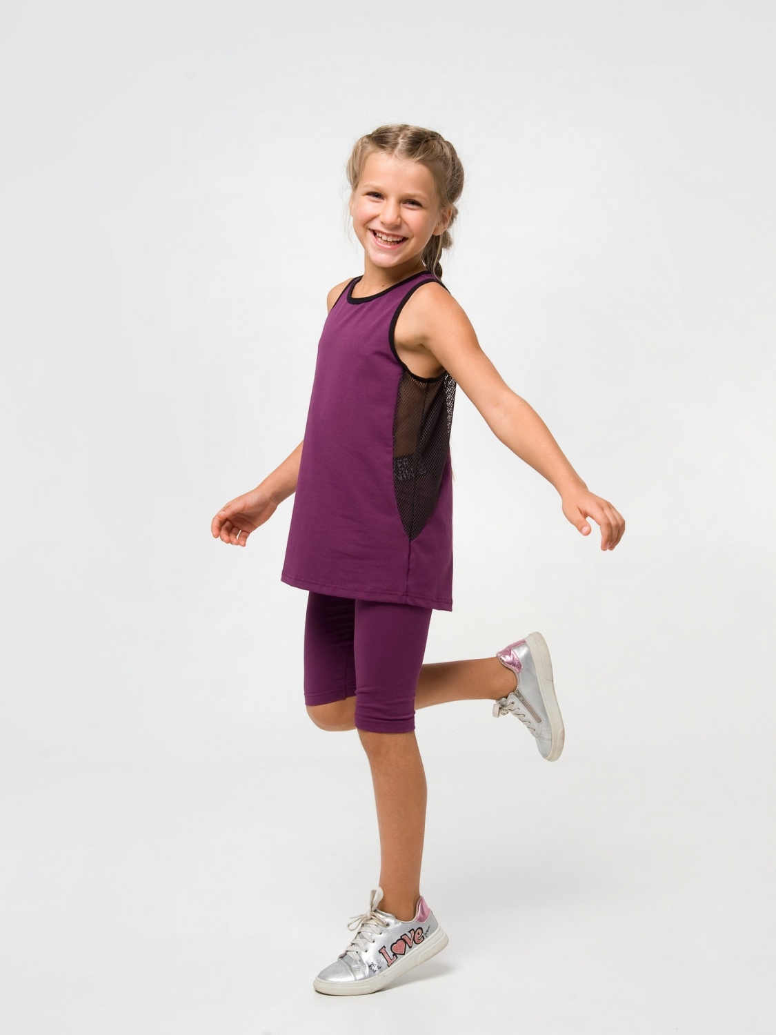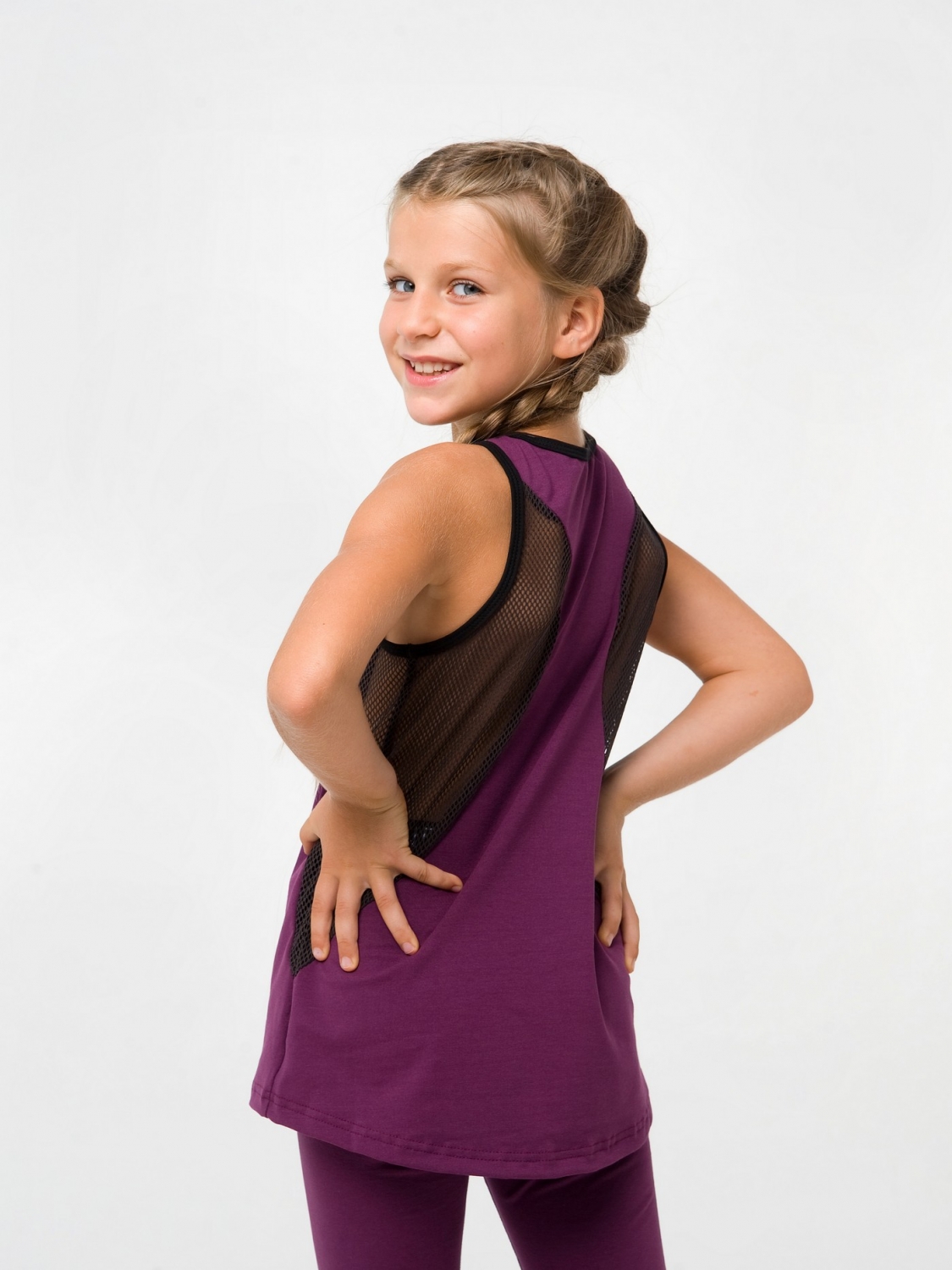 Бордовая футболка свободного кроя. Модель для девочки выполнена из стрейчевого кулира. Спинка отделана сеткой. Удлиненная майка хорошо сочетается с леггинсами, шортами, спортивными брюками. Ее можно надеть на прогулку, тренировку, урок физкультуры.