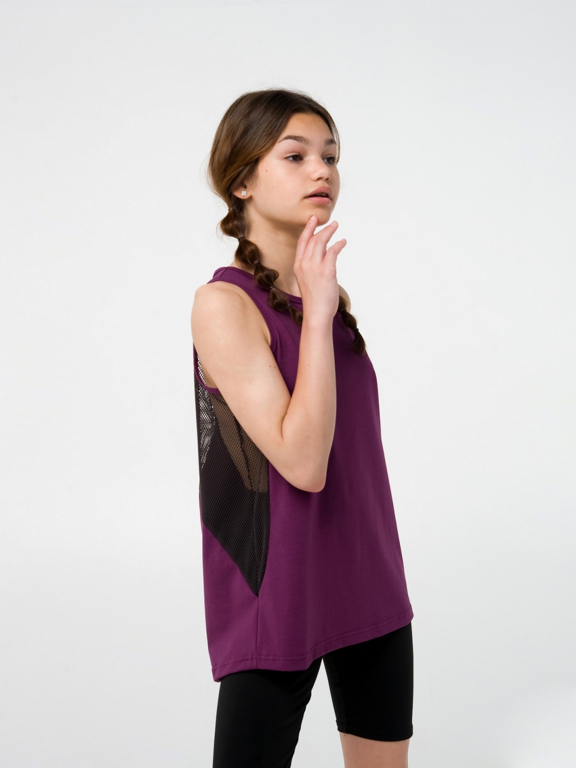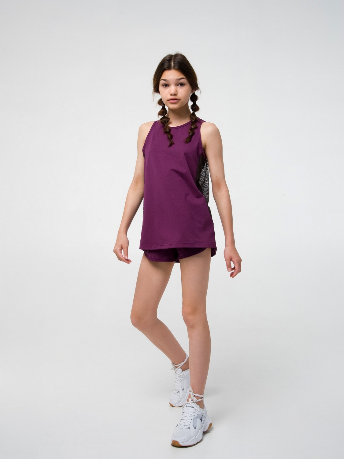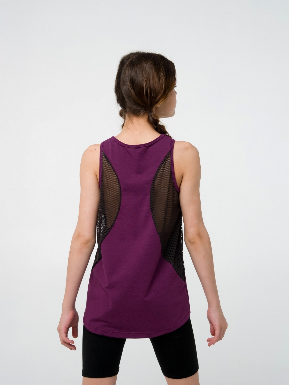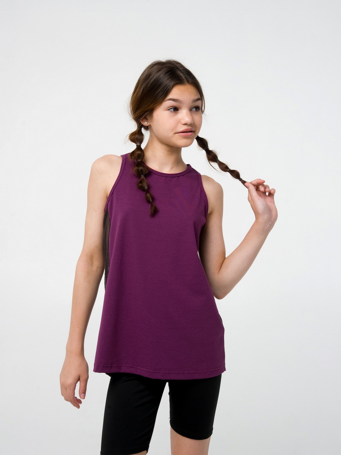 Бордовая майка – изделие, которое девочка сможет надевать на физкультуру или носить на природе. Для пошива использовался плотный стрейчевый кулир. Эта ткань хорошо пропускает воздух и дает коже дышать. Майка свободного кроя украшена вставками из черной сетки, которые обеспечивают дополнительную «вентиляцию». Данная модель будет хорошо смотреться с лосинами, шортами и штанами.