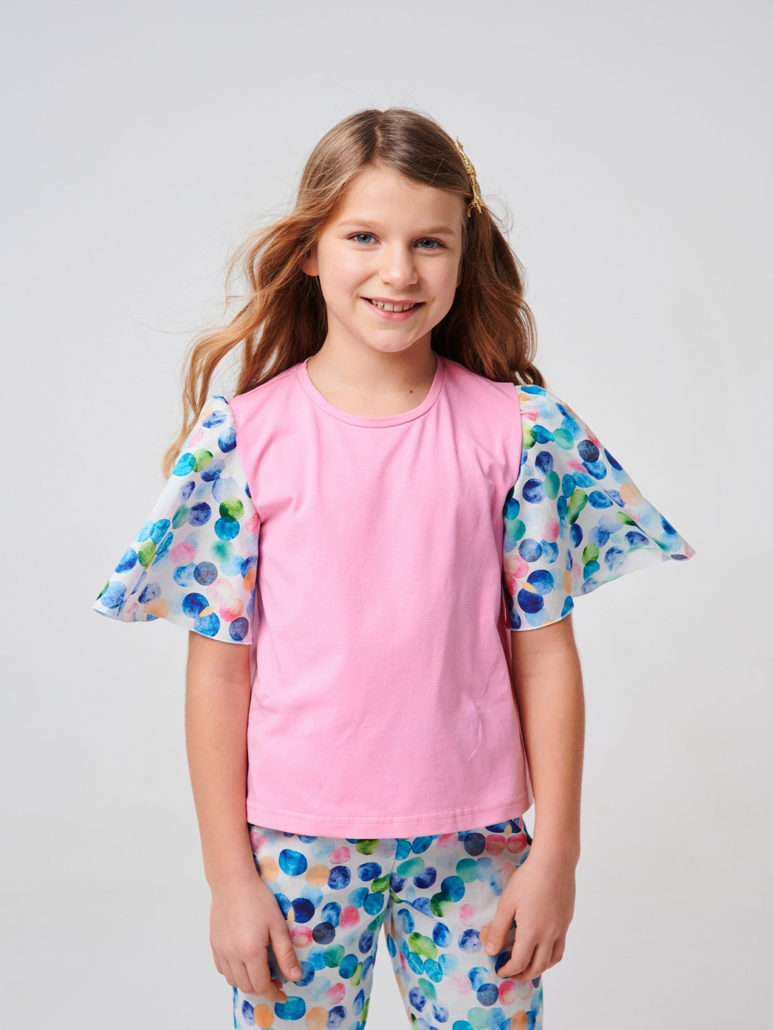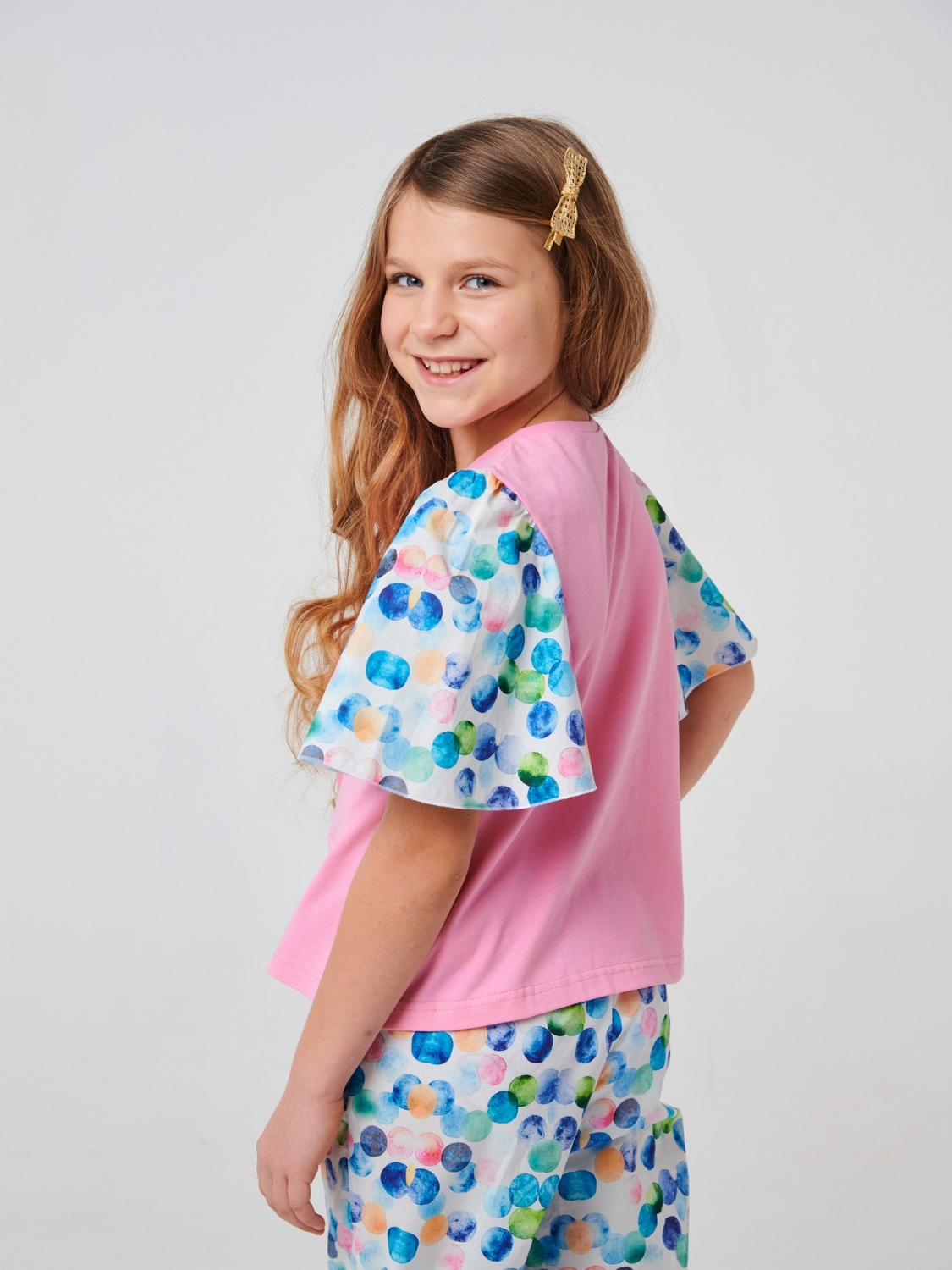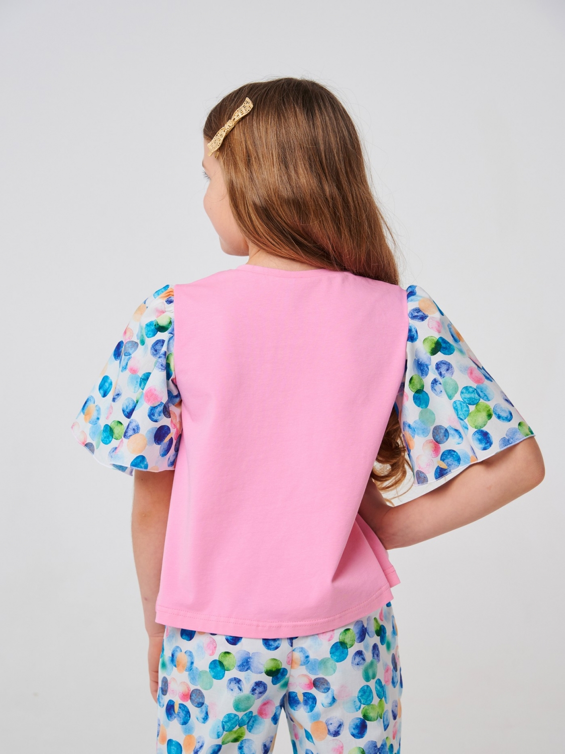 Хлопковая розовая футболка для девочки. В пошиве модели использован стрейчевый кулир и ситец. Рукава бабочки выполнены из материала в принт цветы. Изделие с круглым вырезом комфортно сидит на теле. Футболка хорошо будет смотреться с юбками, шортами, леггинсами. Она идеально подходит для повседневного ношения.