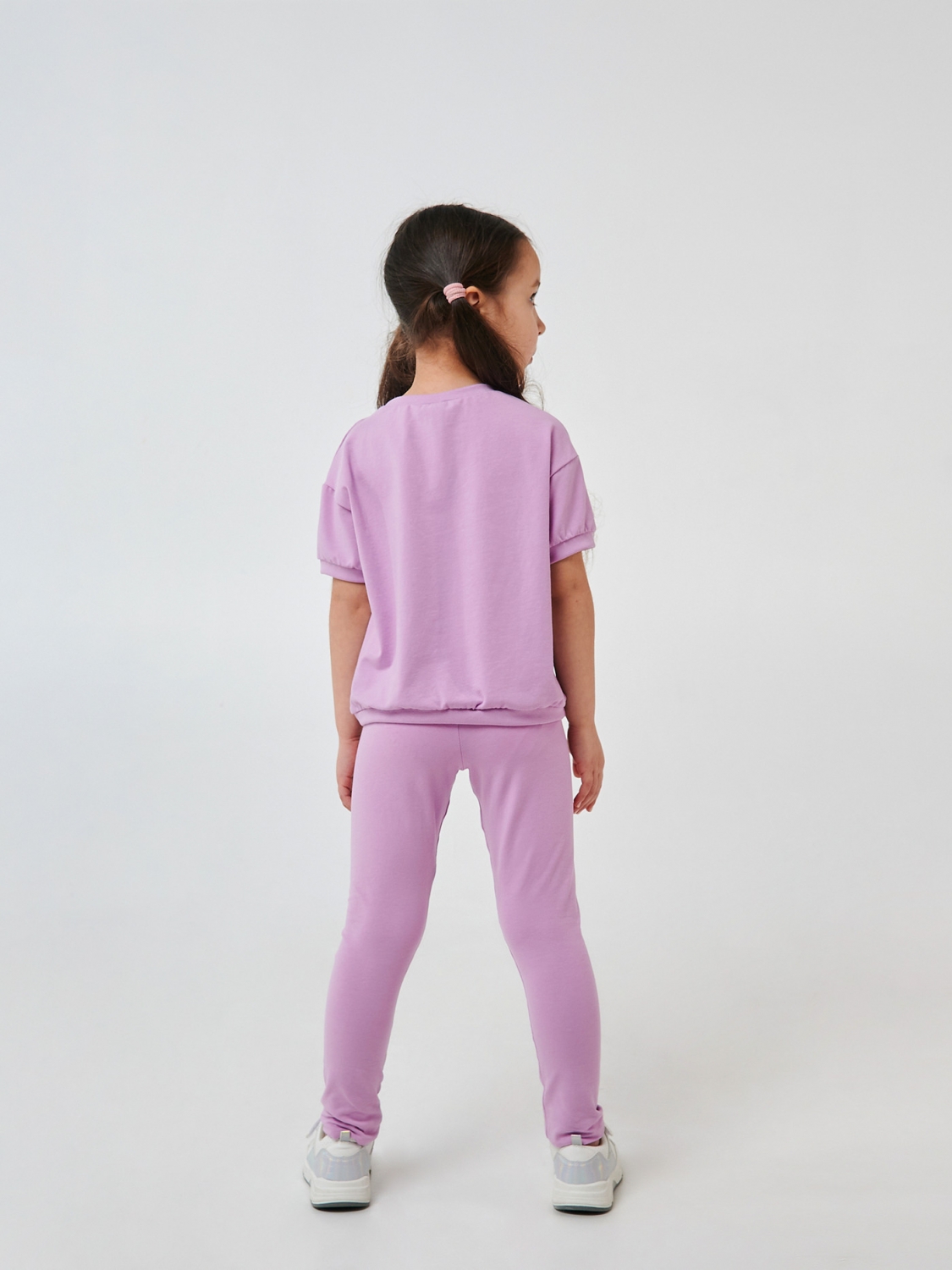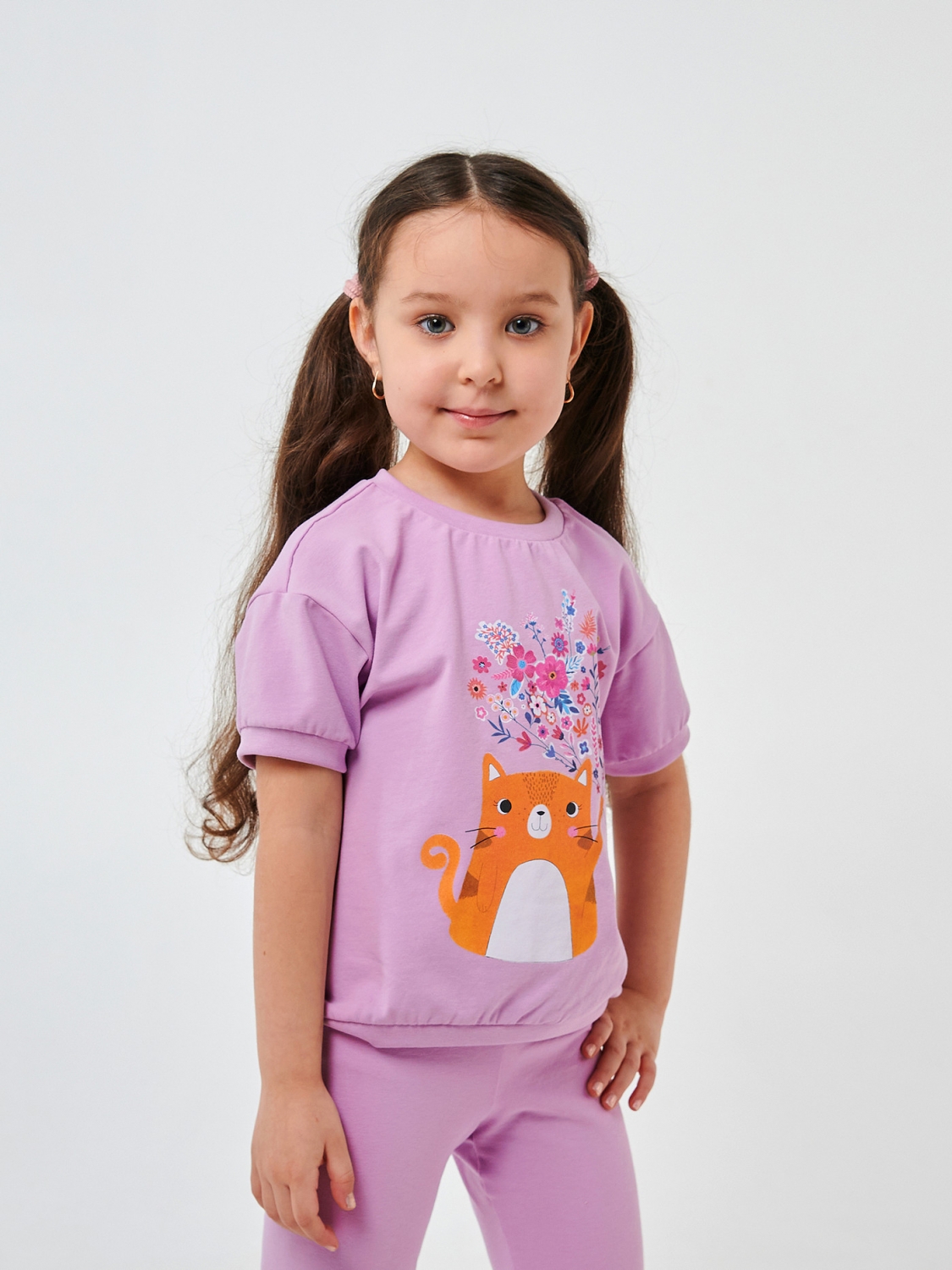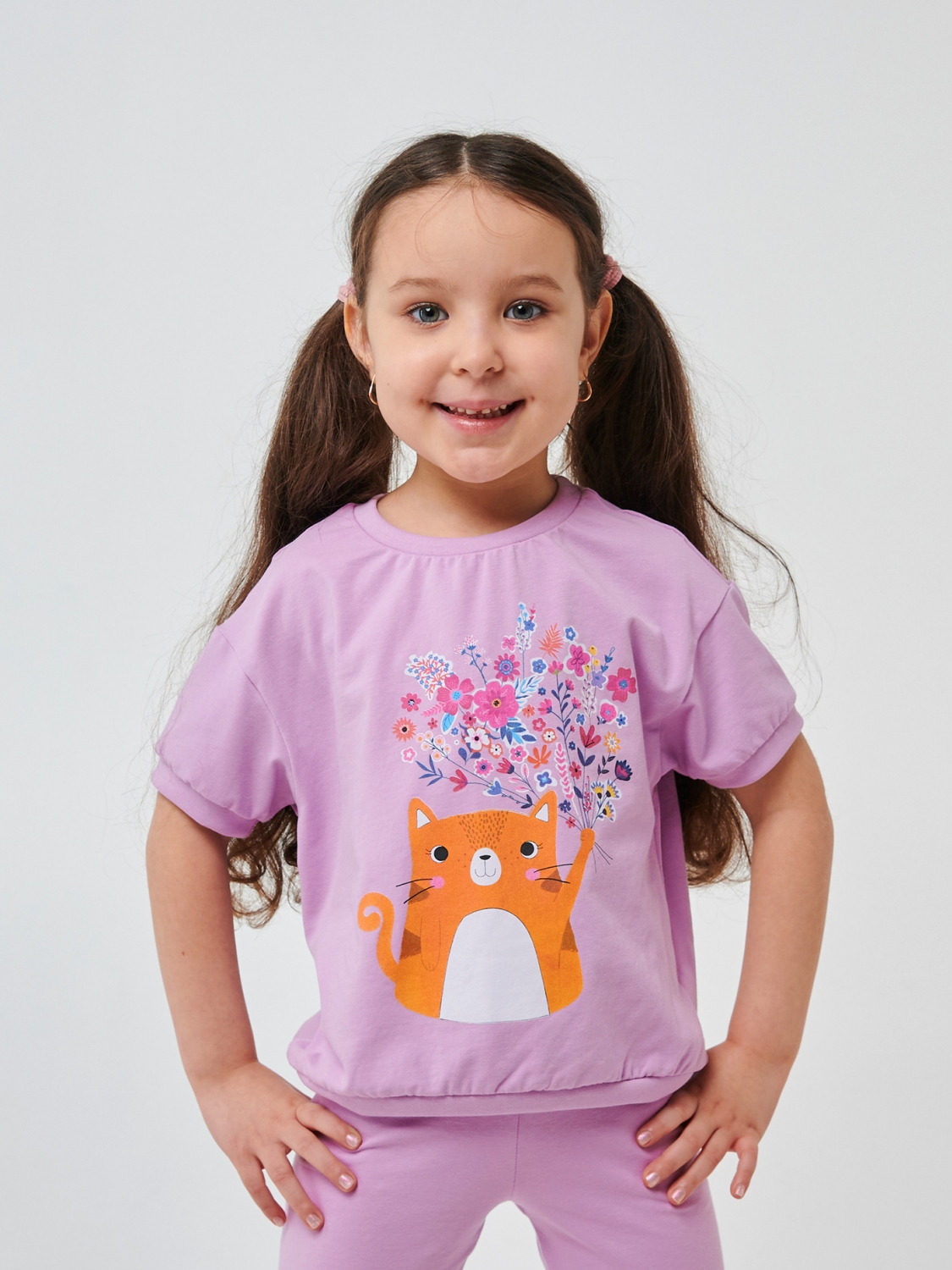 Нежная лиловая футболка для маленьких модниц. Манжеты на рукавчиках в цвет полотна для большего комфорта. Красивый дизайн и отличное качество принта, не трескается и не снимается после стирки. Мягкое и легкое полотно для комфорта в жаркие дни.