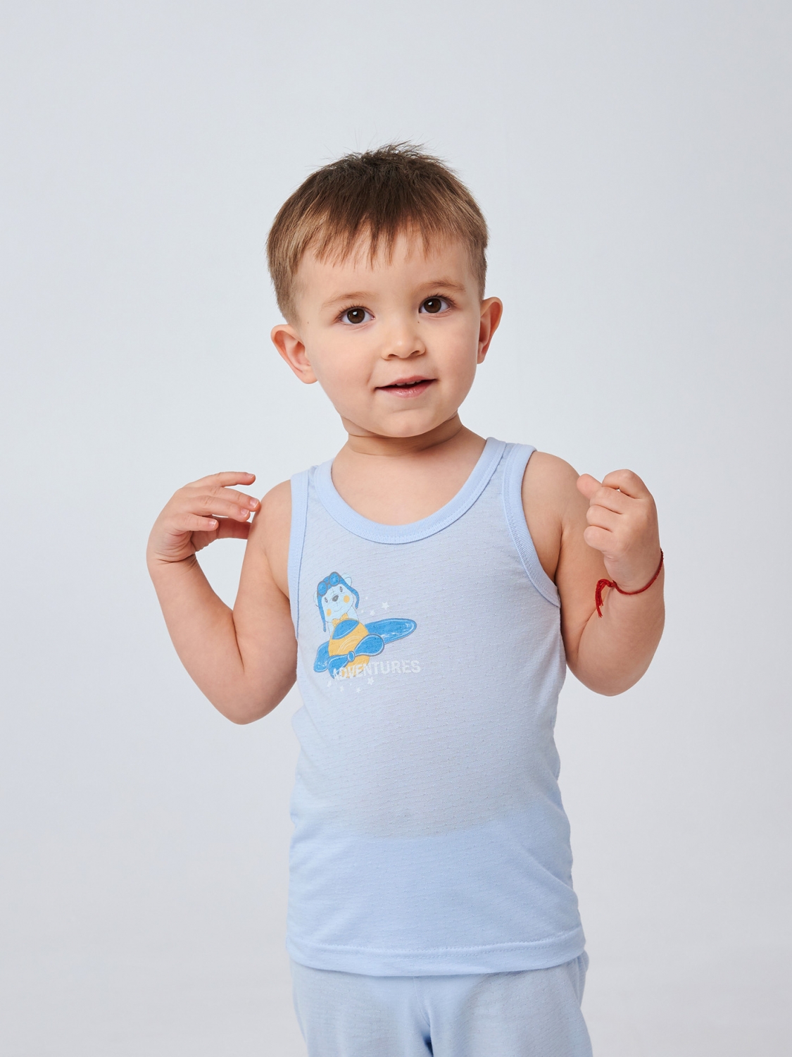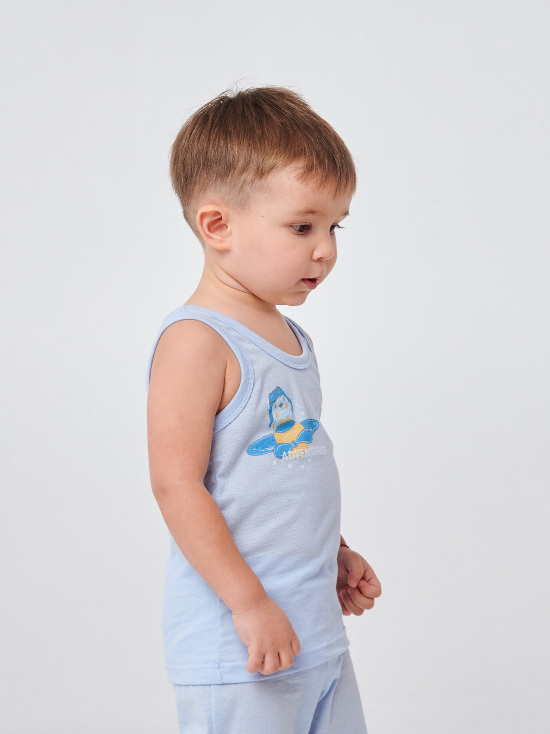 Милая майка в голубом цвете из мягкого ажурного кулира, она обеспечит вашему малышу комфорт и свободу движения в течении всего дня. Прямая печать песика на самолетике и надпись 'Adventure' придают этой майке игривый и веселый вид, вдохновляя на новые открытия и исследования.