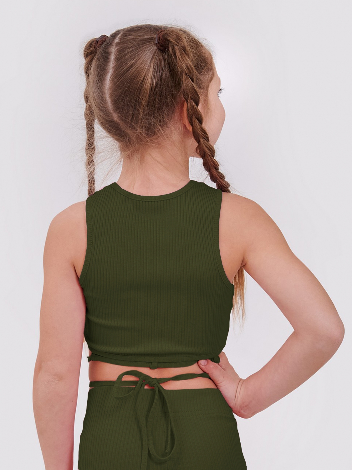 Модный топ для девочки из мягкого полотна рубчик станет ярким акцентом летнего образа. Красивые завязки на животе добавляют нежности и создают изящный силуэт. Идеально подходит для тёплых дней, прогулок и стильных нарядов.