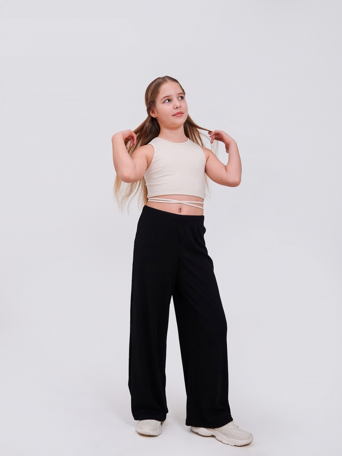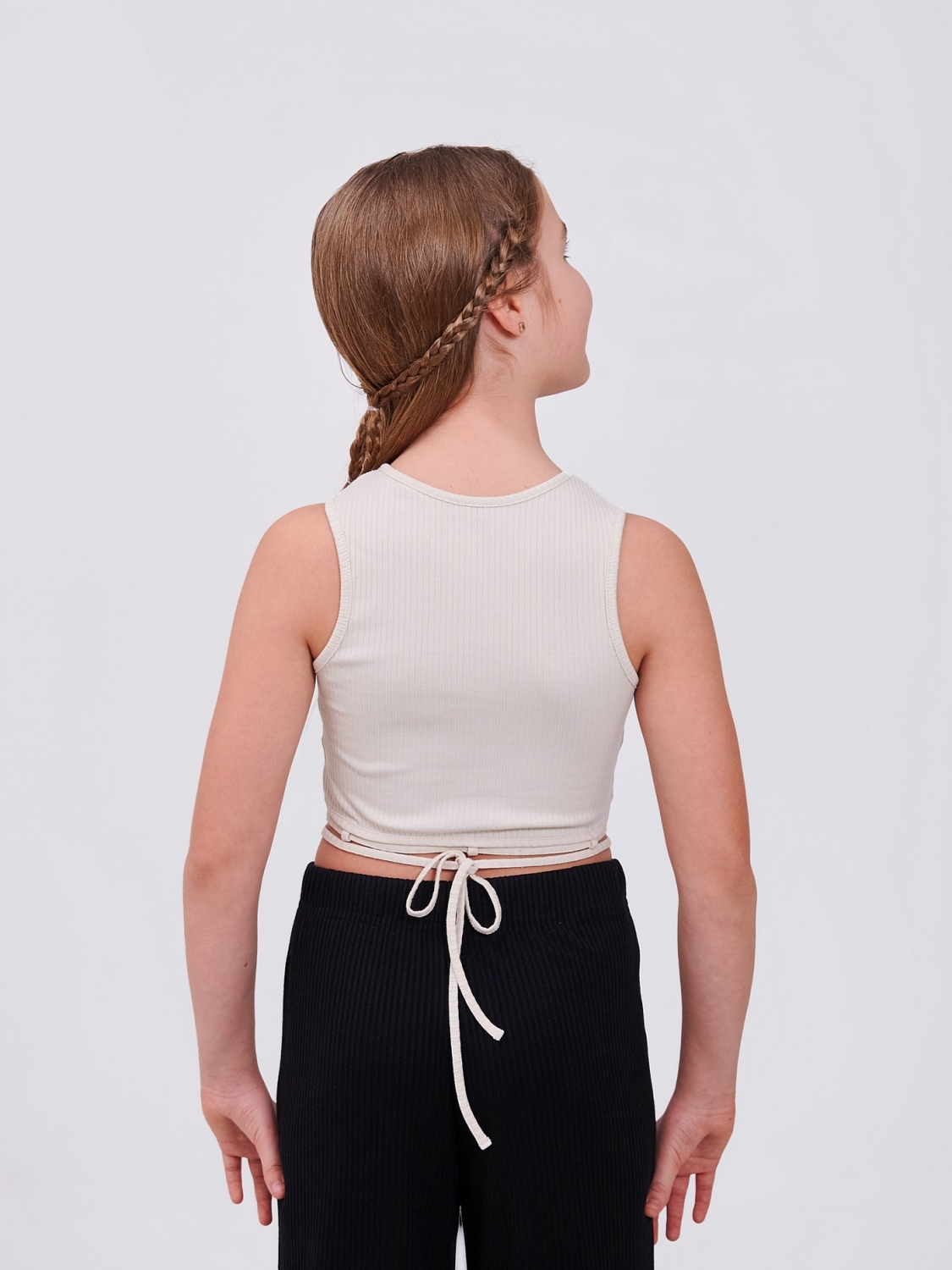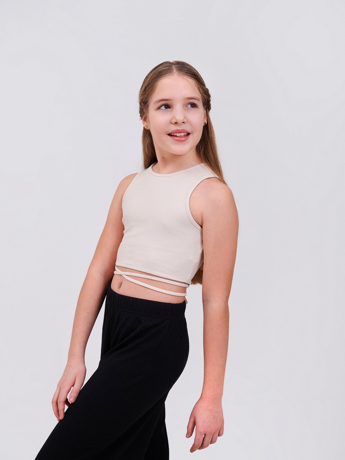 Модный топ для девочки из мягкого полотна рубчик станет ярким акцентом летнего образа. Красивые завязки на животе добавляют нежности и создают изящный силуэт. Идеально подходит для тёплых дней, прогулок и стильных нарядов.