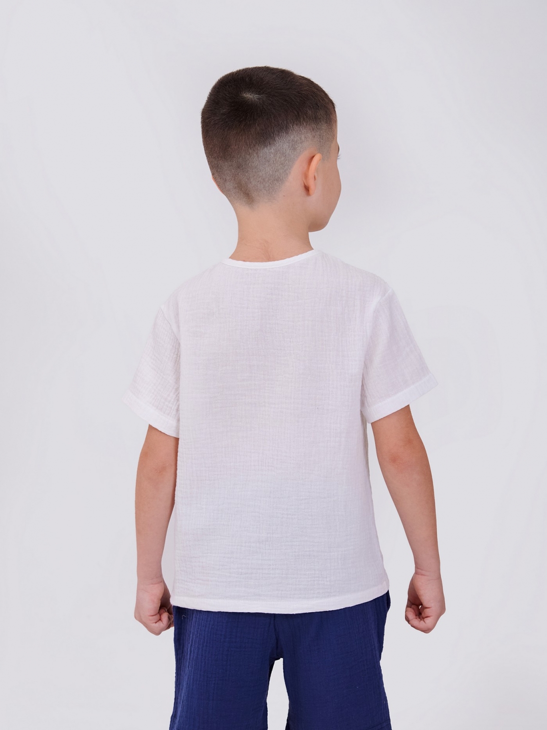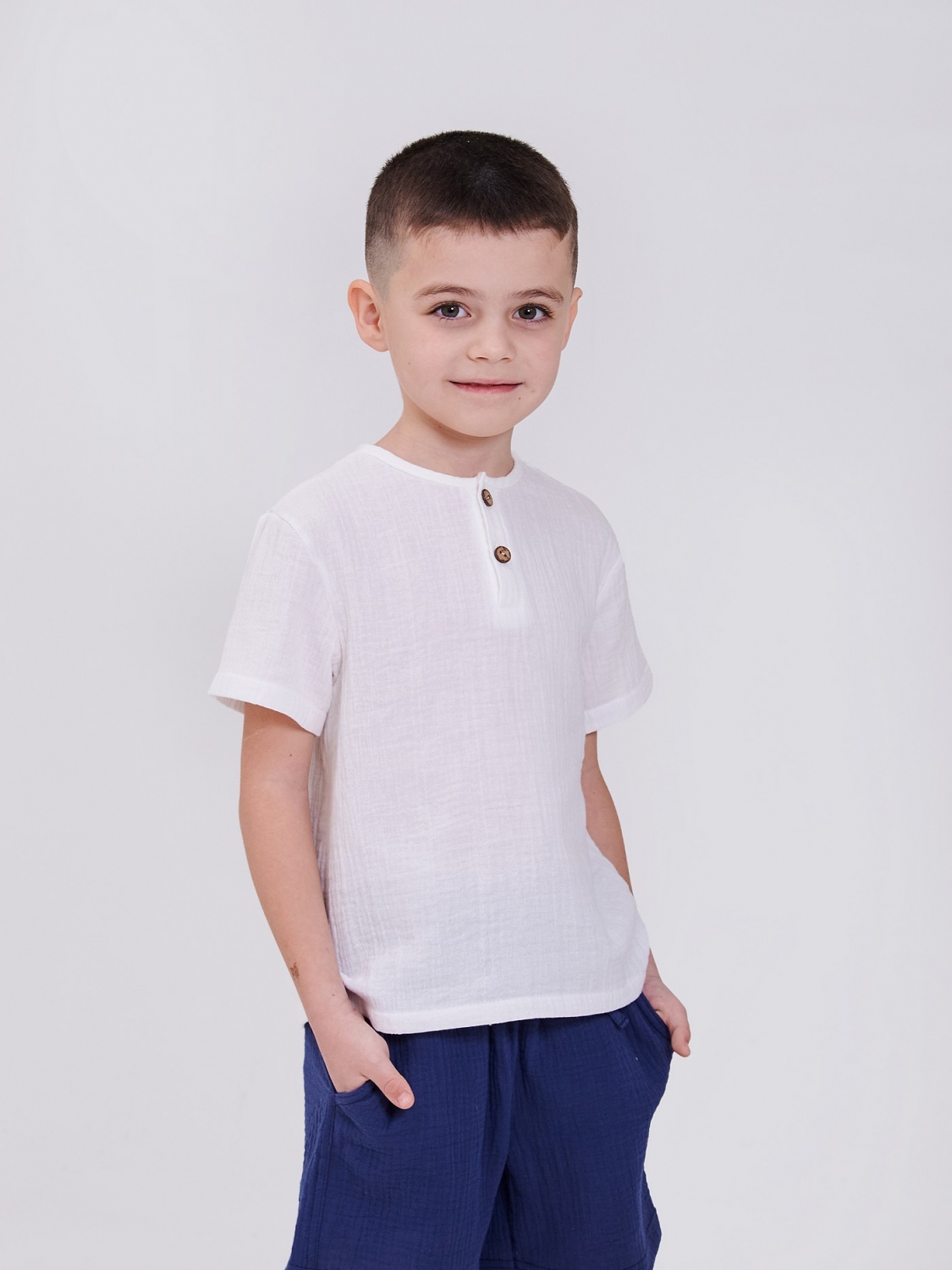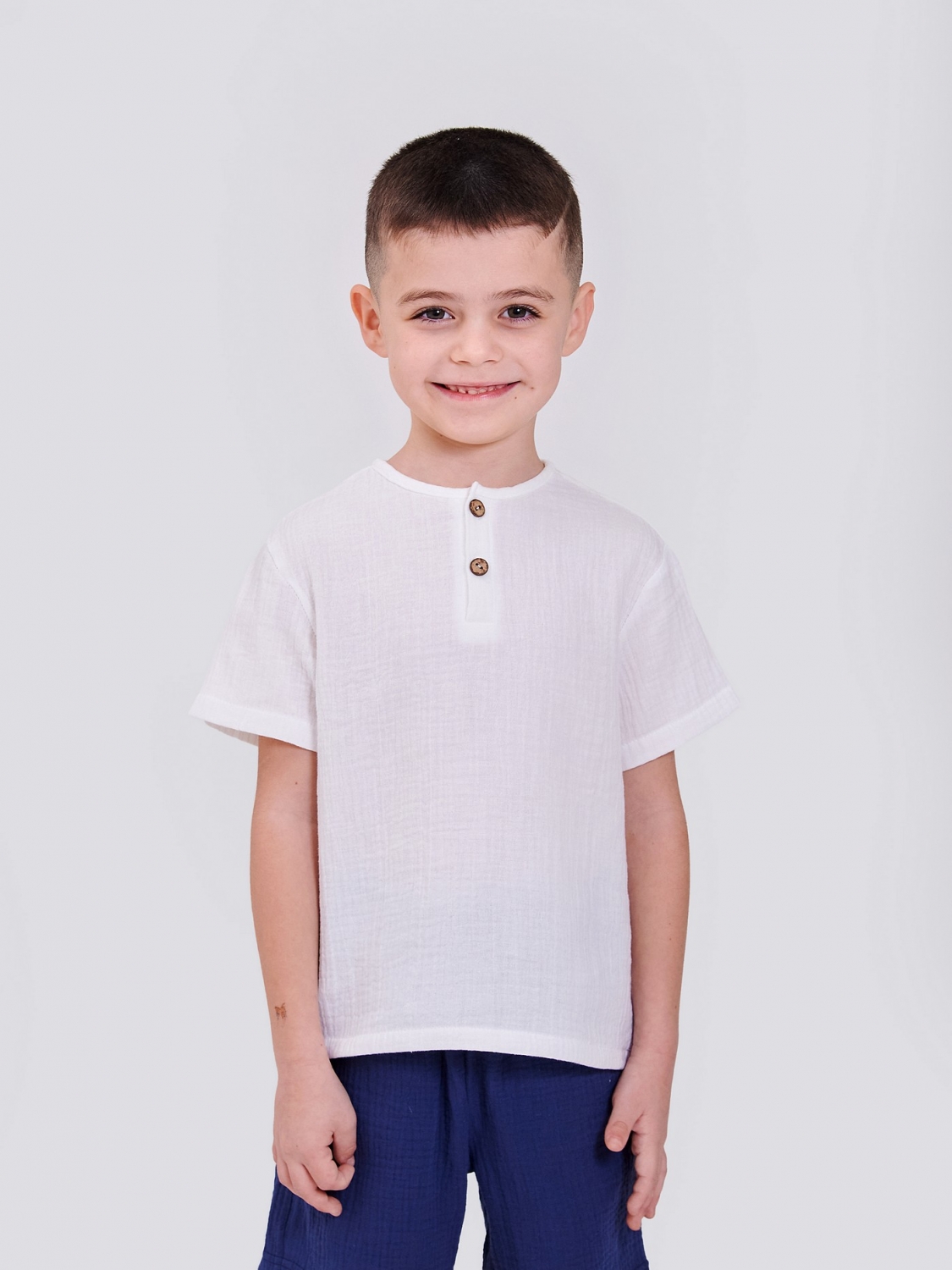Футболка молочного цвета с удобными пуговками — стильный и комфортный выбор для вашего мальчика! Лёгкое и дышащее муслиновое полотно заботится о коже, обеспечивая прохладу и комфорт в тёплые дни. Пуговки делают переодевание быстрым и удобным. Идеальная модель для повседневных прогулок и игр, которая сочетает в себе стиль, мягкость и практичность.