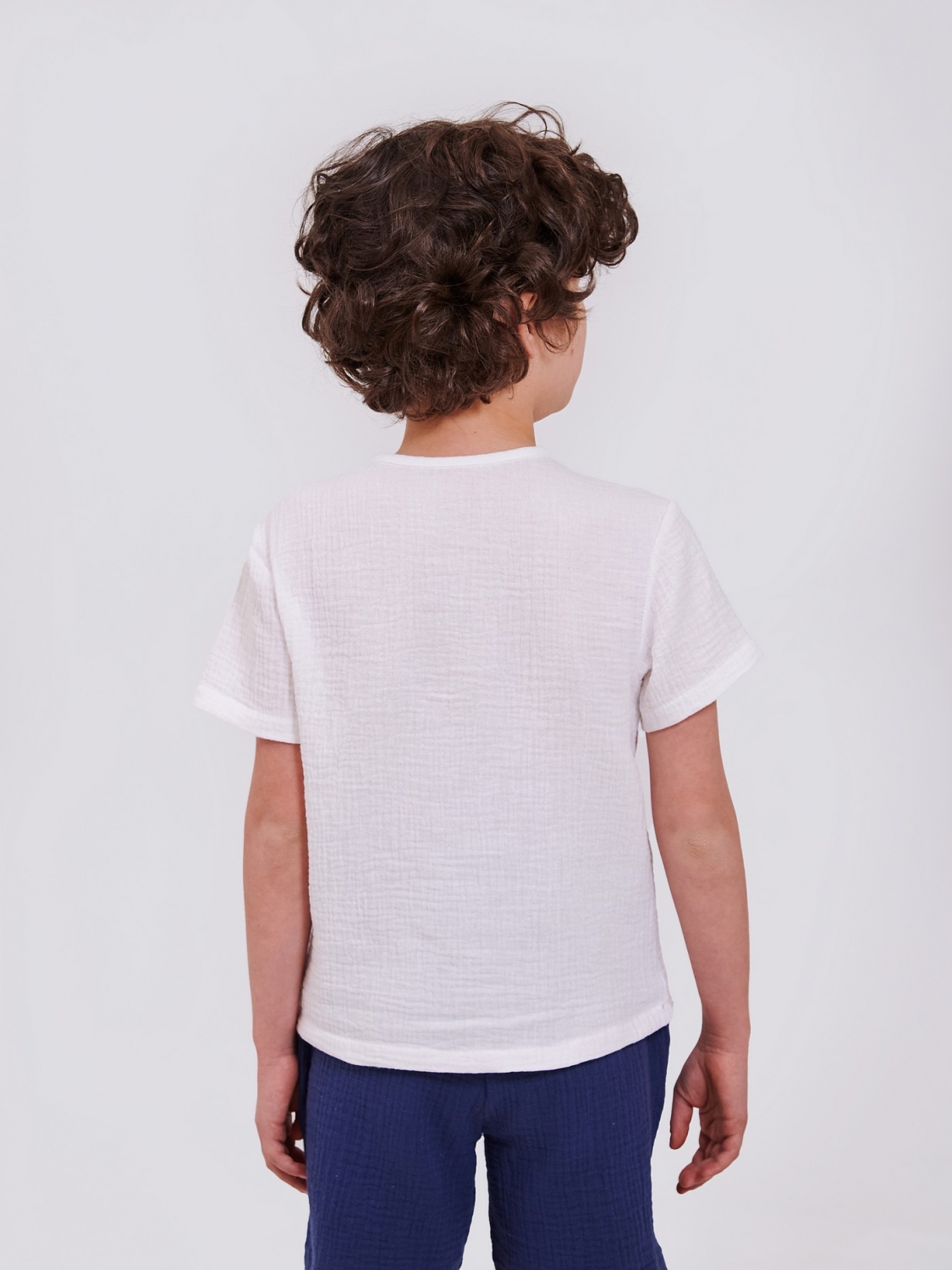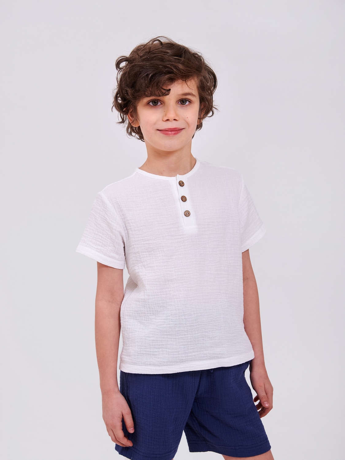 Футболка молочного цвета с удобными пуговками — стильный и комфортный выбор для вашего мальчика! Лёгкое и дышащее муслиновое полотно заботится о коже, обеспечивая прохладу и комфорт в тёплые дни. Пуговки делают переодевание быстрым и удобным. Идеальная модель для повседневных прогулок и игр, которая сочетает в себе стиль, мягкость и практичность.