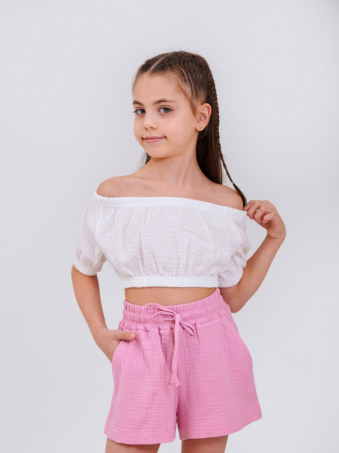 Очаровательный топ для девочки идеален для прогулок, фотосессий, праздников и просто красивых летних дней! Пошит из лёгкого, дышащего муслина — идеален для жаркой погоды и чувствительной кожи. Объёмные рукава-фонарики придают образу сказочность и особую лёгкость. Легко сочетается с юбками, шортами или брюками.