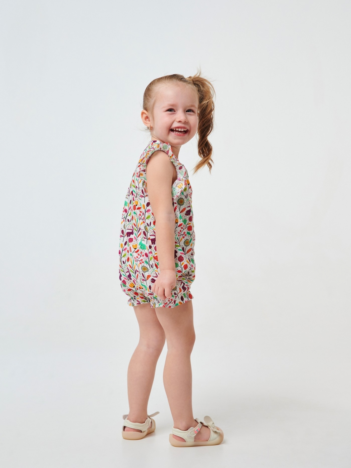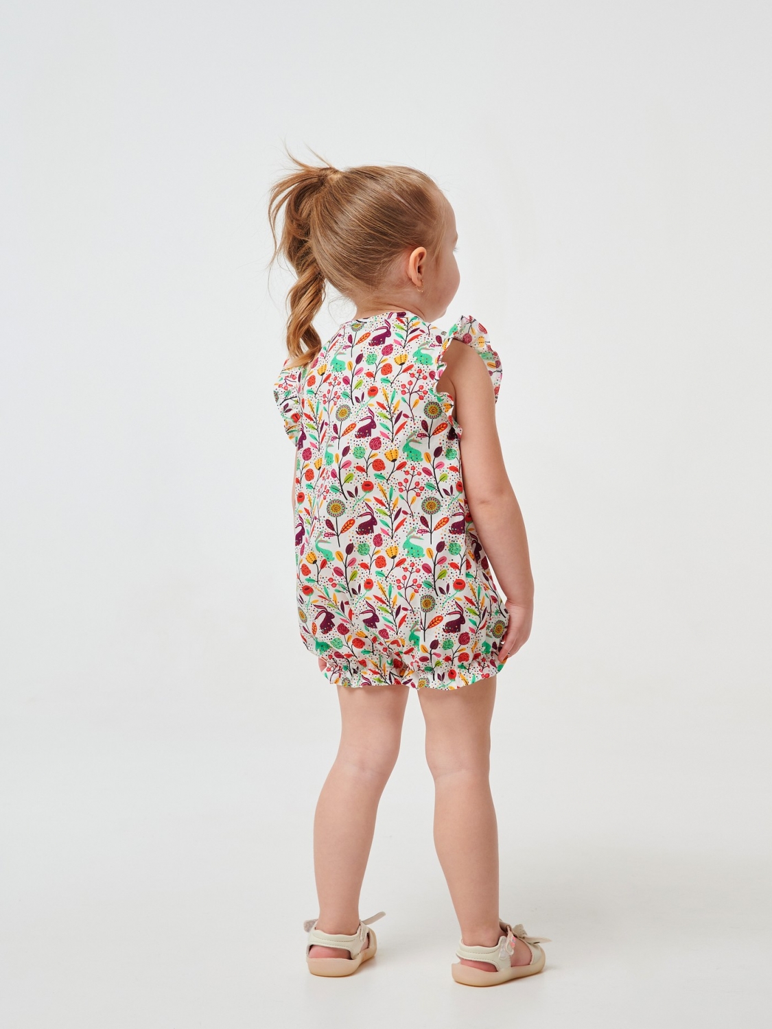 Симпатичный песочник для малышки. В пошиве изделия использован 100% натуральный материал – ситец. Он хорошо пропускает воздух, приятный на ощупь, долго сохраняет первоначальный внешний вид. Модель пошита из ткани в принт луговые цветы. Песочник застегивается на кнопки спереди. Короткие рукава-бабочки придают изделию нарядности.