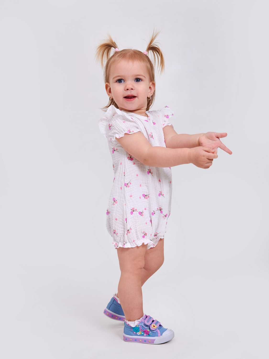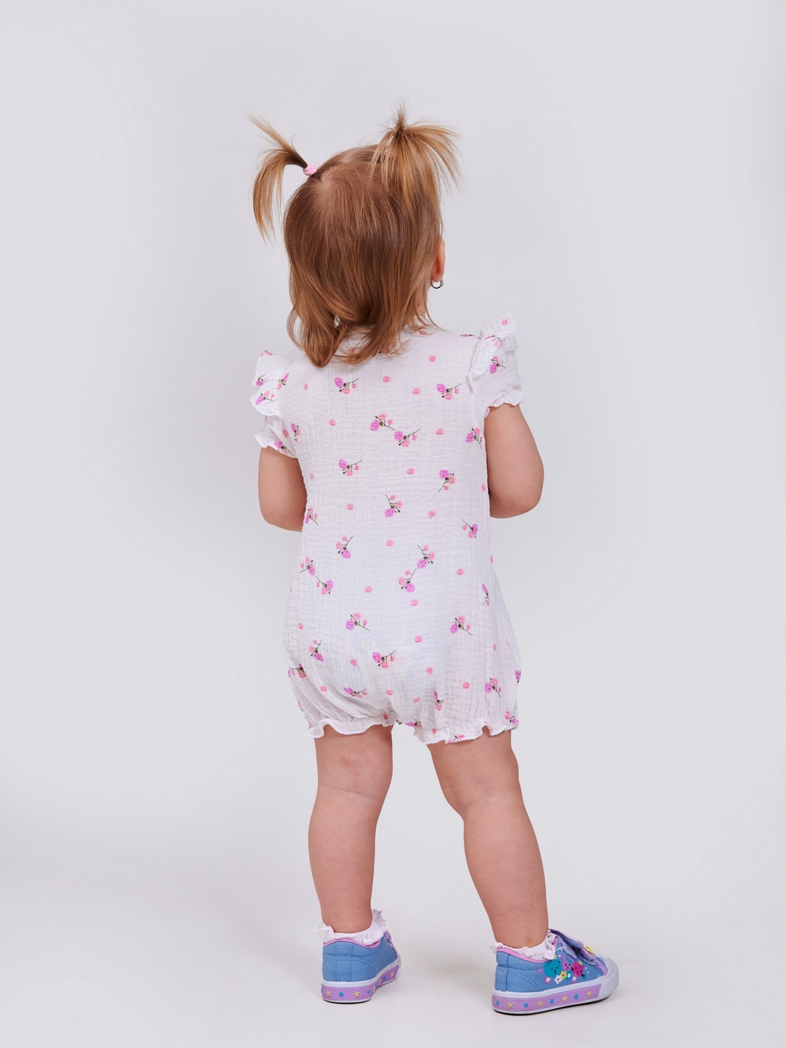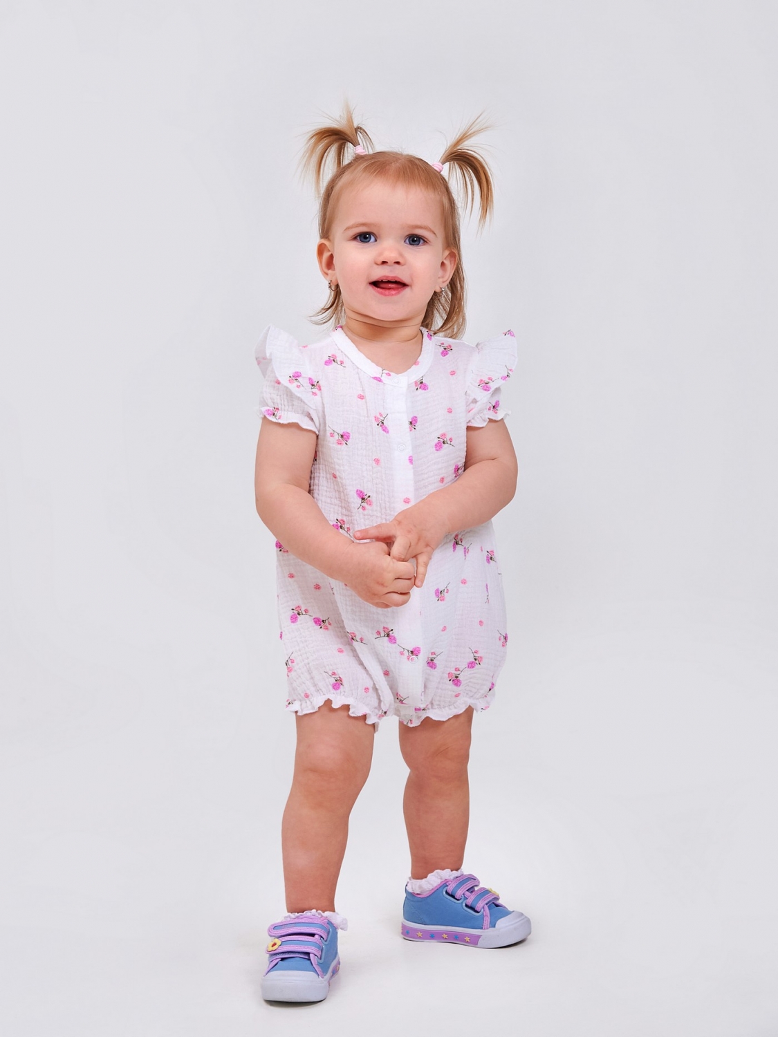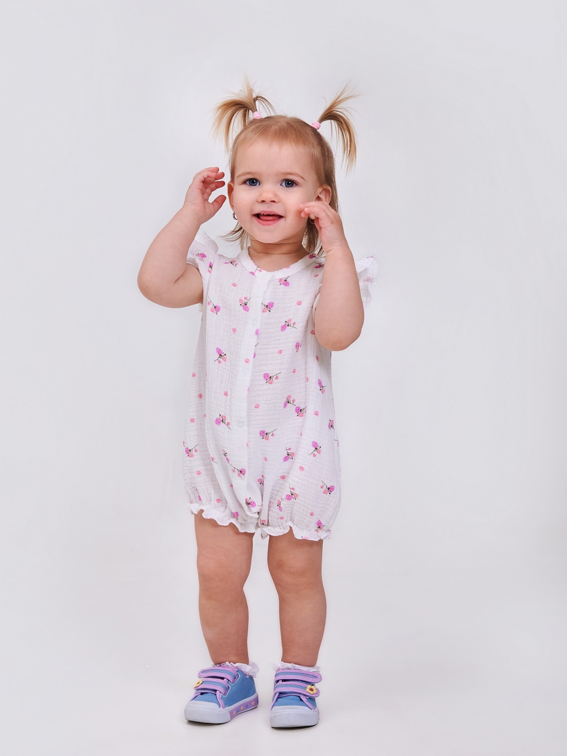 Нежный и удобный песочник для девочек, пошит из муслина — дышащего, гипоаллергенного материала, идеально подходящего для чувствительной кожи. Кнопки вдоль всего изделия — удобно переодевать даже самых маленьких. Рюши на рукавах добавляют трогательного очарования. Рукава и ножки собраны на мягкую резиночку.