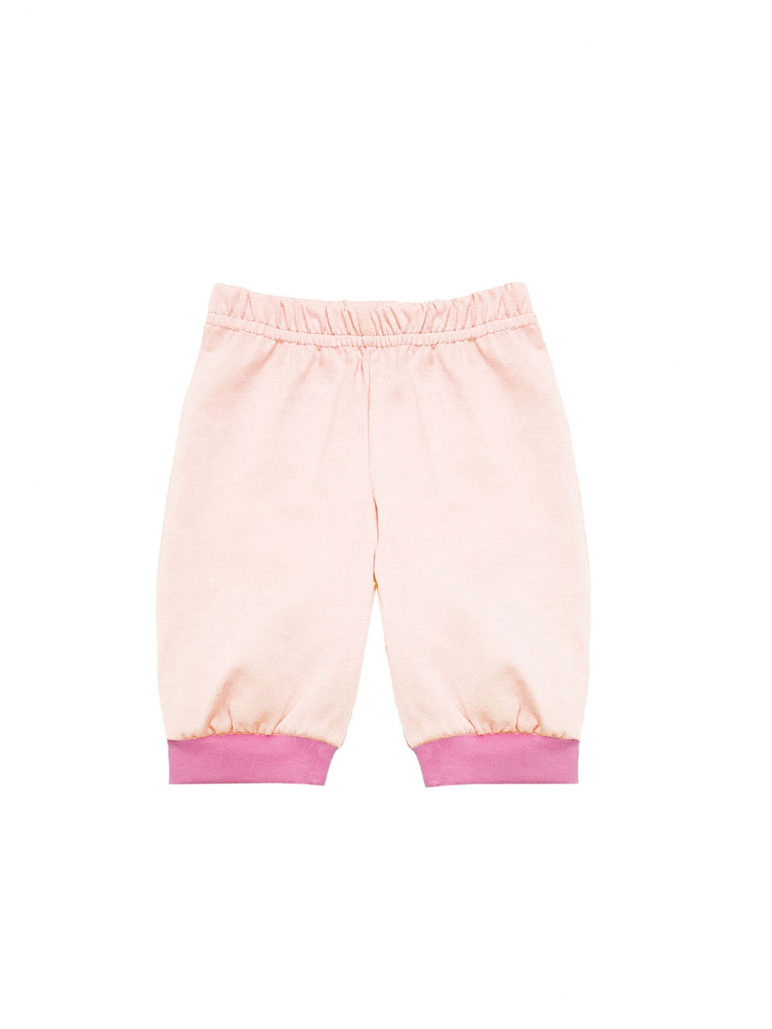Практичные и универсальные бриджи дополнят гардероб девочки в возрасте от 6 до 18 месяцев. Для их пошива использовался мягкий хлопковый материал – кулир персикового цвета. Эта ткань не вызывает аллергию или раздражение на коже ребенка. Бриджи рассчитаны на ежедневную носку, их можно сочетать с майками и футболками. Надежную фиксацию на теле обеспечивает эластичная резинка.