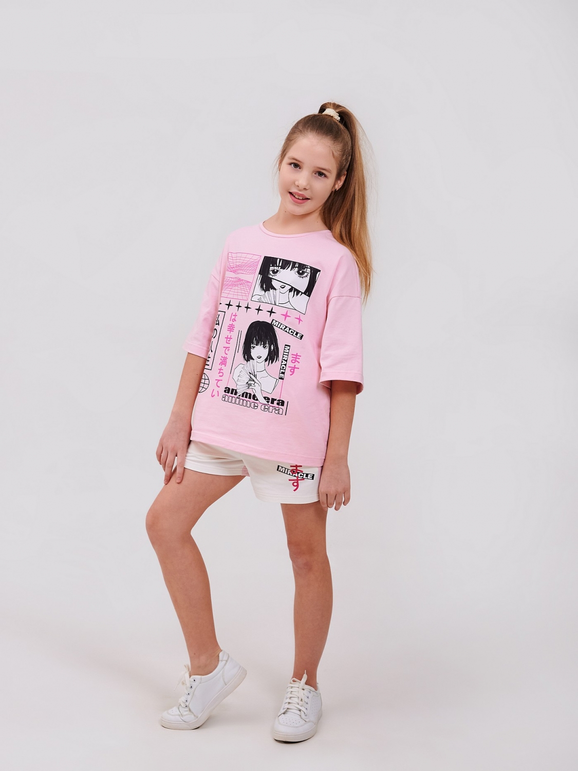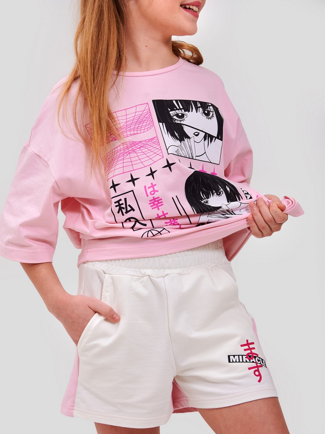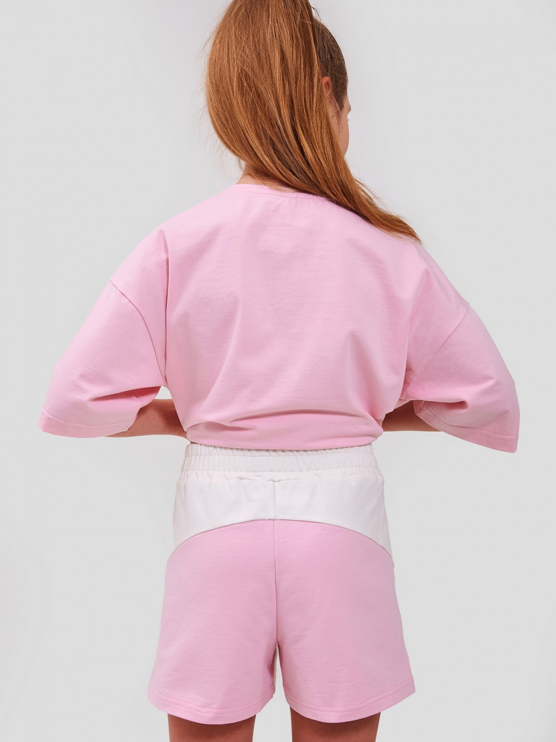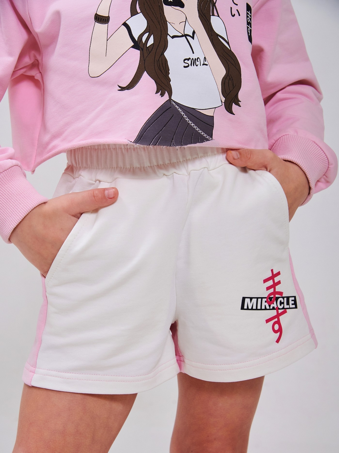 Стильные шорты для девочки - яркий дизайн для юных модниц! Оригинальный принт, который выделяет. Мягкий и эластичный стрейчевый футер. Нежное сочетание розового и молочного для стильного образа. Функциональные карманы удобны и практичны для прогулок и активного отдыха.