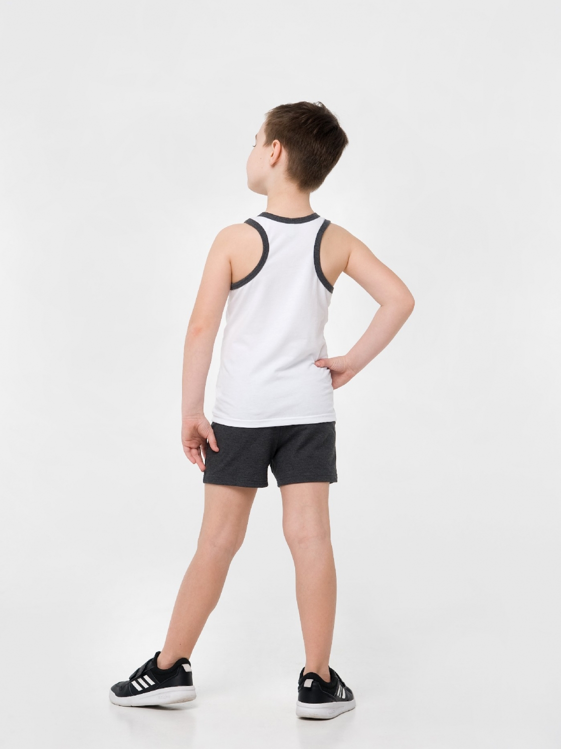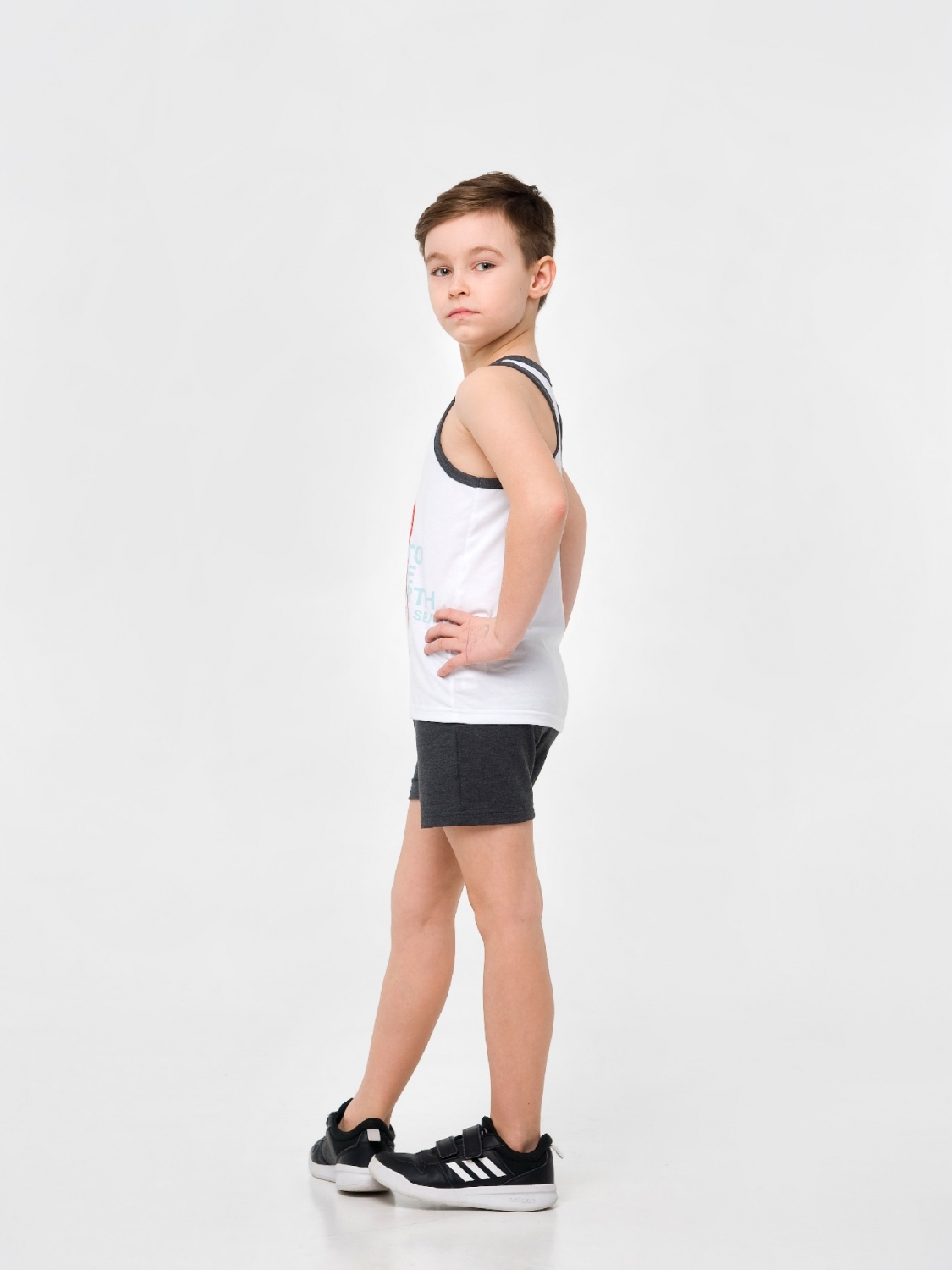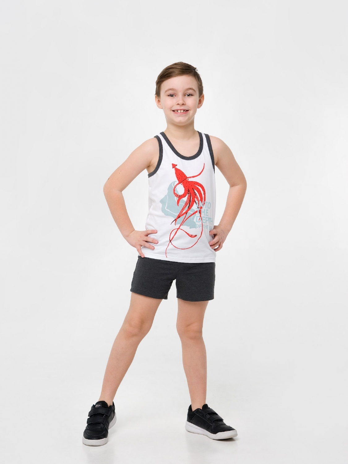 Мальчишкам в возрасте от 7 до 16 лет придется по вкусу стильный, легкий комплект, состоящий из шорт и майки. Для пошива использовался приятный на ощупь гипоаллергенный хлопковый материал. Серые шортики оснащены эластичным поясом, а белая майка украшена печатным принтом в виде осьминога и окантовкой контрастного графитового цвета. В таком комплекте мальчик может отправиться на прогулку или на пляж