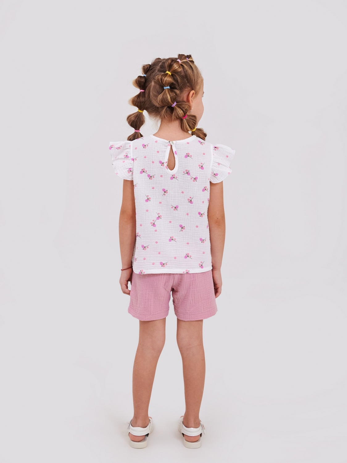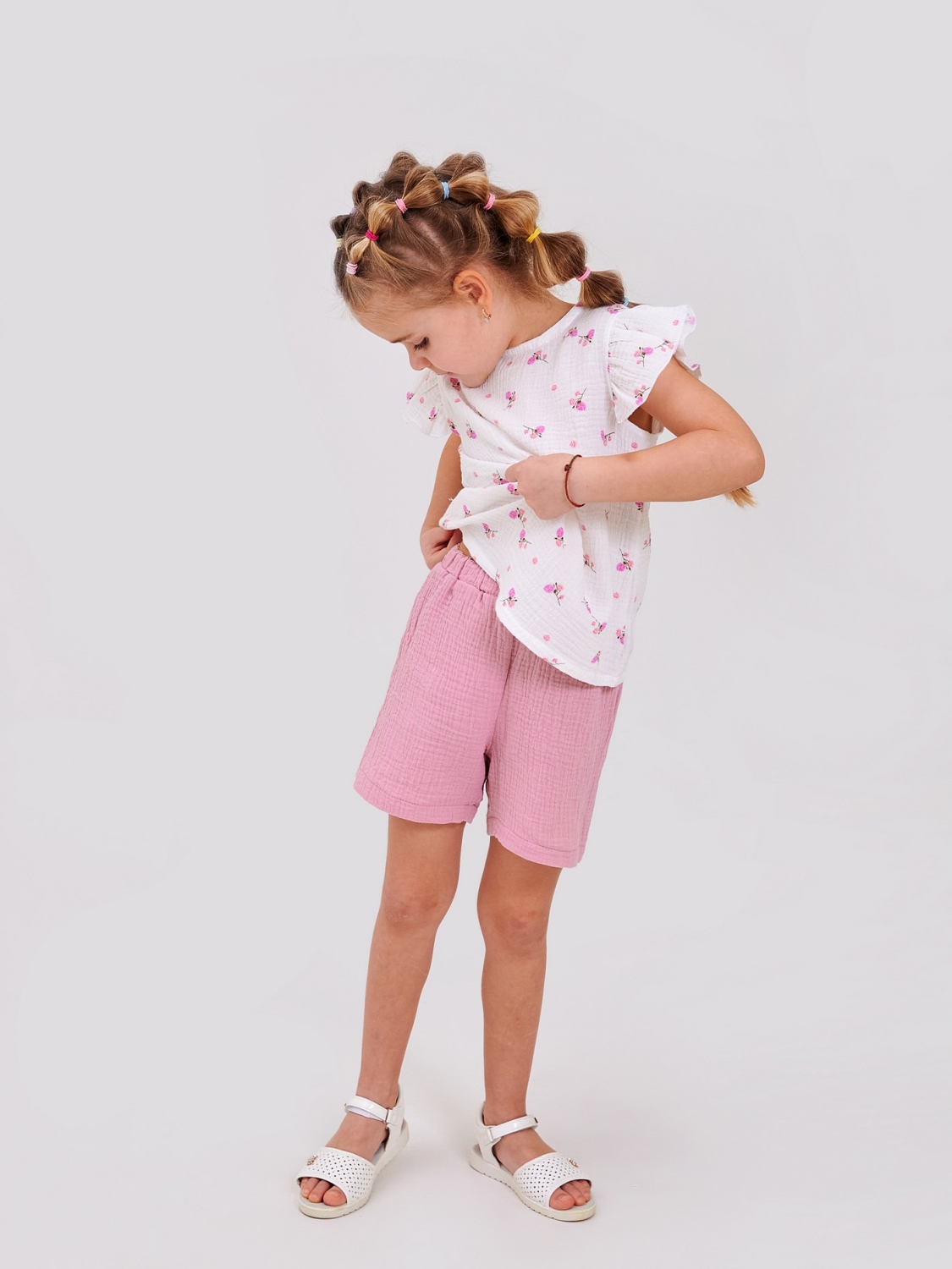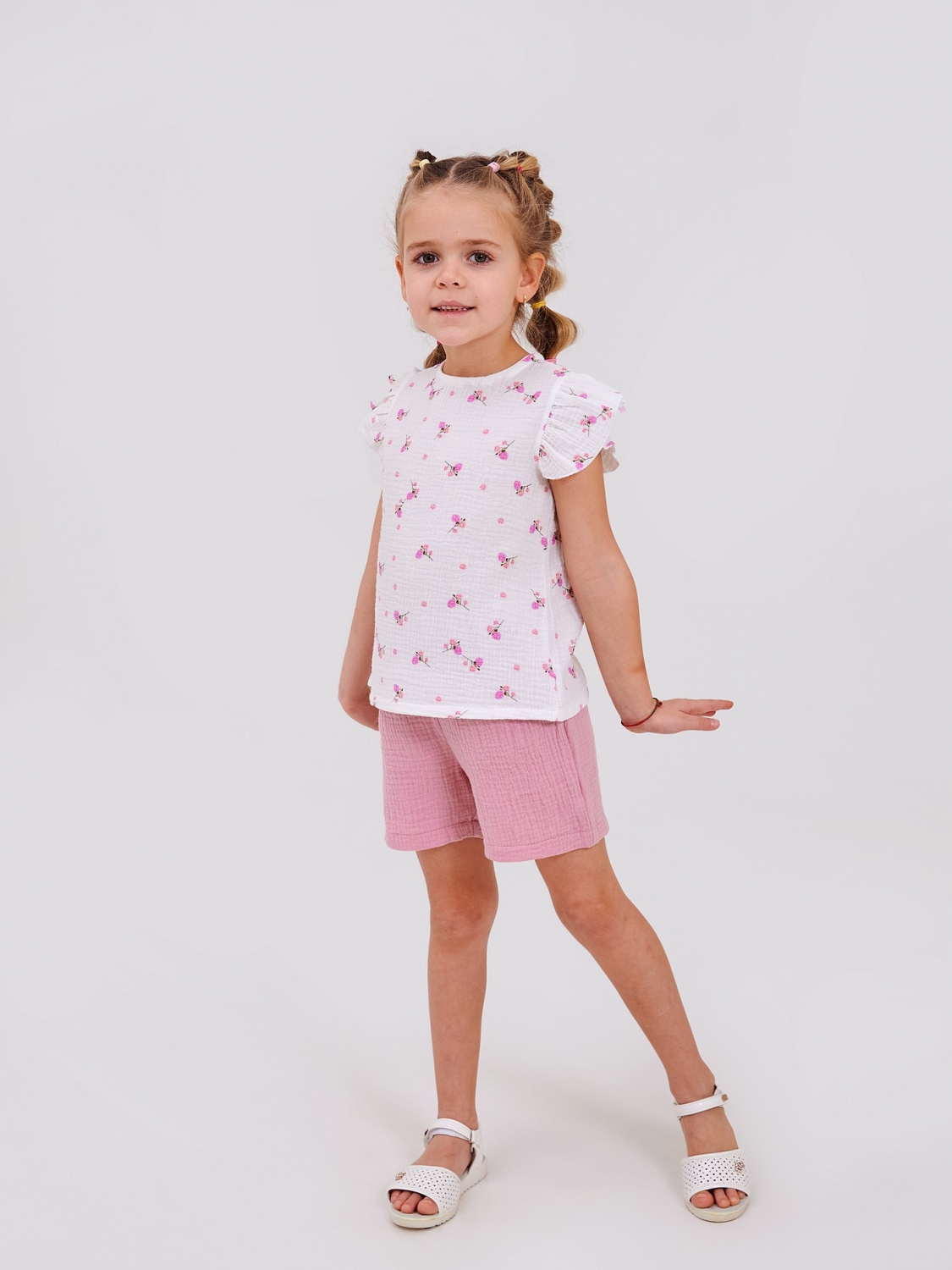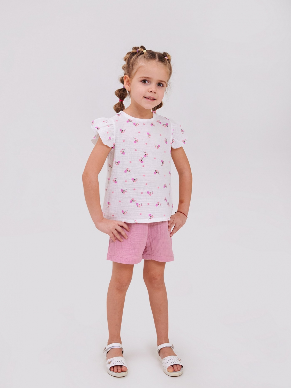 Летний комплект для девочки — футболка и шорты из воздушного муслина с очаровательным принтом розочек. Мягкое, натуральное полотно бережно заботится о чувствительной коже. Нежные розочки придают образу изысканность и девичье очарование. Свободный крой шорт и удобная футболка — максимум комфорта для активных игр и прогулок.