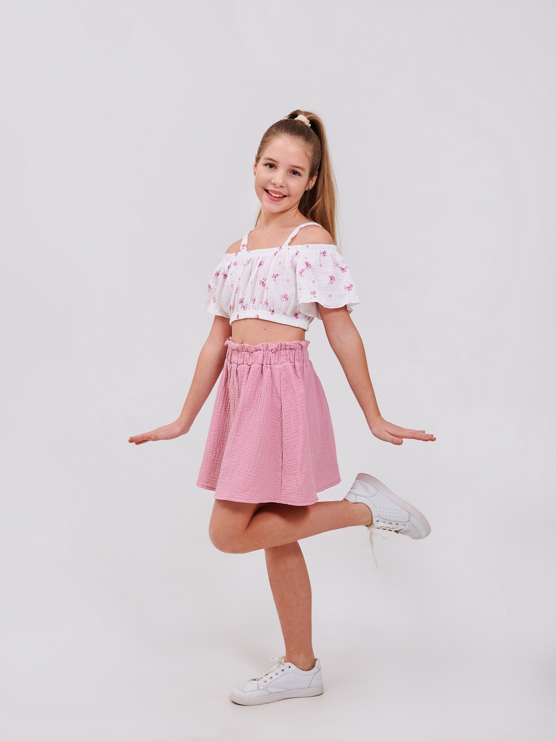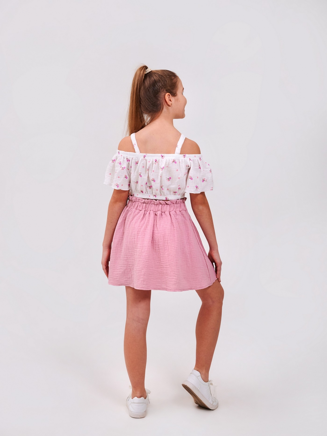 Очаровательный комплект для девочки - гармоничный дуэт для праздников, прогулок и просто ярких дней детства! Легкая юбка красиво развевается при каждом шаге — идеально для тёплых дней и фото в движении. Лёгкий топ с удобной посадкой не стесняет движений и подчёркивает летнее настроение. Муслин — гипоаллергенный, мягкий, идеально подходит для детской кожи.