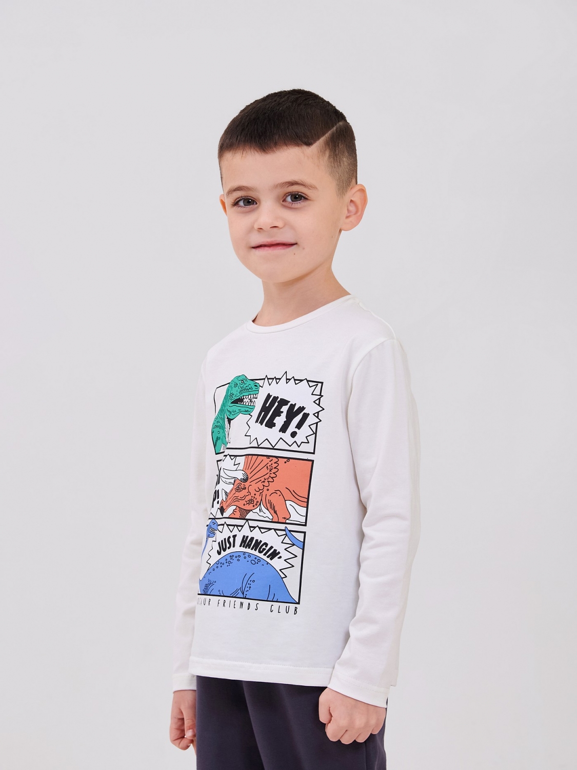 Лонгслив для мальчика для активных будней, прогулок и ярких детских образов! Яркий и крутой принт для маленьких любителей динозавров. Стрейчевый кулир – мягкое, дышащее и эластичное полотно для максимального комфорта. Длинные рукава – отличная защита в прохладную погоду и стильный вид. Легко комбинируется с джинсами, брюками и спортивными брюками.