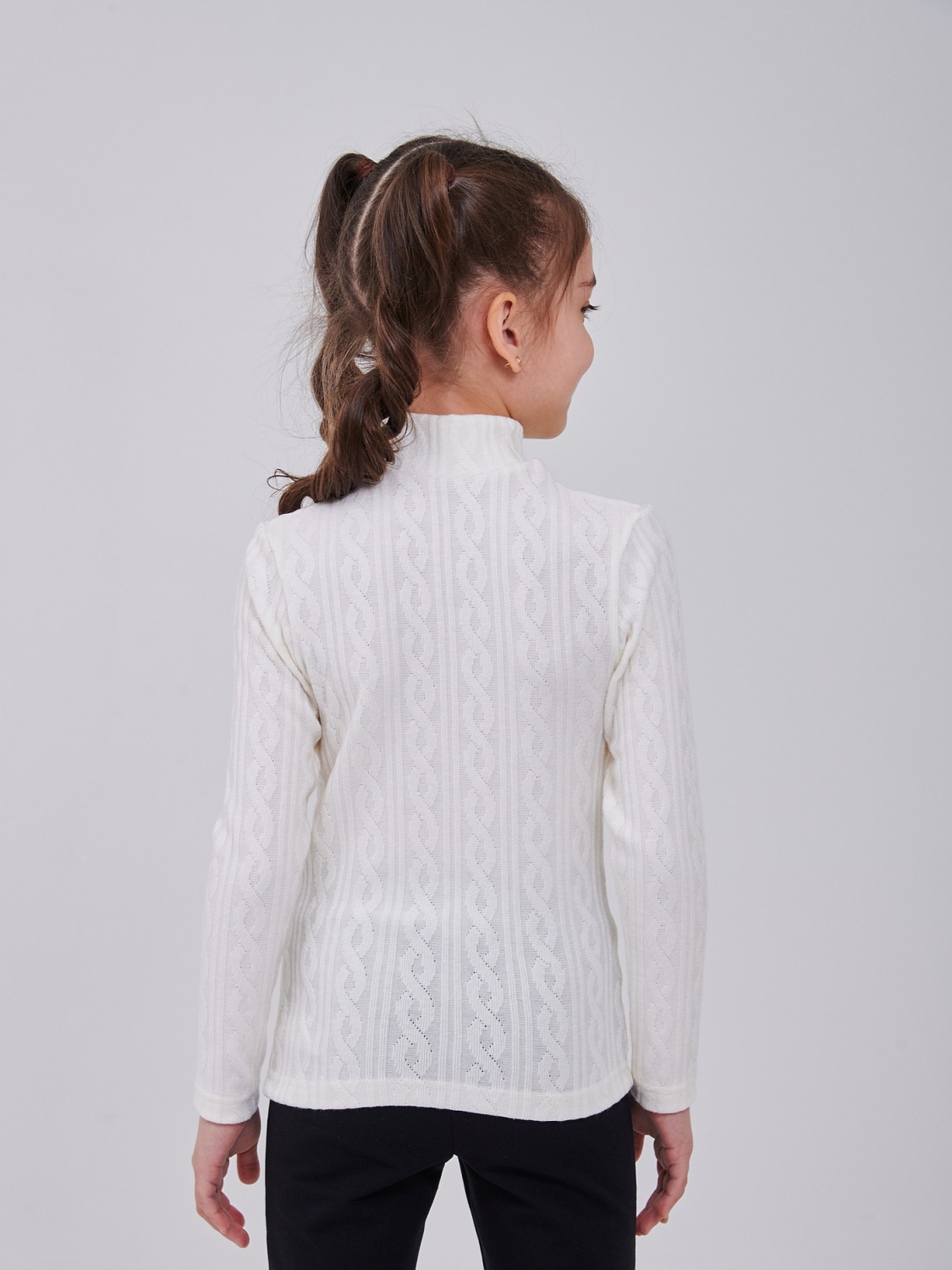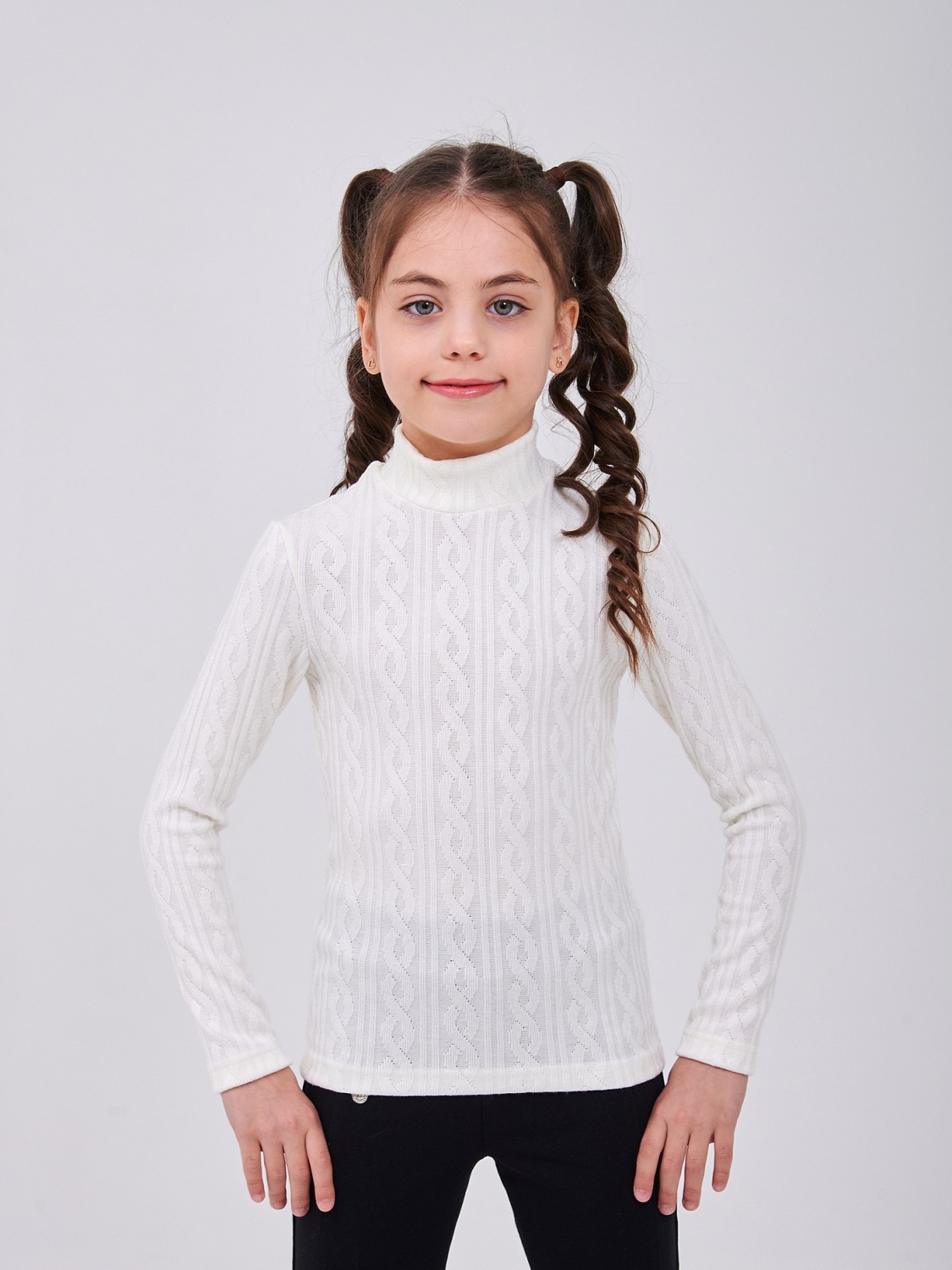 Изящный гольф для девочки из вязаного трикотажа в молочном оттенке — базовая стильная вещь. Ажурный узор, мягкий ворот и комфортная посадка делают его идеальным для школы, праздников и повседневных образов. Полотно приятное к телу, хорошо тянется и сохраняет форму — удобно, красиво, практично.