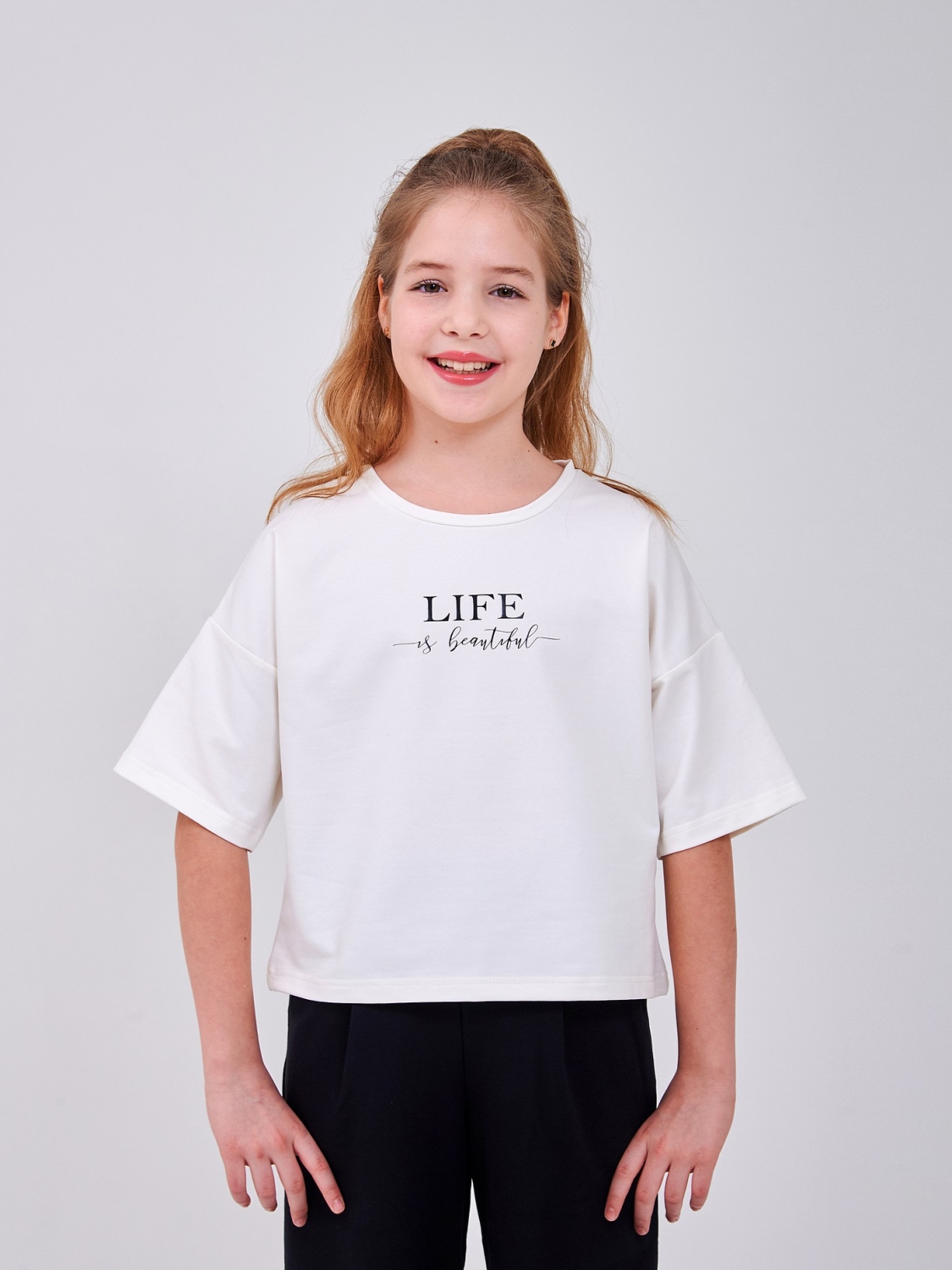 Молочная футболка для девочки из стрейчевого футера с надписью "Life is Beautiful" — это мягкость, комфорт и стиль в одном. Эластичное полотно не сковывает движений, а вдохновляющая надпись добавляет настроения. Универсальный оттенок легко сочетается с любым образом. Идеальна для школы и прогулок.