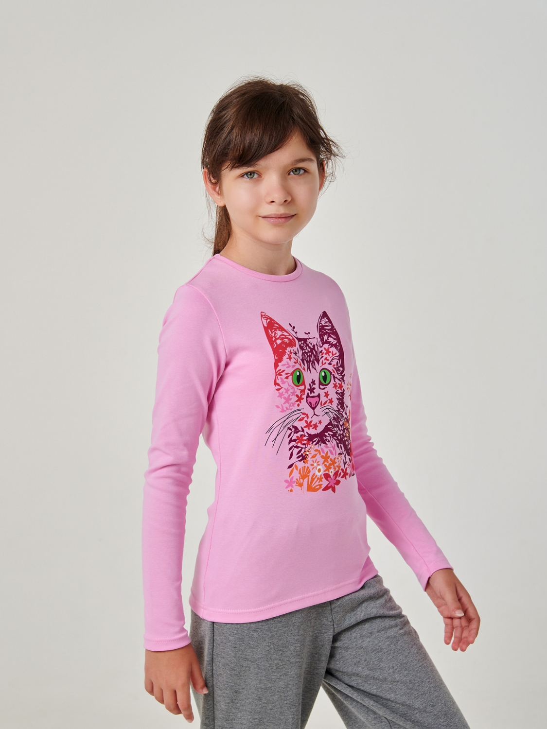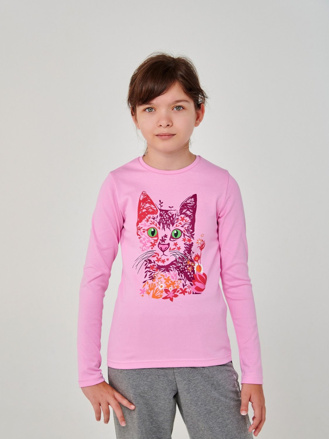 Футболка с длинным рукавом для девочек пошита из мягкого стрейчевого ластика, который обеспечивает невероятный комфорт и свободу движения. Качественная прямая печать оригинального рисунка милого котика, придает этой футболке нежность и невероятную магию. Цветовая палитра включает как нежные, так и яркие оттенки, чтобы каждая девочка могла найти свой уникальный стиль.