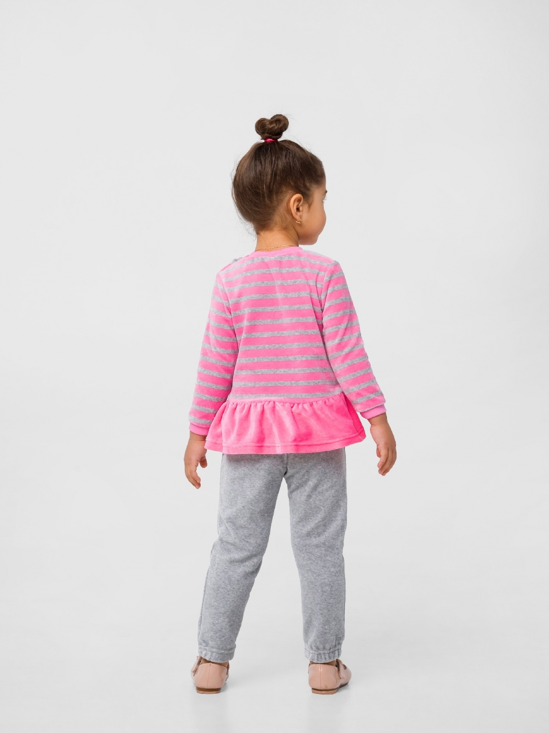 Нарядная, приятная к телу туника в серо-розовую полоску выполнена из качественного, износостойкого велюра. Это изделие рассчитано на девочек в возрасте от 2 до 6 лет. Данная модель хорошо сочетается с лосинами, брючками. Тунику с длинными рукавами украшает аппликативная вышивка и баска. Сбоку на плече находится кнопка. Ее девочка сможет носить каждый день, например, на прогулки или в детский сад
