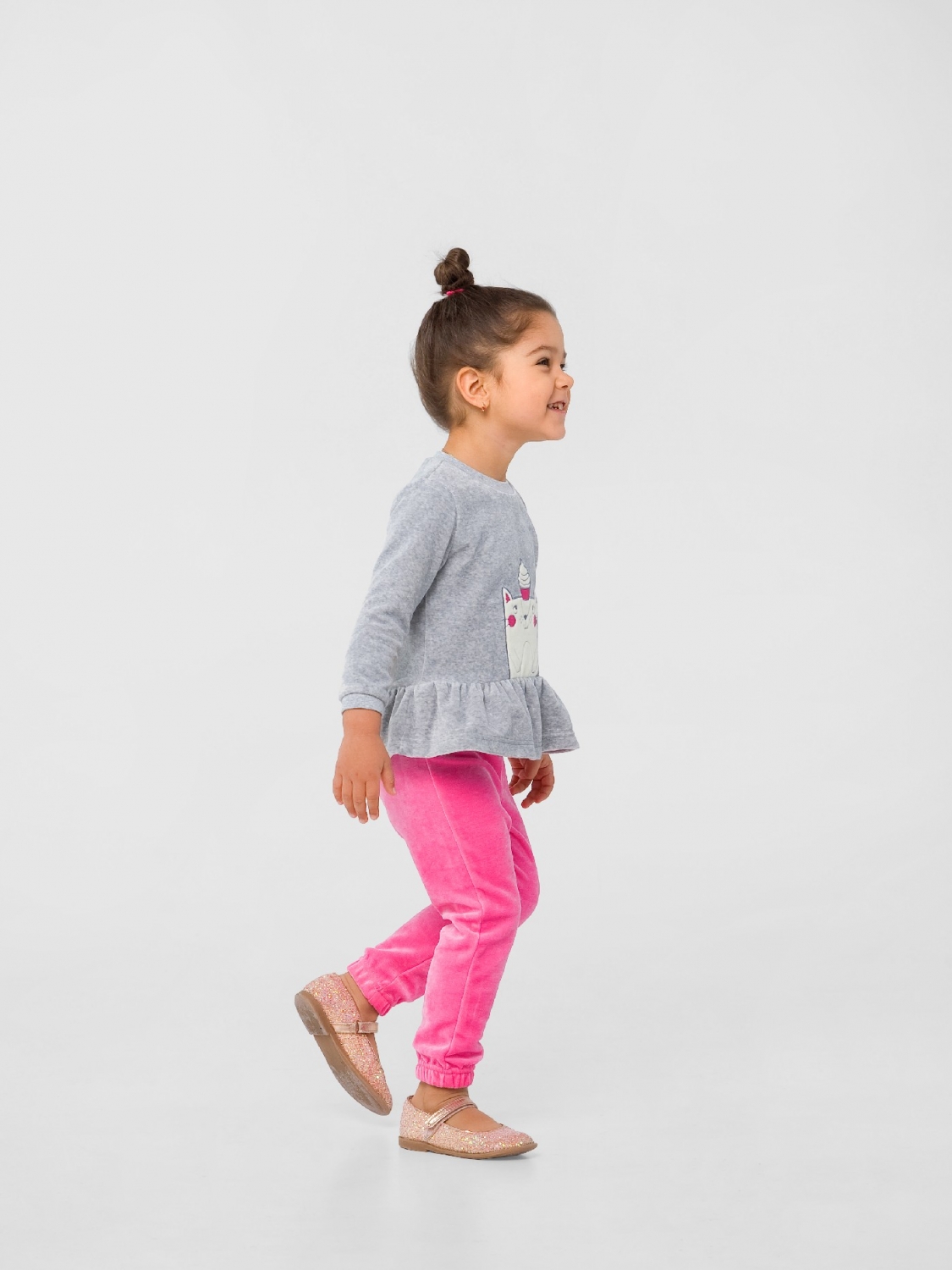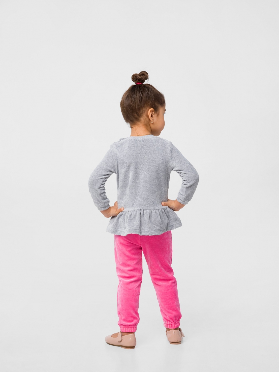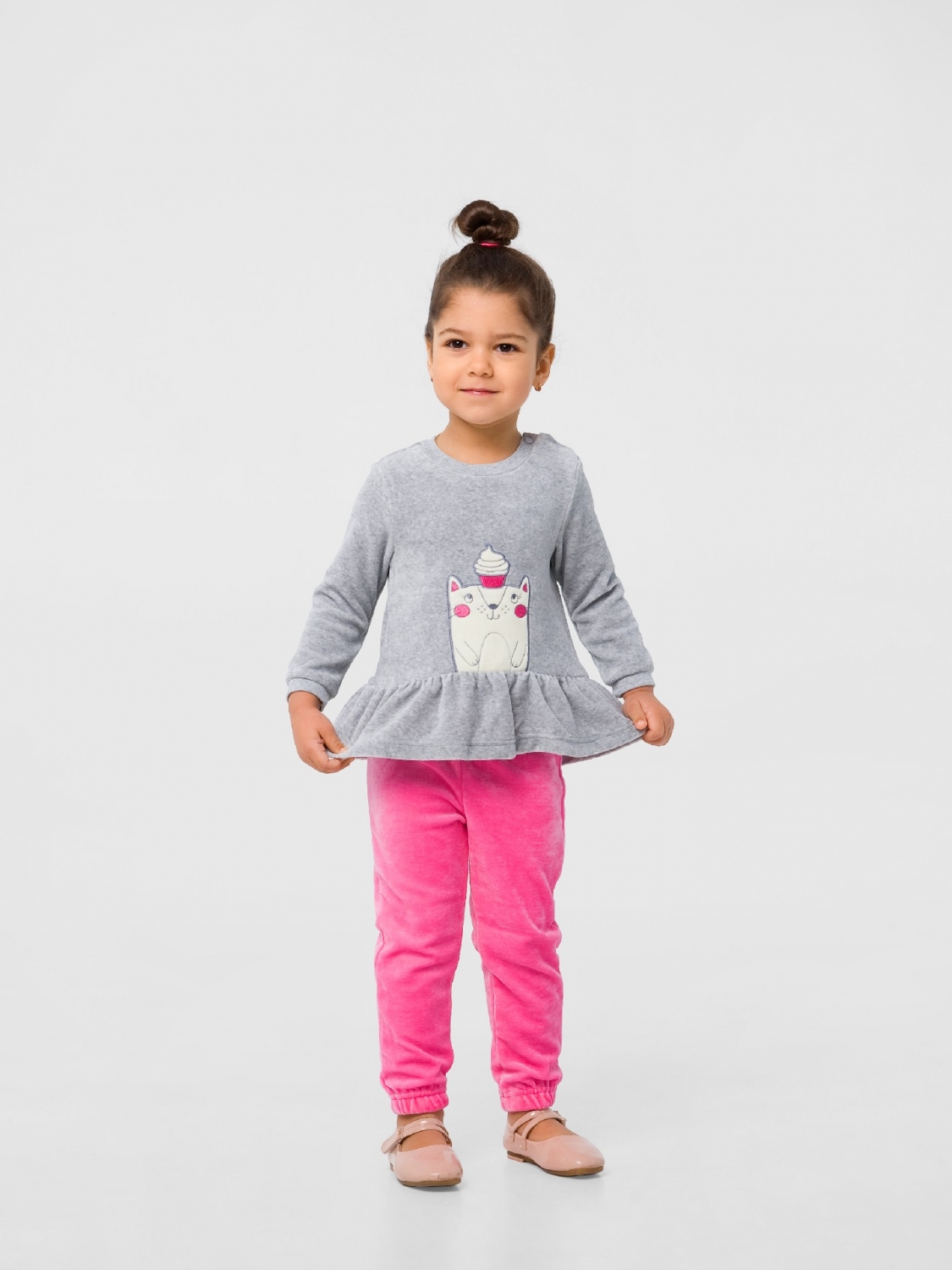 Мягкая, удобная туника серого цвета понравится любой малышке, потому что ее можно носить каждый день – в детский сад, на прогулки. Для пошива этого изделия использовался мягкий, приятный к телу велюр, который не вызывает аллергию или раздражение. Данная модель рассчитана на девочек в возрасте от двух до шести лет. Туника с длинными рукавами декорирована аппликативной вышивкой в виде котика и баской. Модель застегивается на кнопку, расположенную на плечике. Носить изделие можно вместе с лосинами, брюками