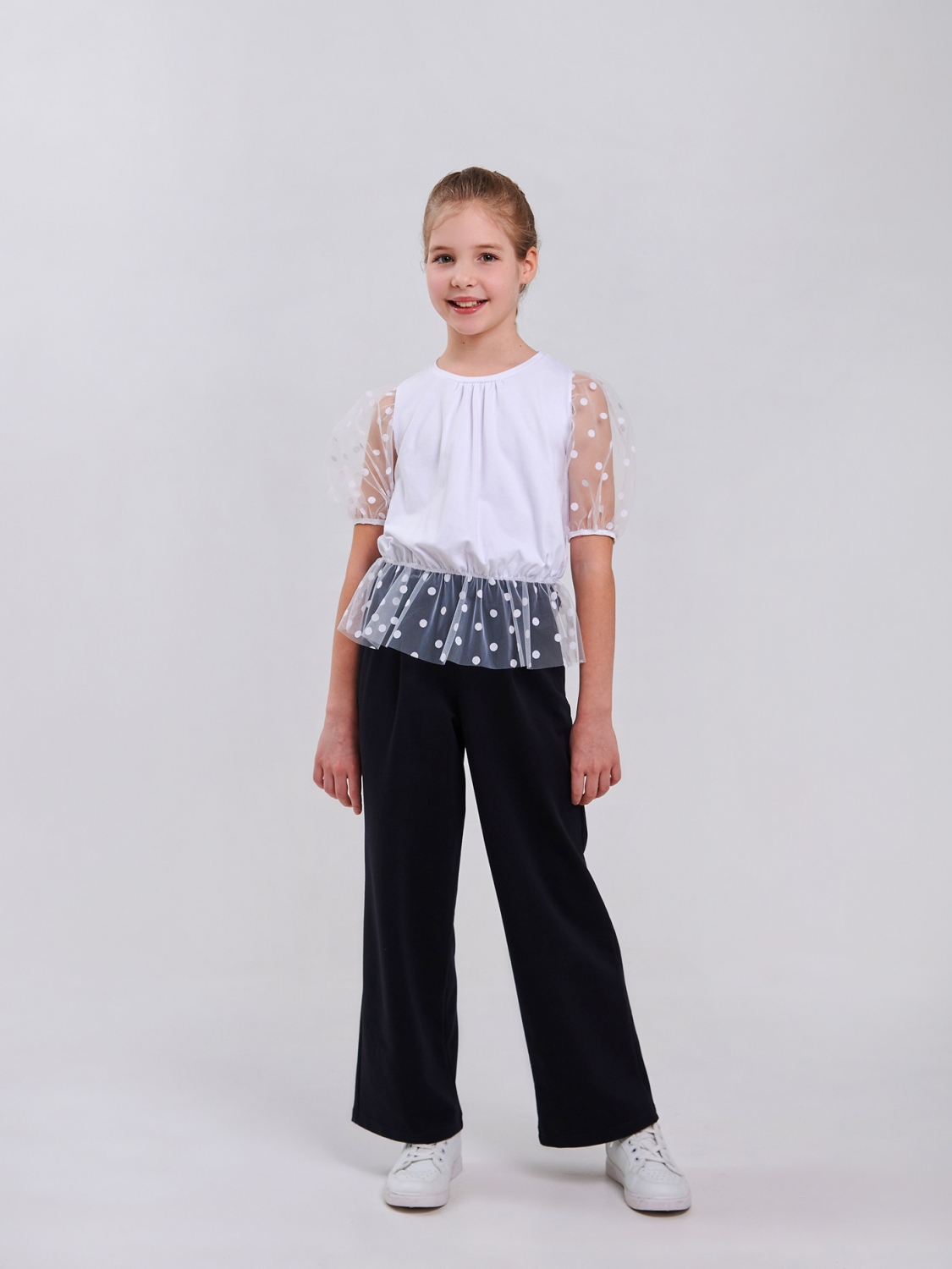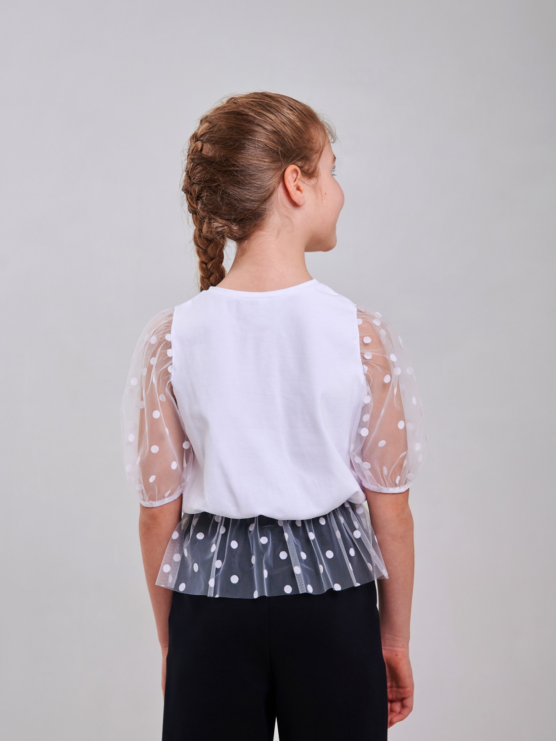 Очаровательная блузка для девочки – идеальный выбор для маленькой модницы! Стрейчевый кулир – мягкость, комфорт и свобода движений. Нежная сетка в горошек – изысканный акцент для стильного образа. Короткий рукав - идеален для тёплых дней и ярких впечатлений! Пусть ваша девочка сияет каждый день!
