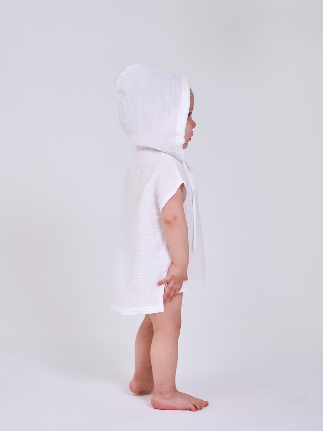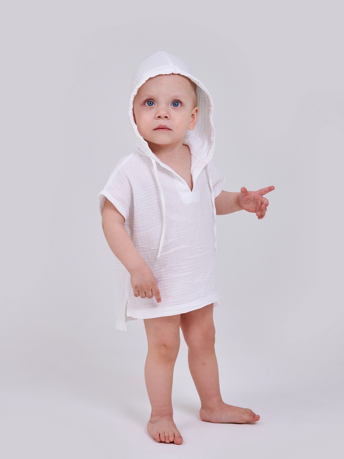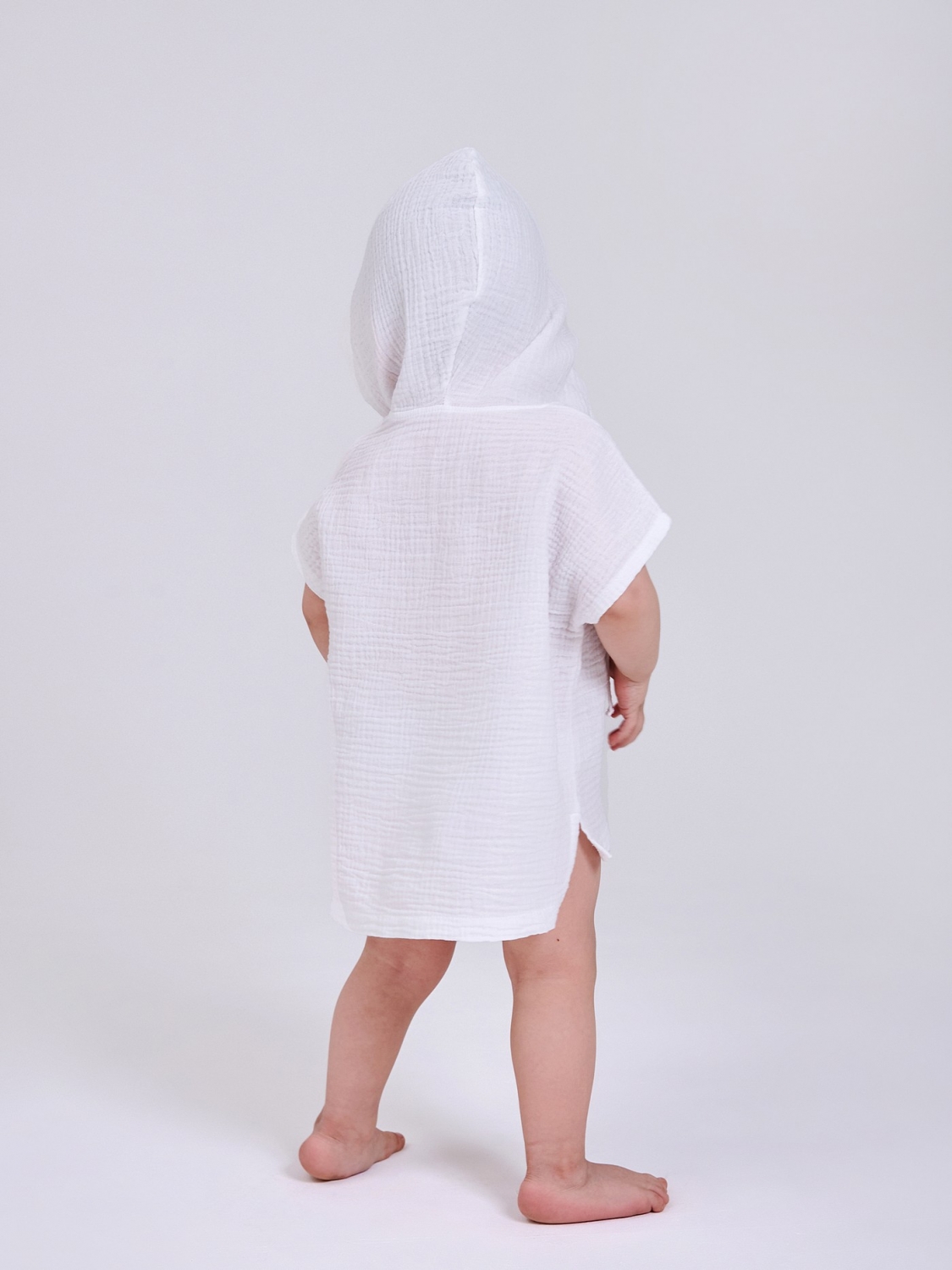 Стильная и лёгкая туника из муслина — отличный выбор для прогулок, отдыха и защиты от солнца в летние дни. Модель свободного кроя с капюшоном сочетает в себе комфорт, воздухопроницаемость и функциональность. Идеальна как на пляж, так и для повседневной носки.