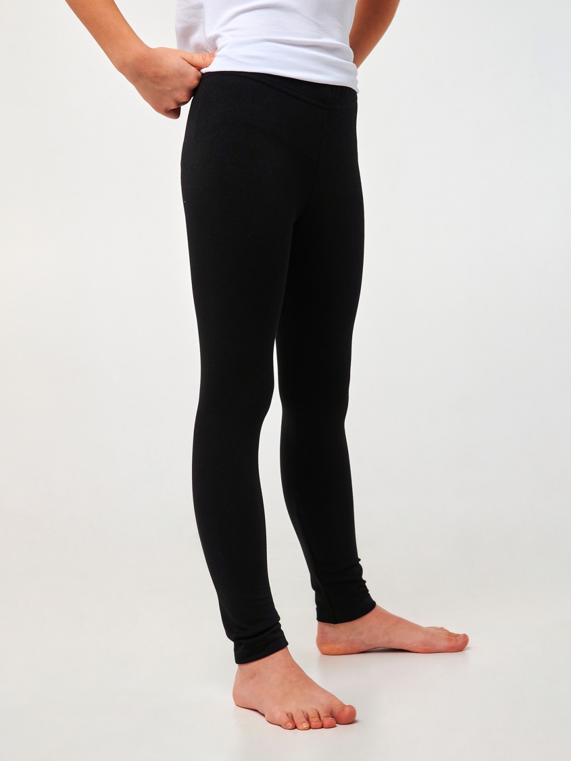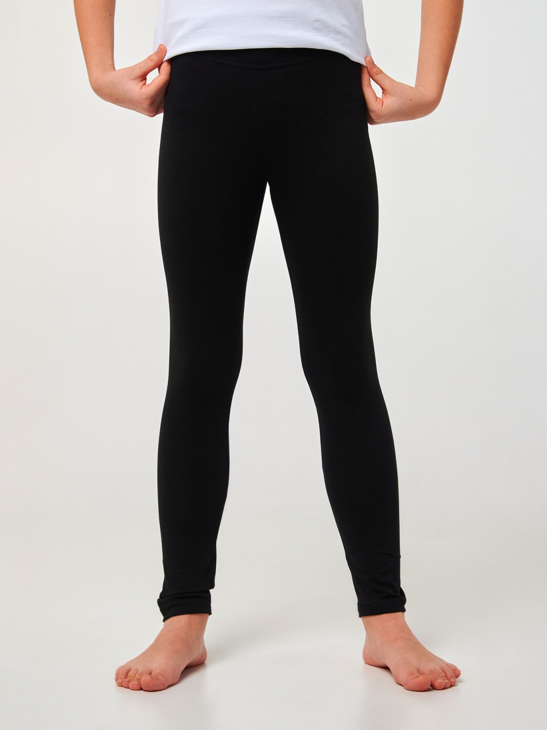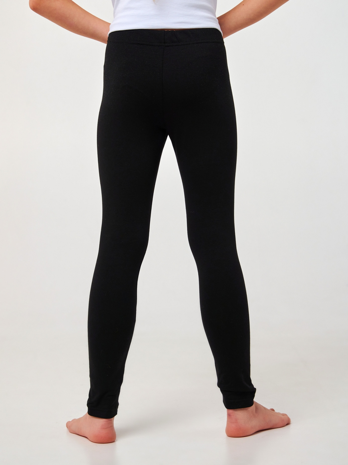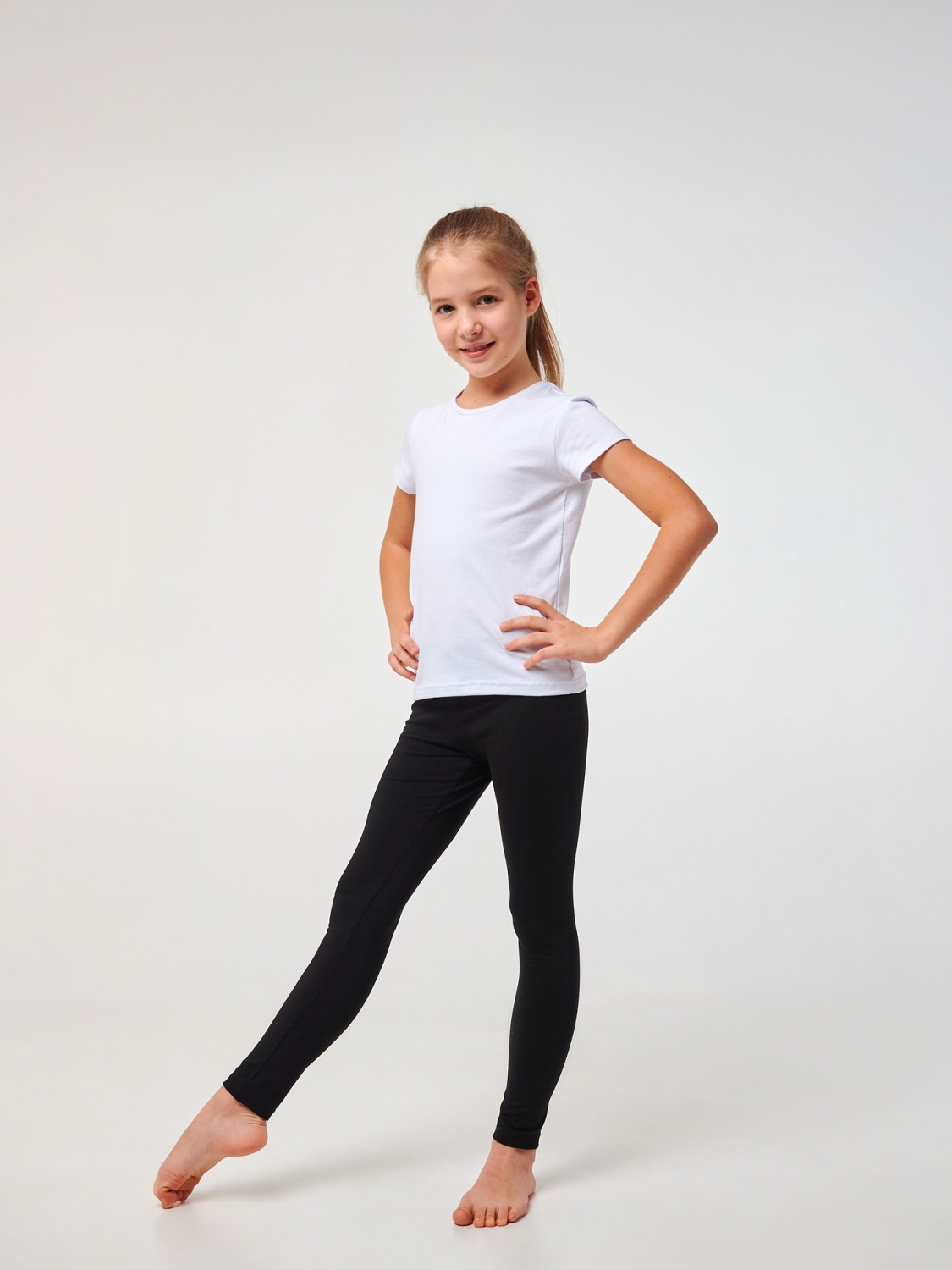 Спортивные лосины для девочек из мягкого и эластичного стрейч-кулира. Практичный черный цвет и удобный крой делают их идеальным выбором для активных занятий спортом, танцев или повседневной носки.