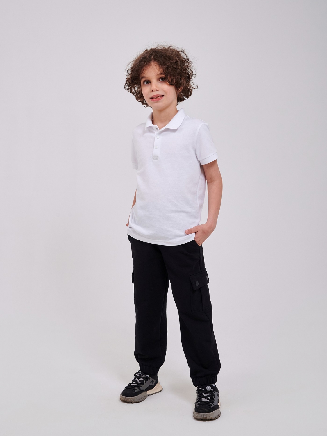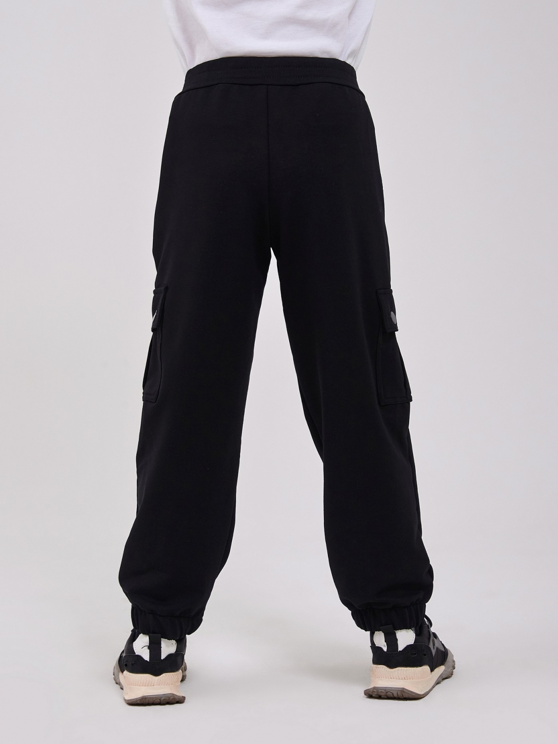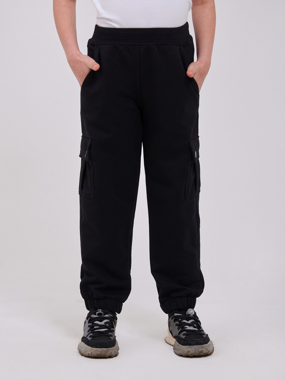 Чёрные брюки для мальчика с удобной посадкой и накладными карманами — идеальный вариант для активных мальчишек. Мягкий стрейчевый футер дарит свободу движений, а манжеты по низу создают аккуратный силуэт.