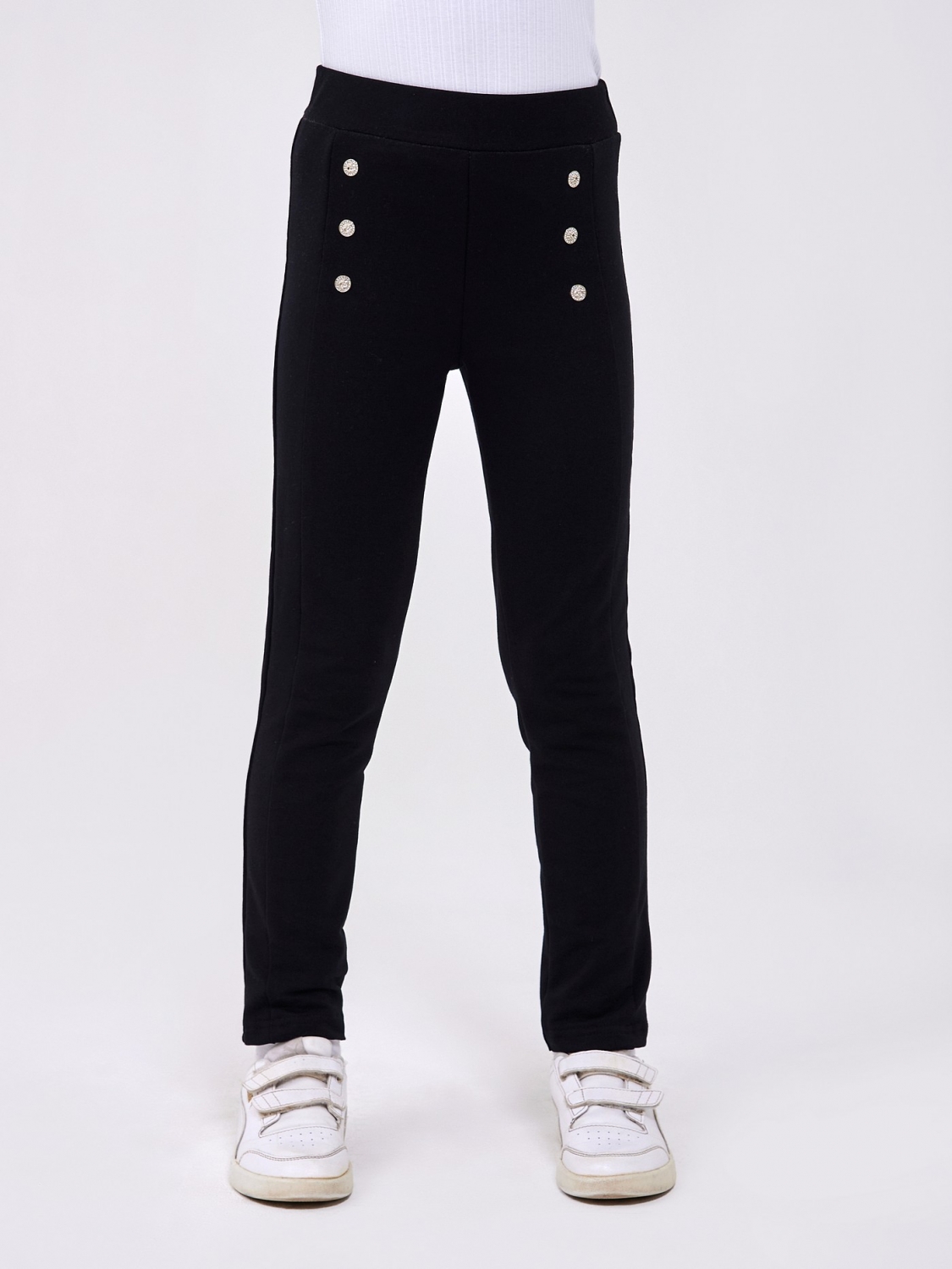 Черные брюки для девочки с декоративными хольятенами. Удобный пояс на резинке, мягкое стрейчевое полотно для ежедневного комфорта. Идеально подойдут для школы, мероприятий и прогулок — легко сочетаются с блузками, гольфами и джемперами.