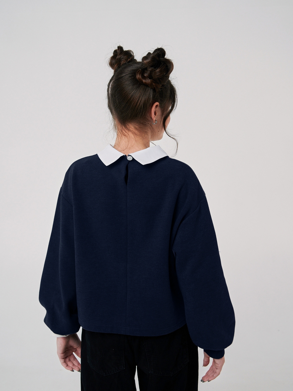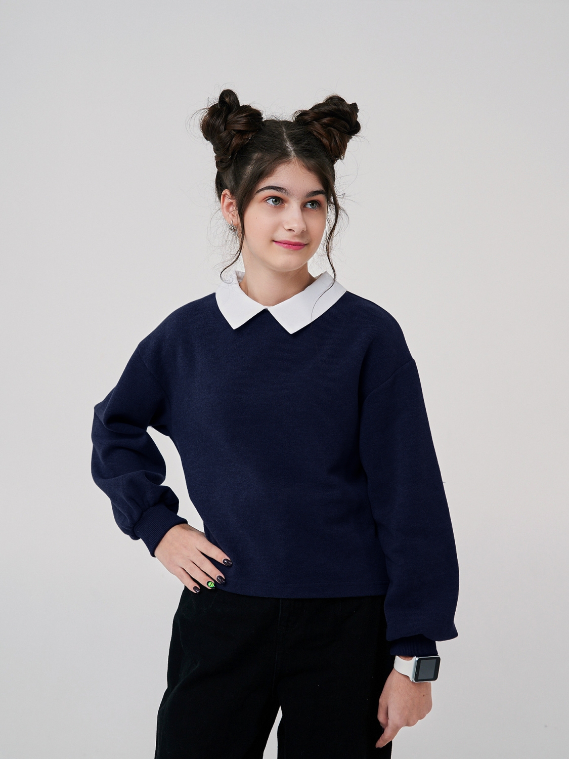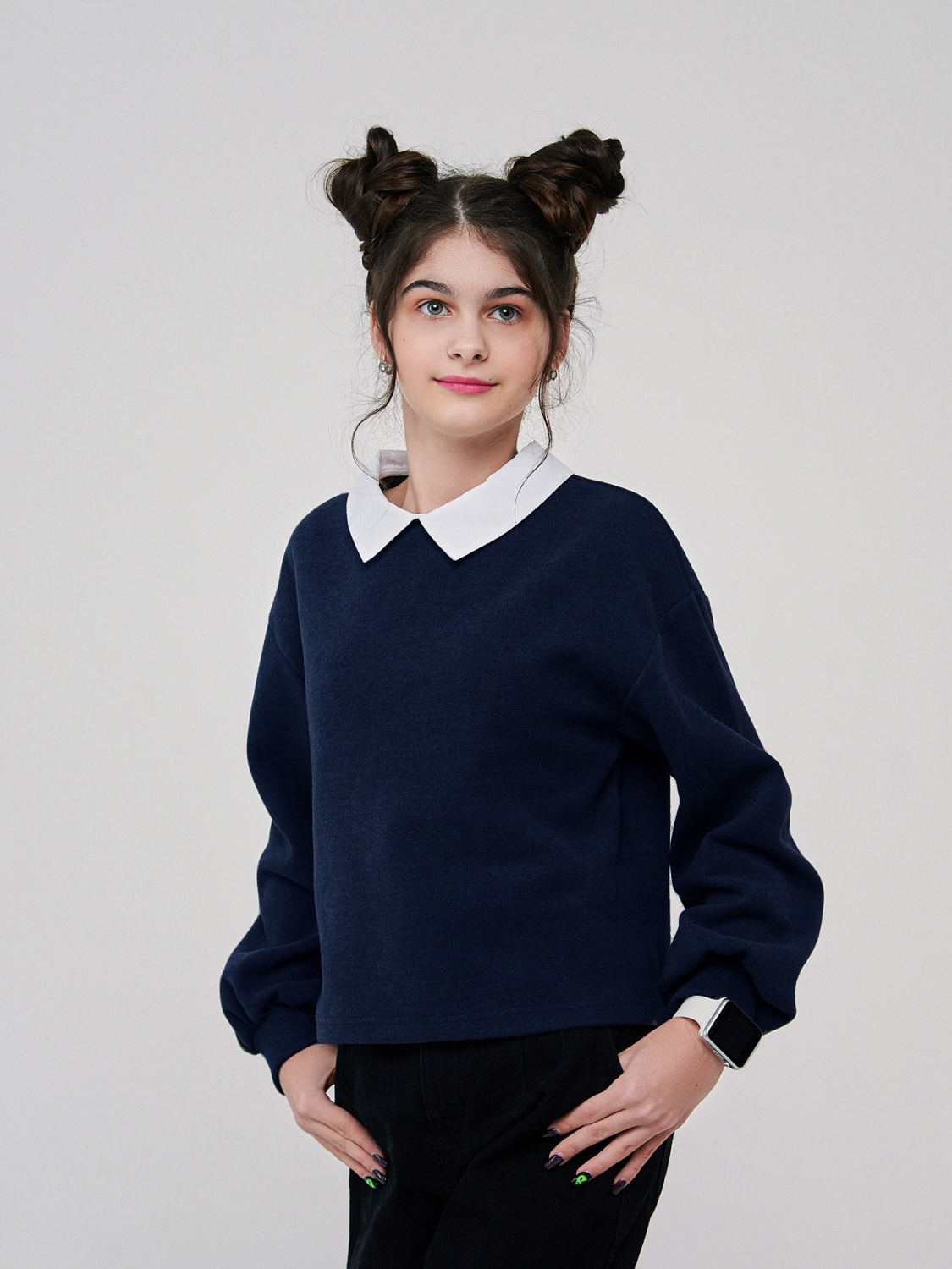 Стиль и комфорт объединились в нашем новом свитшоте для девочек. Он пошит из теплого полотна селяник, обеспечивающего невероятную мягкость и уют. Идеальный вариант для холодных осенних и зимних дней. Темно-синий цвет добавляет элегантности и подчеркивает индивидуальность вашей маленькой модницы. Особая изюминка этого свитшота - тканевый воротник, который придает ему неповторимость и шарм. Этот акцент позволяет свитшоту выделяться среди прочих, делая его идеальным выбором для особых случаев и повседневной носки. Оригинальные рукава добавляют свежего воздуха в дизайн этого свитшота.