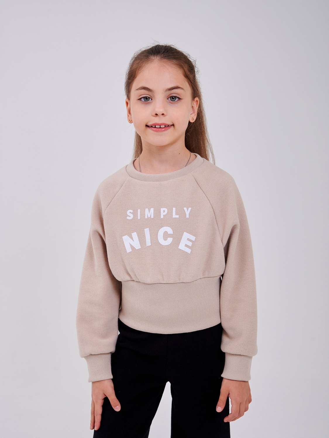 Мягкий и стильный свитшот из полотна селянка — идеальный выбор для активных и модных девочек. Приятный бежевый оттенок, объемный крой и акцентная надпись делают образ уютным и современным. Плотные манжеты, эластичная резинка на поясе и натуральный состав обеспечат комфорт на весь день — в школе, на прогулке или в гостях.