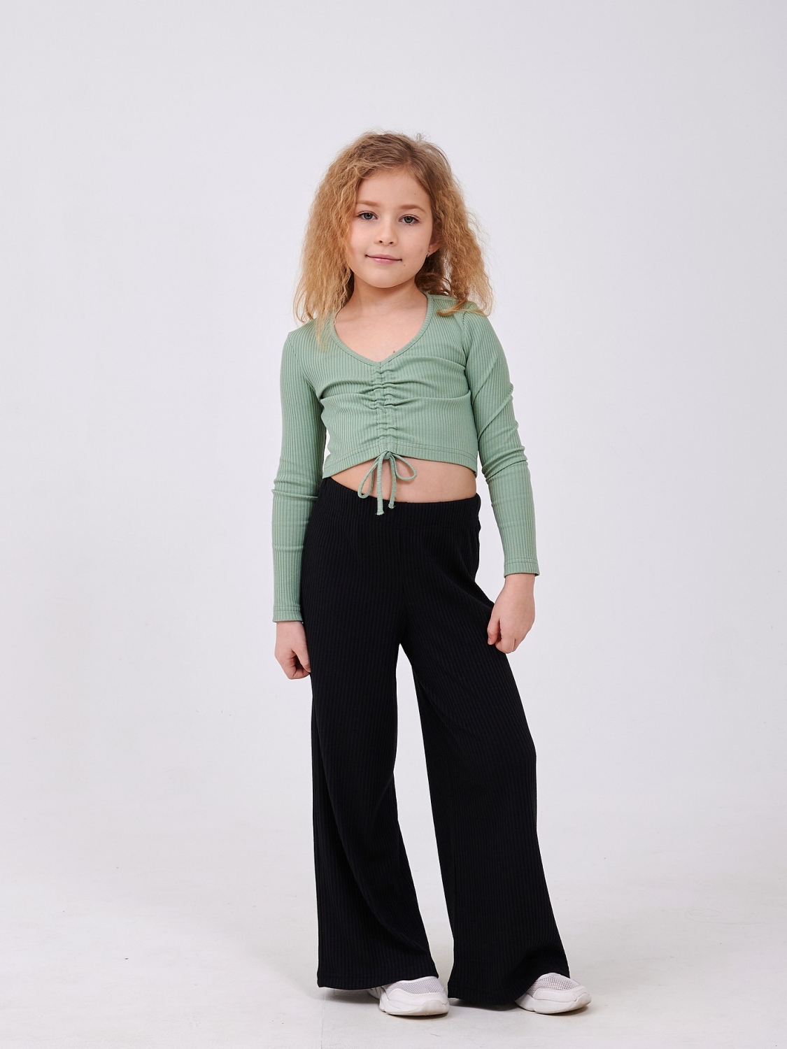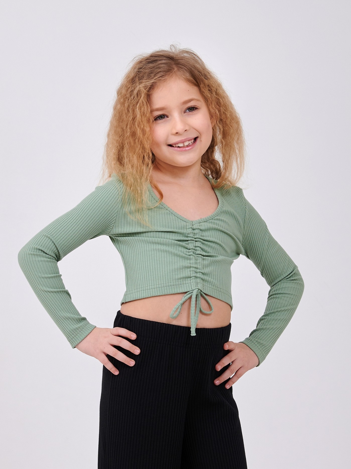 Топ для девочки с длинным рукавом из рубчика — стильная и уютная модель, которая идеально садится по фигуре! Полотно рубчик мягкое, тянется и приятно ощущается на коже, а затяжка спереди добавляет модный акцент и делает топ особенно интересным. Отлично подходит как для повседневных образов, так и для прогулок и встреч с друзьями.
