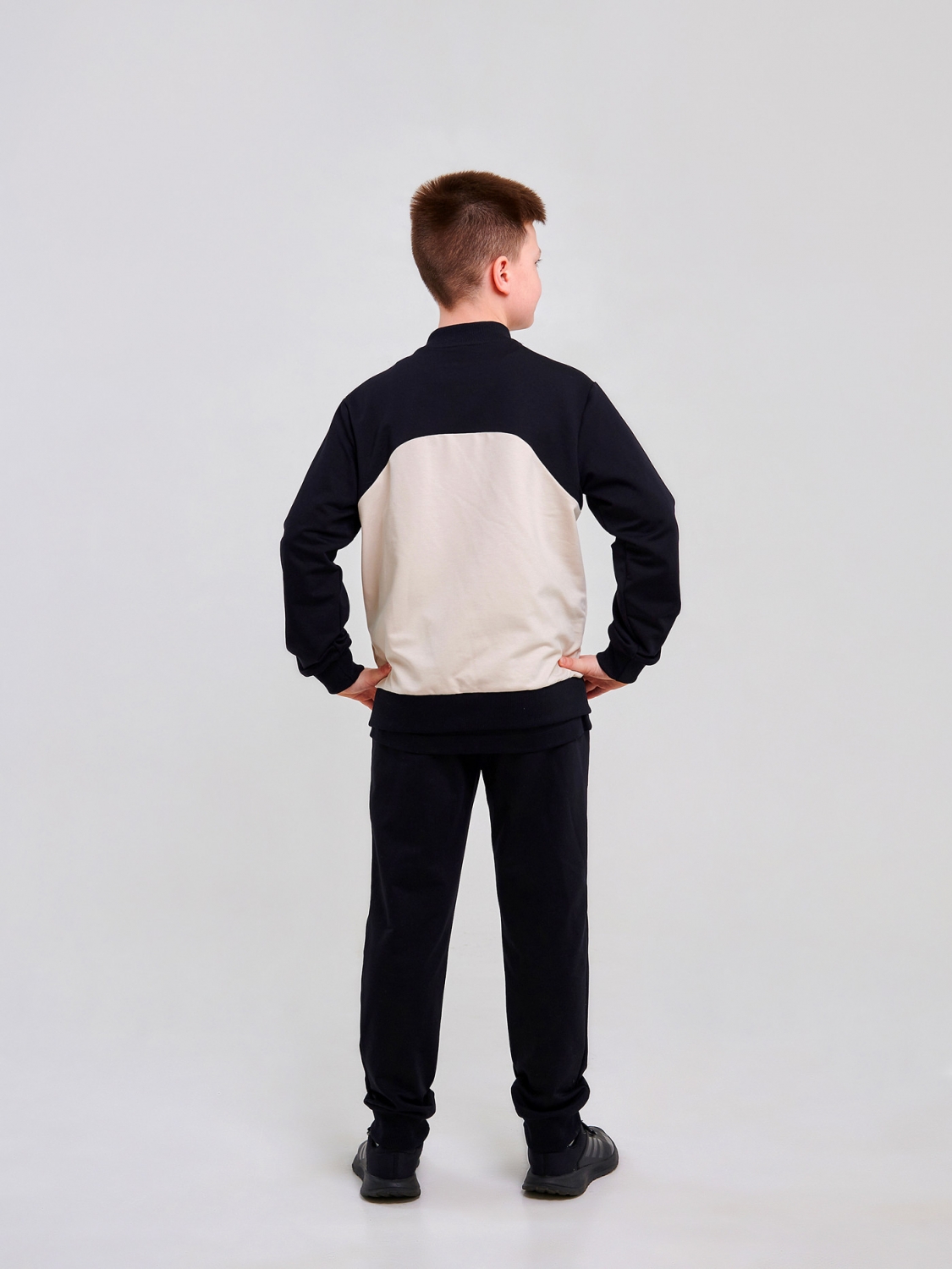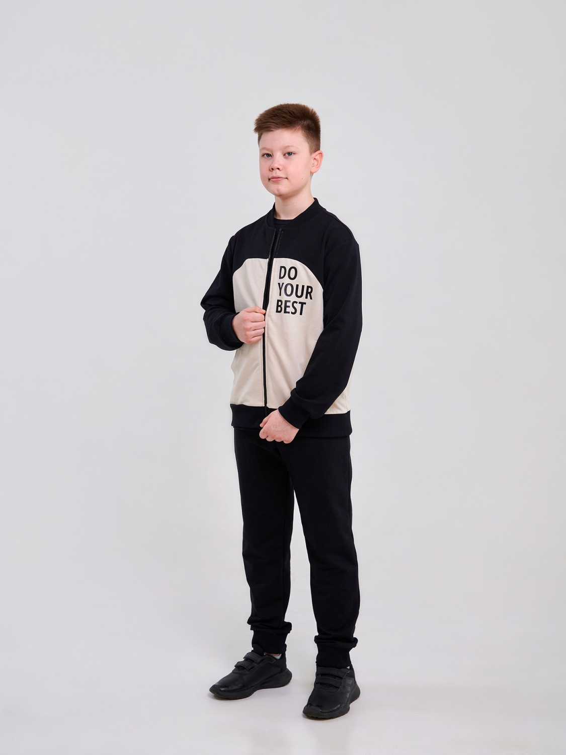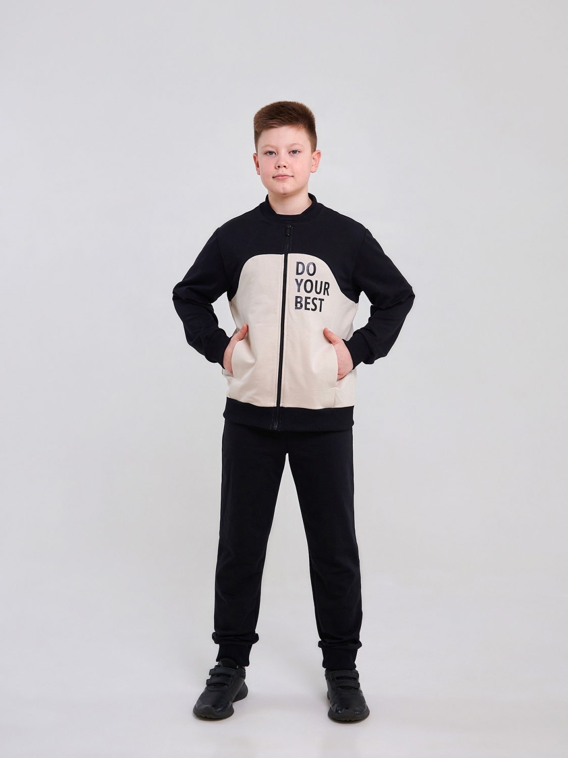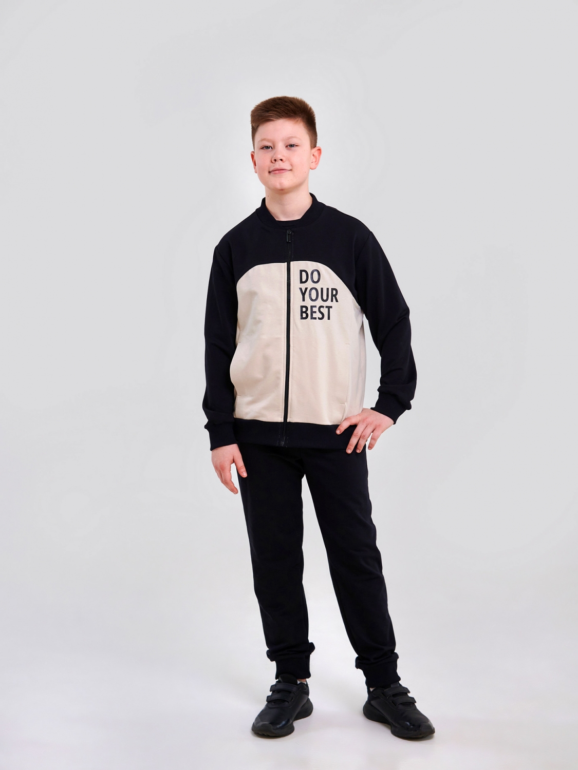 Стильный и удобный спортивный костюм для мальчика в черном цвете с бежевыми вставками! Куртка на молнии с воротником-стойкой и карманами создаст образ маленького чемпиона. Брюки со шнурком на поясе обеспечат идеальную посадку и комфорт. Пошитый из стрейчевого футера, костюм дарит свободу движений и уют. Наклейка "Do Your Best" станет дополнительной мотивацией для вашего маленького спортсмена!