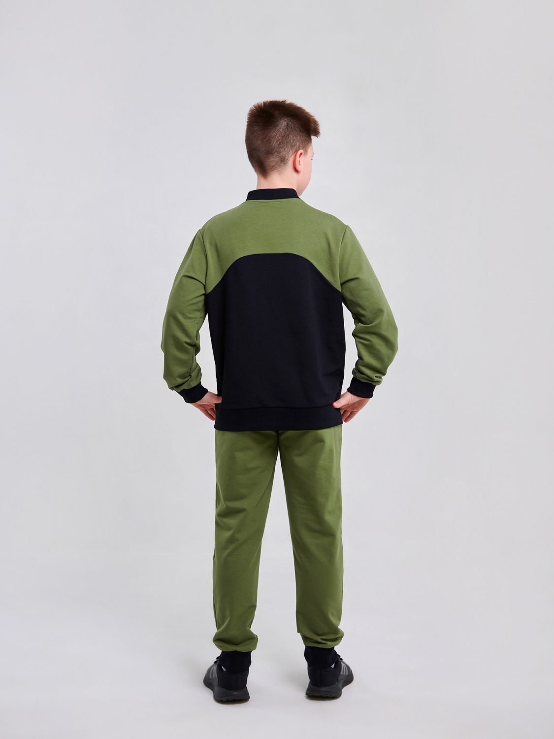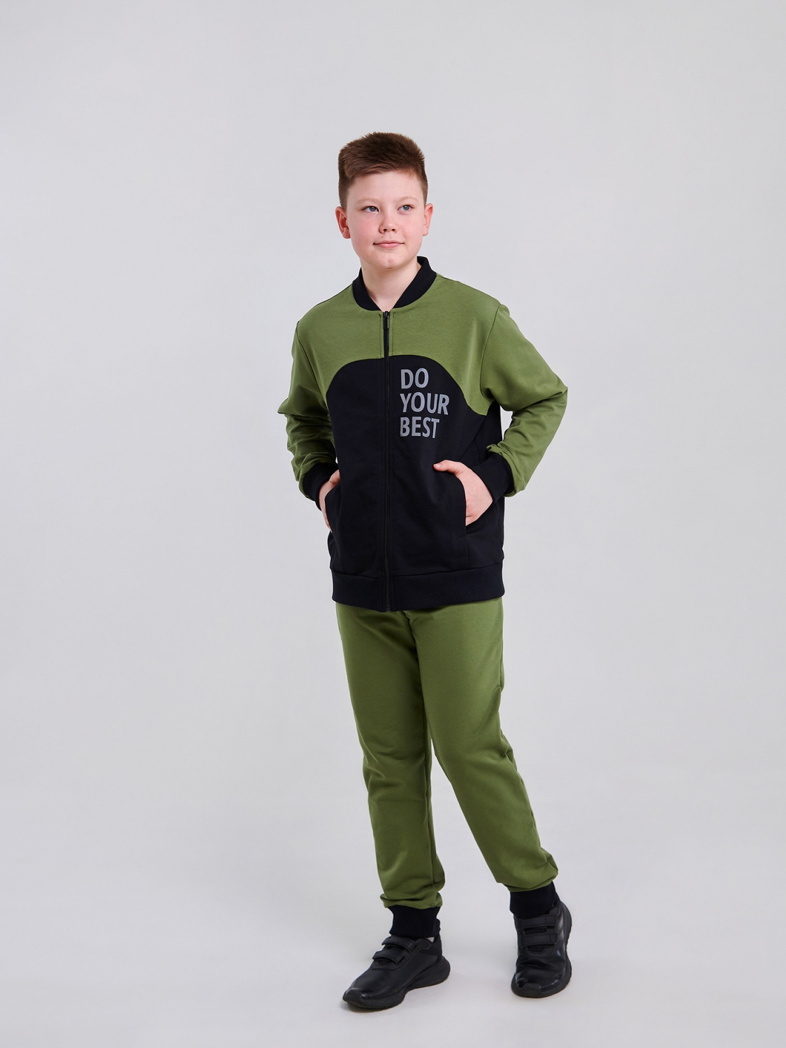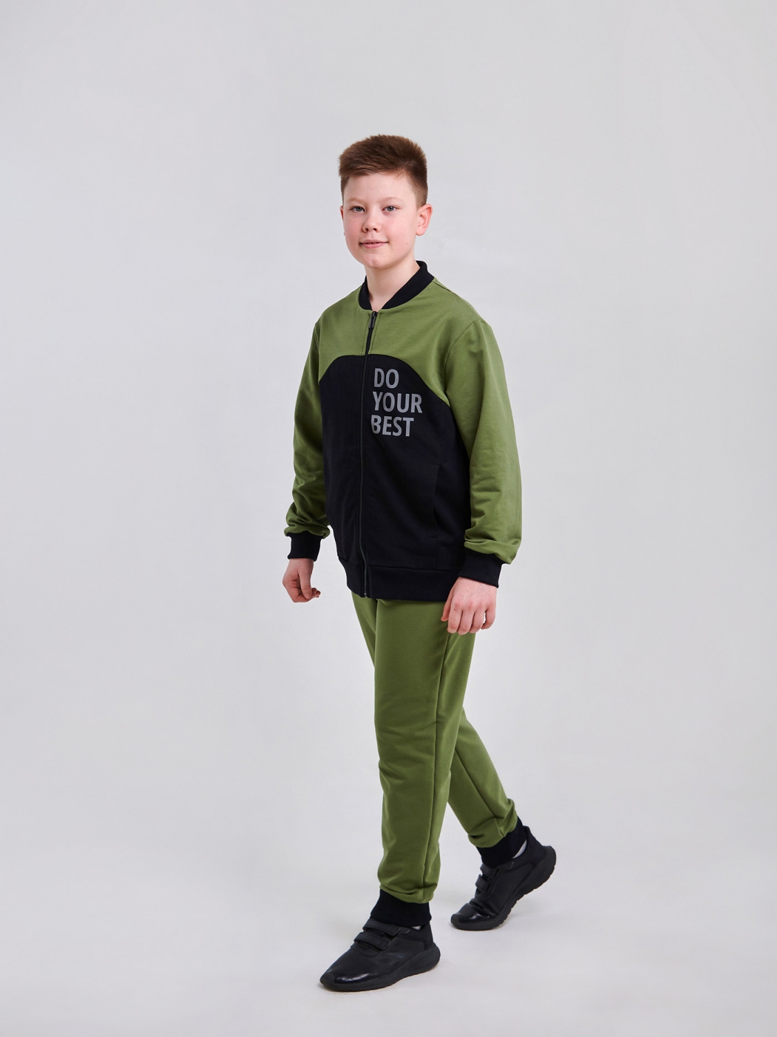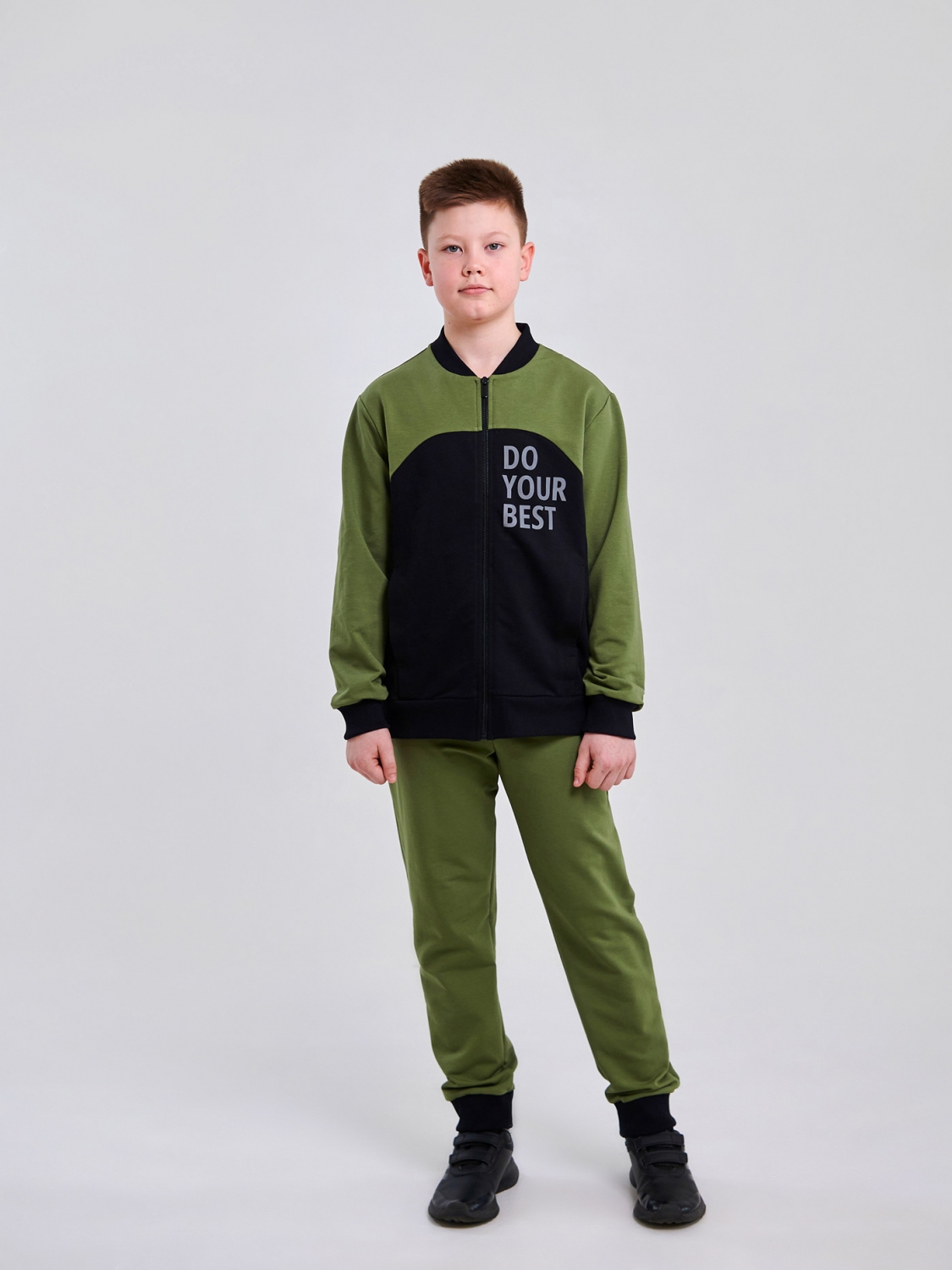 Познакомьте своего мальчика с идеальным спортивным костюмом в цвете хаки с черным! Этот костюм включает куртку с молнией, воротником-стойкой и удобными карманами, а также брюки с шнурком на поясе для идеальной посадки. Пошитый из стрейчевого футера, он обеспечивает максимальный комфорт и свободу движений. Наклейка "Do Your Best" добавляет мотивирующий акцент.